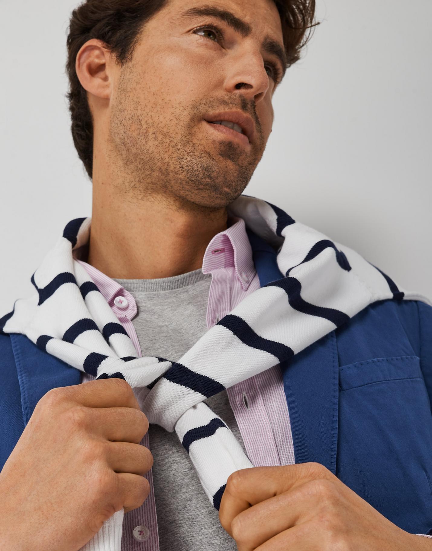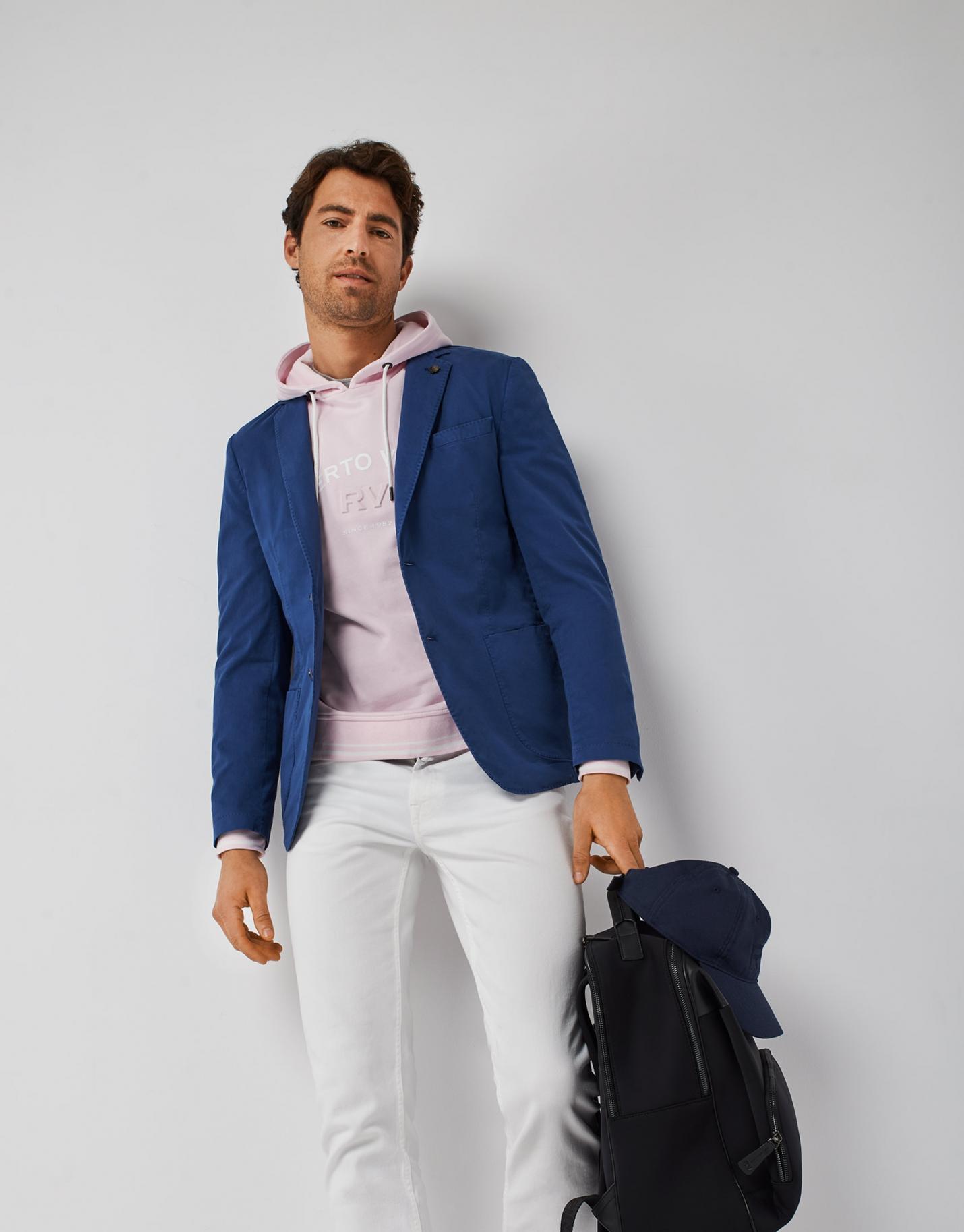 Americana desestructurada confeccionada en un tejido de algodón con toque elástico color azul oscuro. Cierre con dos botones, dos bolsillos de parche, uno insertado en pecho y aberturas en espalda.