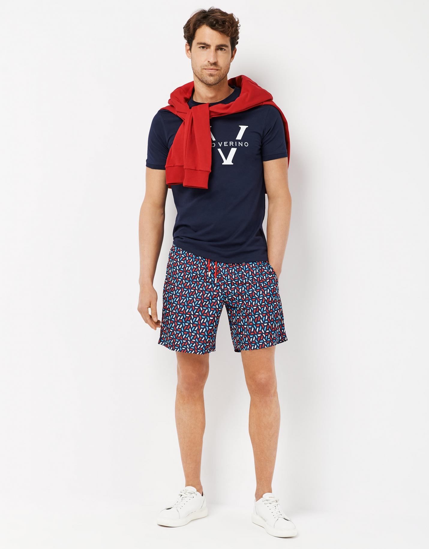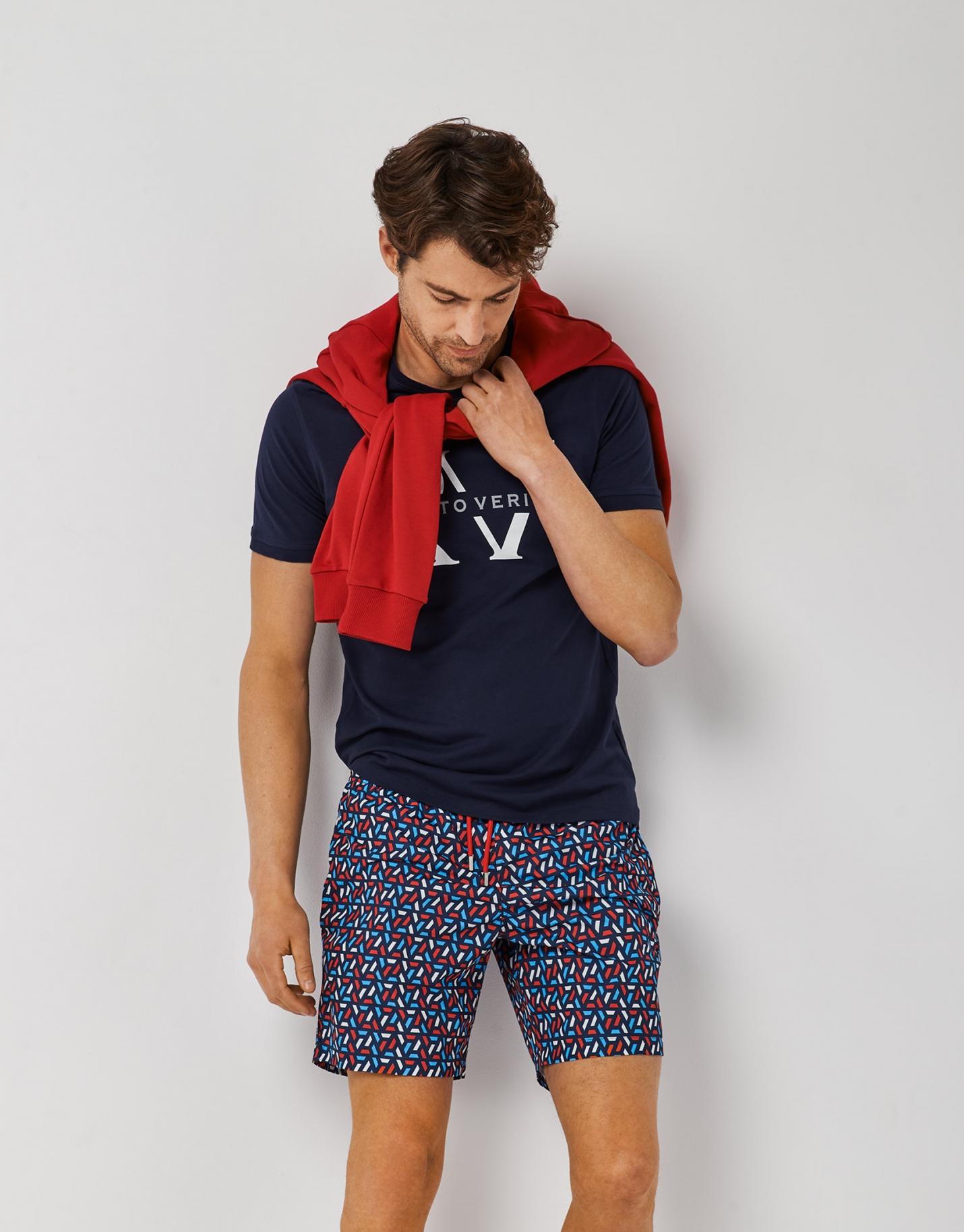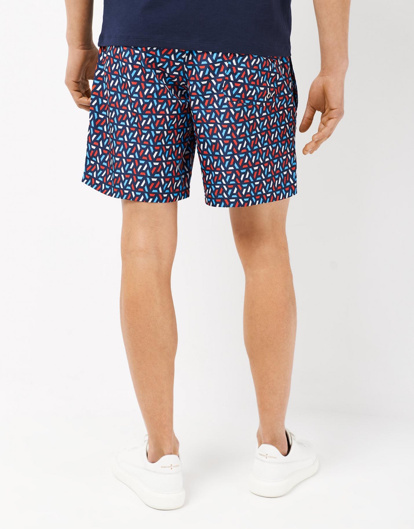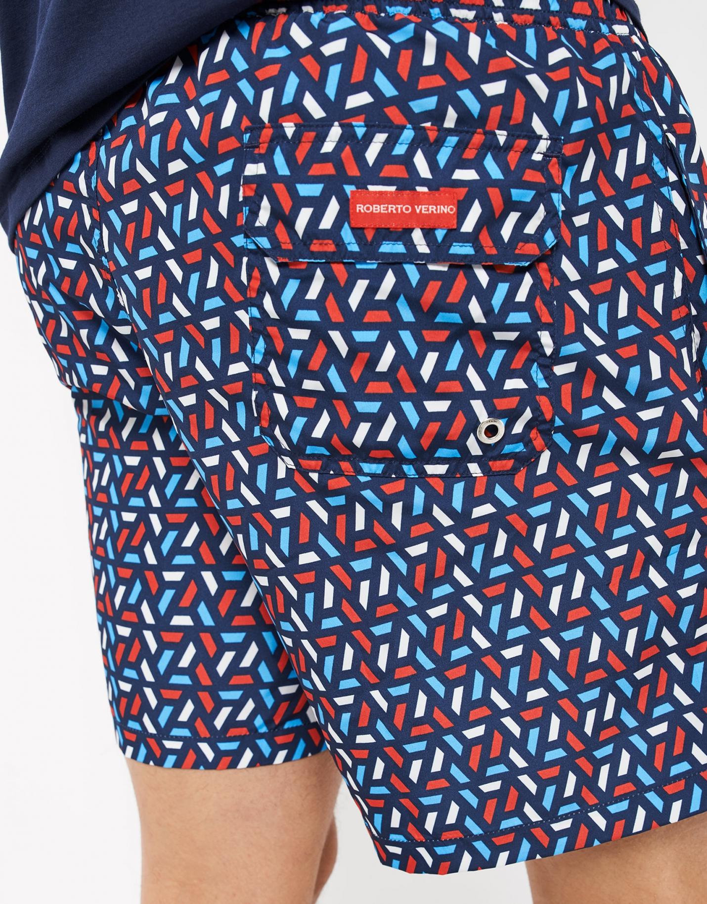 Bañador confeccionado en un tejido secado rápido con motivos geométricos en azul marino, rojo, blanco y turquesa. Bolsillos laterales, cintura elástica, ajustador de cordón y bolsillo trasero.