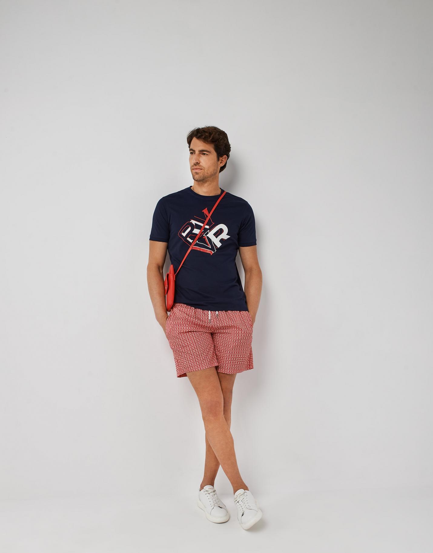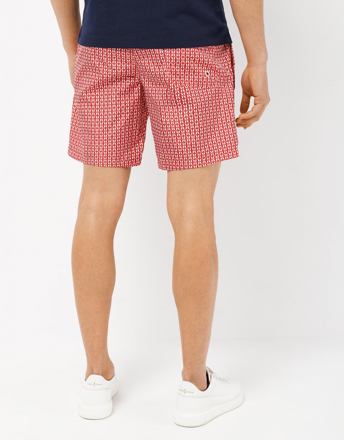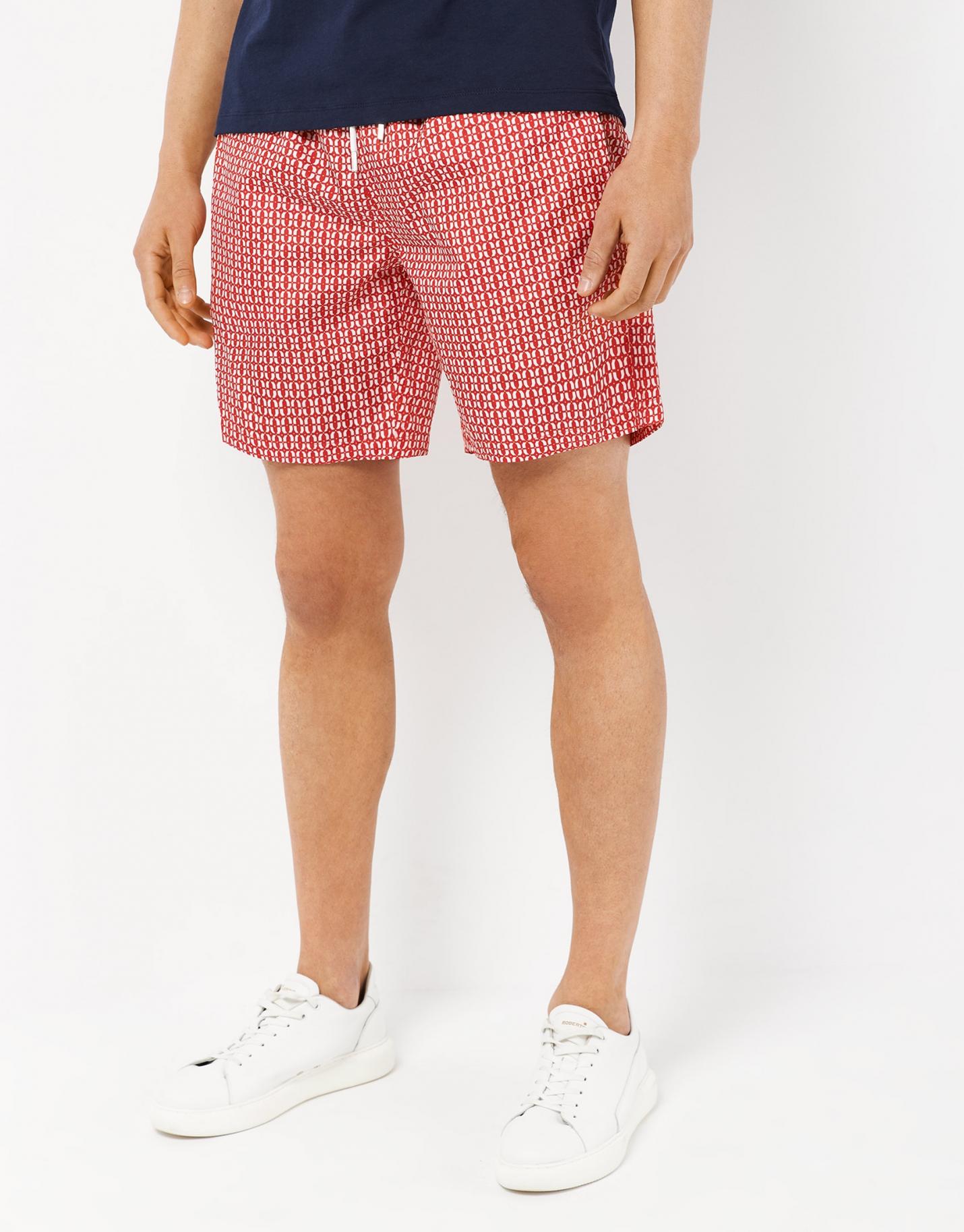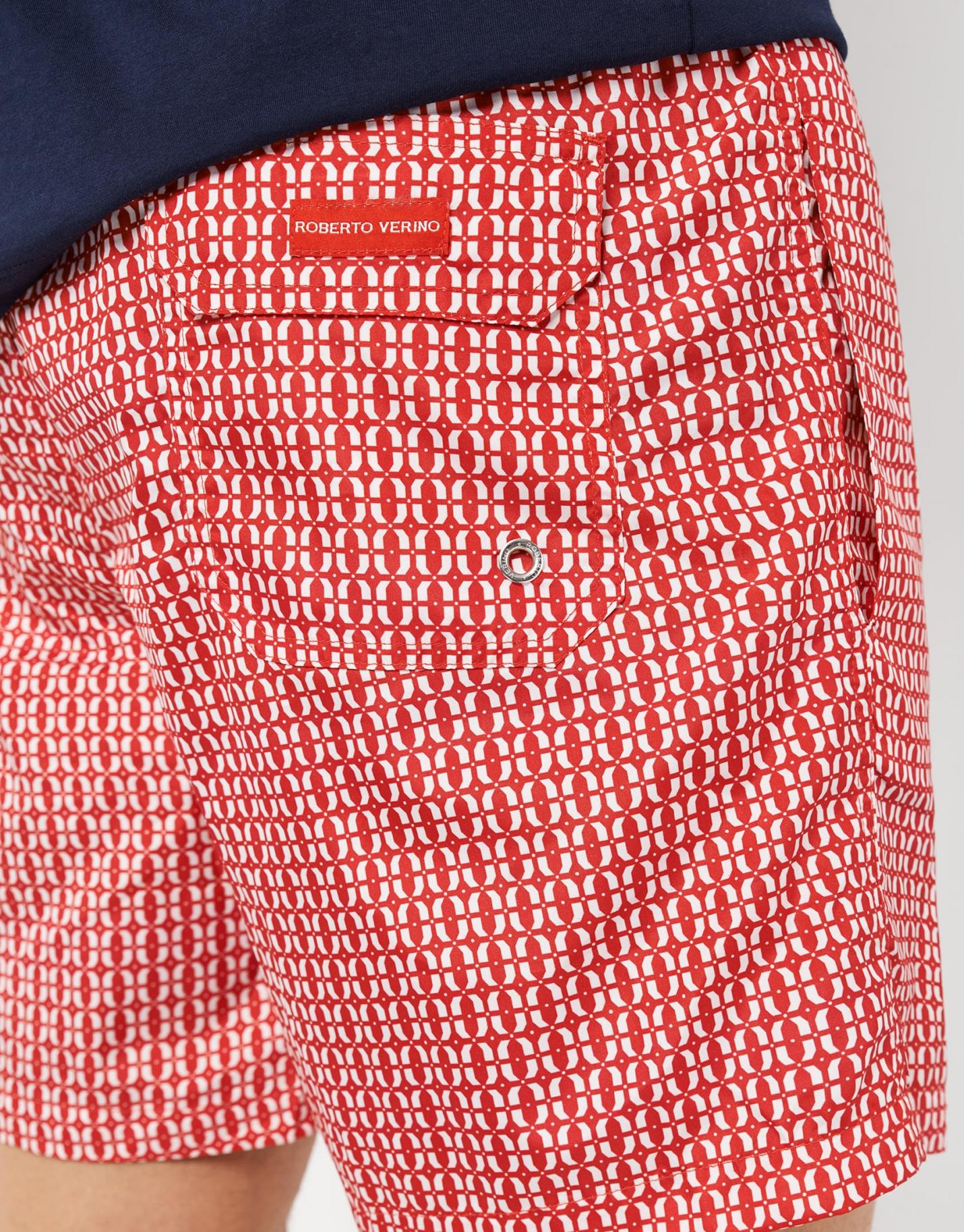 Bañador confeccionado en un tejido secado rápido con motivos geométricos en rojo y blanco.Bolsillos laterales, cintura elástica, ajustador de cordón y bolsillo trasero.
