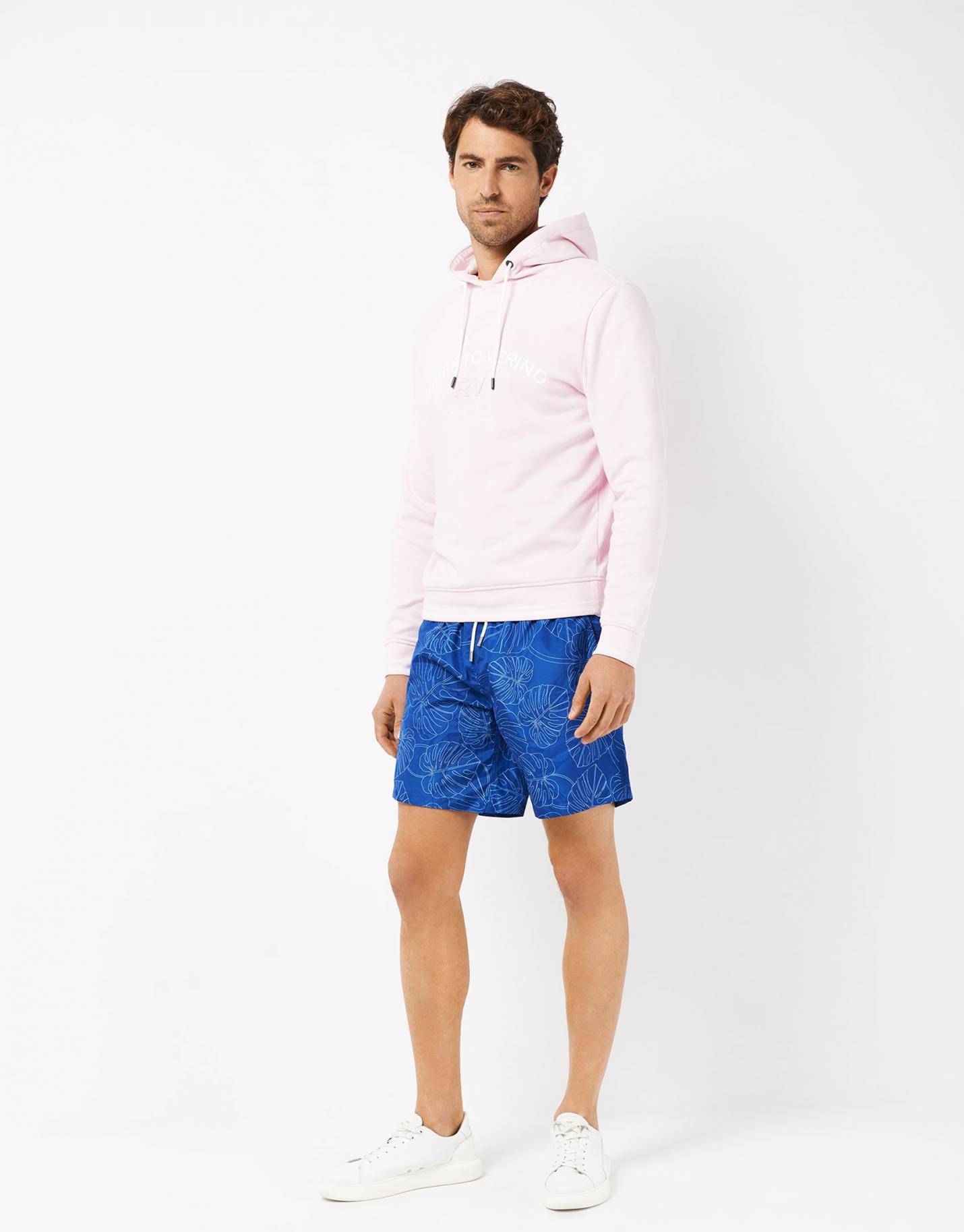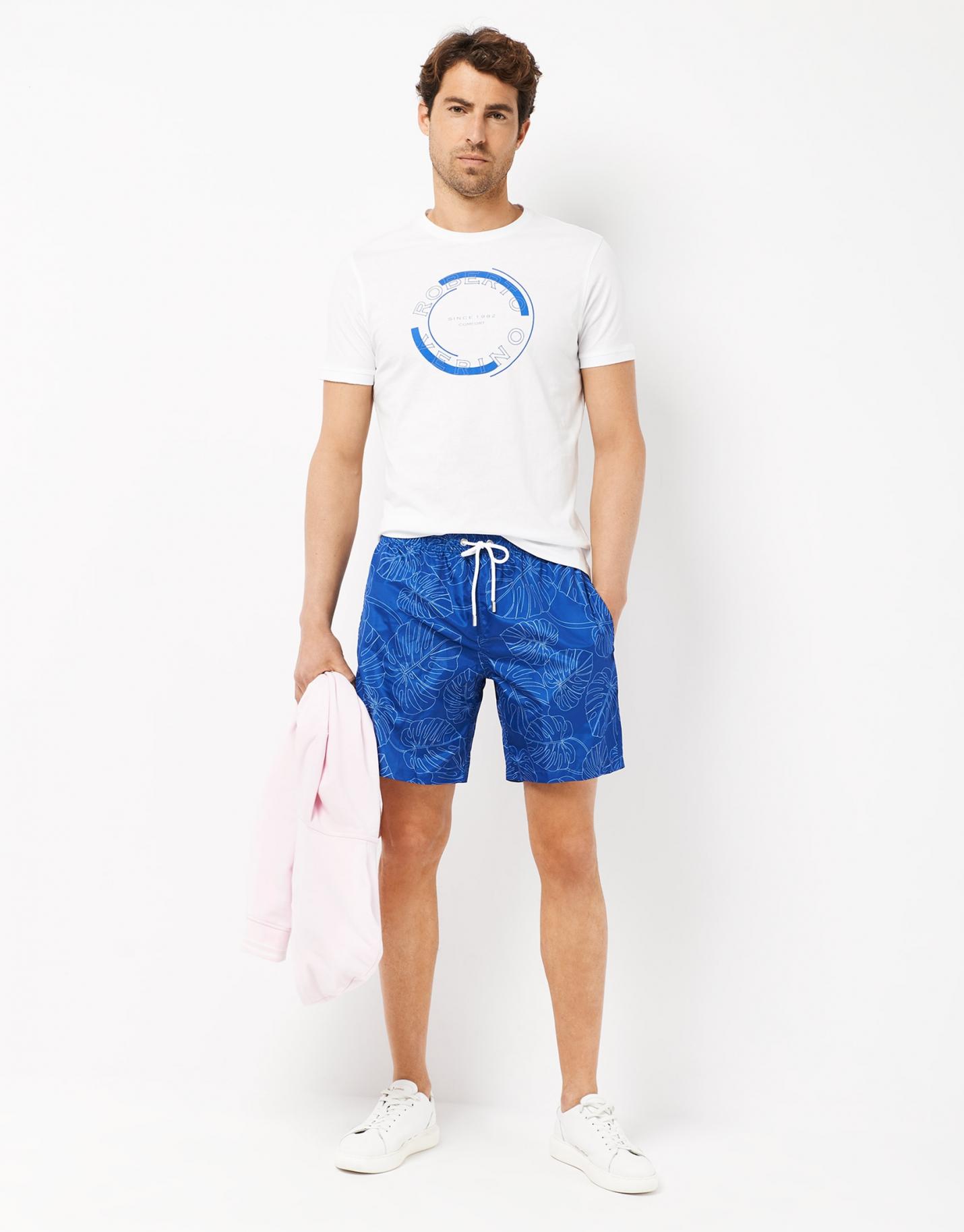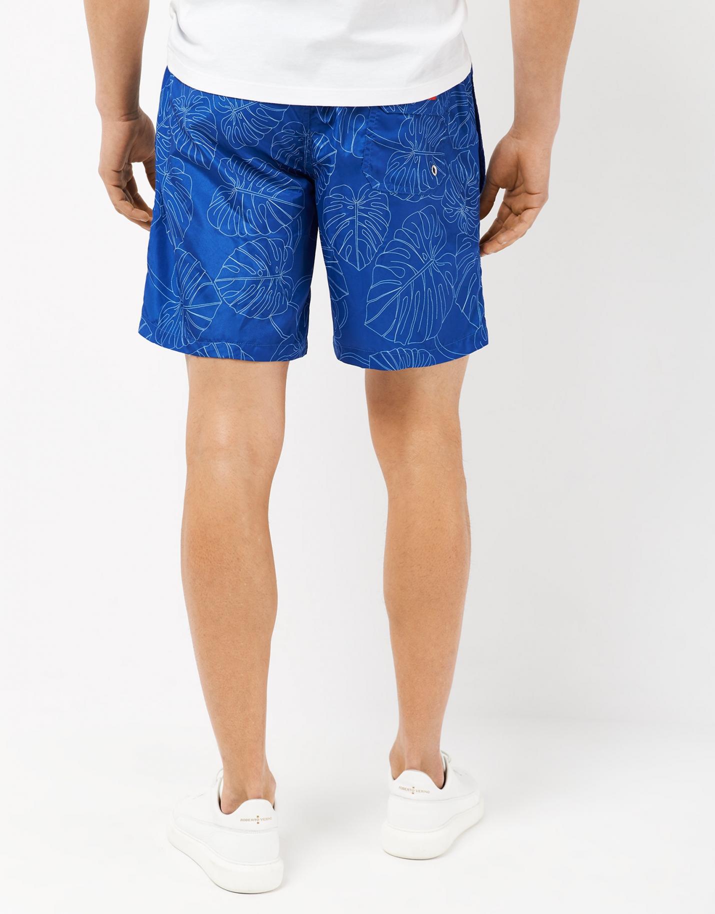 Bañador confeccionado en un tejido secado rápido color marino con motivo de hojas perfiladas color blanco. Bolsillos laterales, cintura elástica, ajustador de cordón y bolsillo trasero.