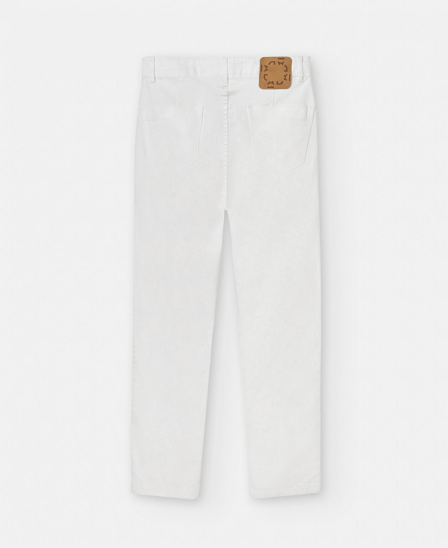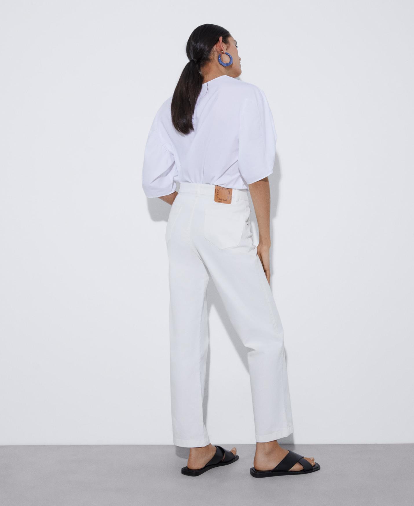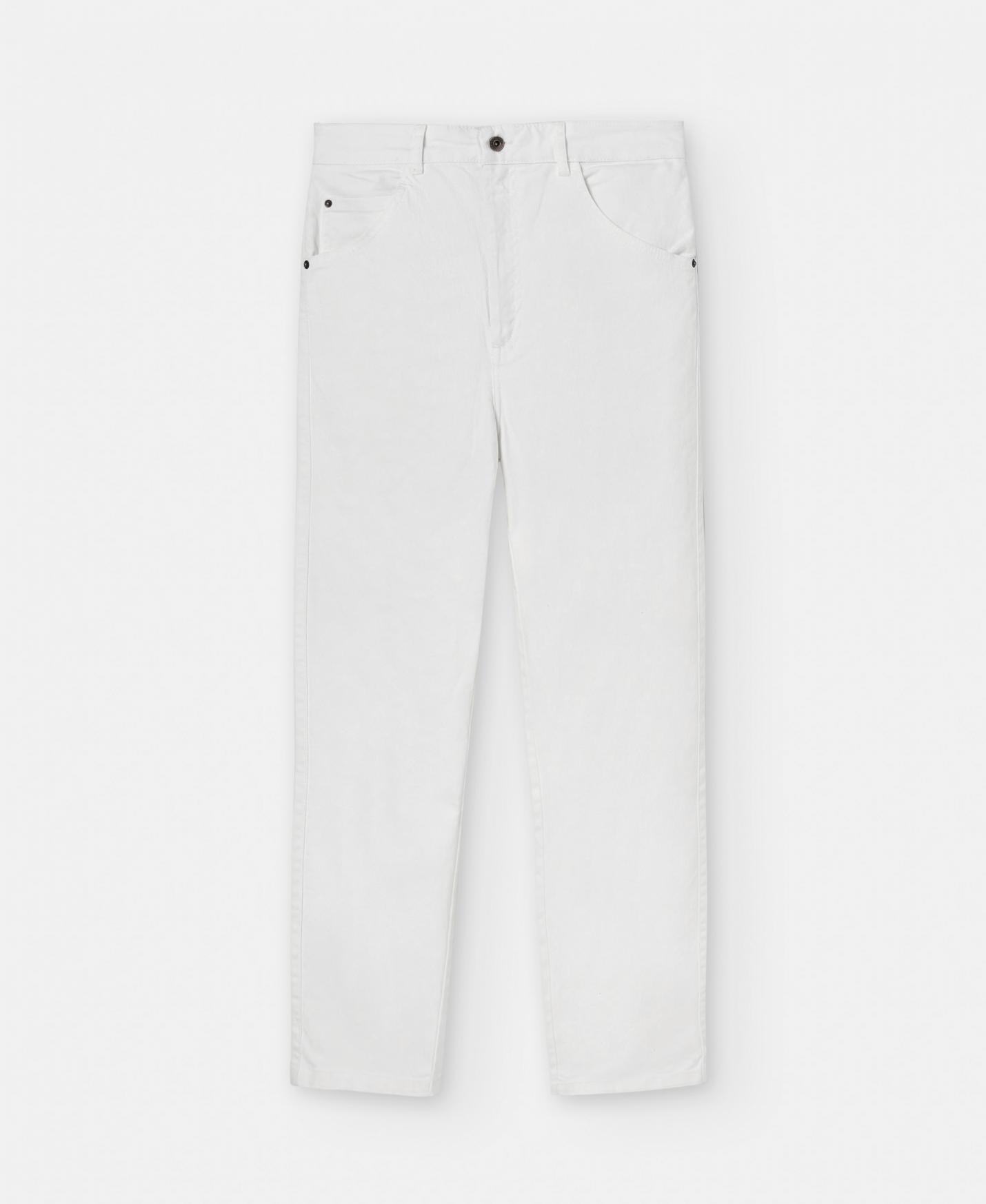 Pantalón recto cinco bolsillos en algodón orgánico. Largo tobillo y pespuntes a tono.