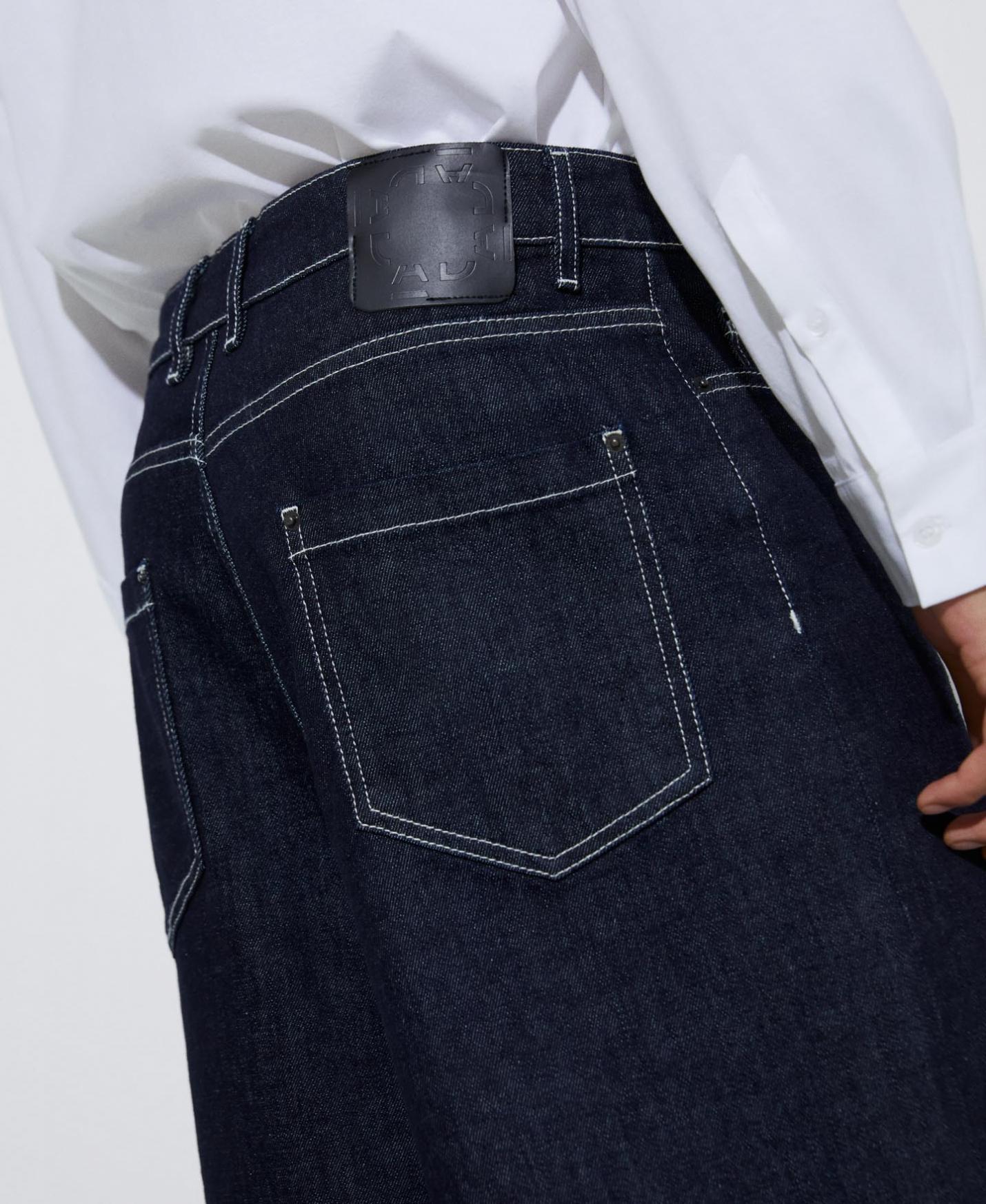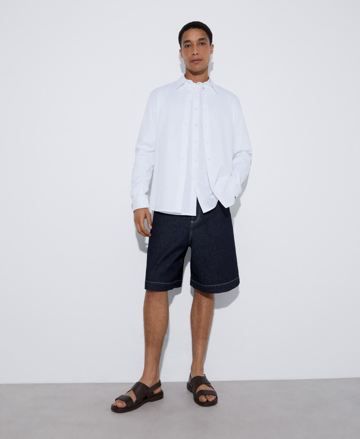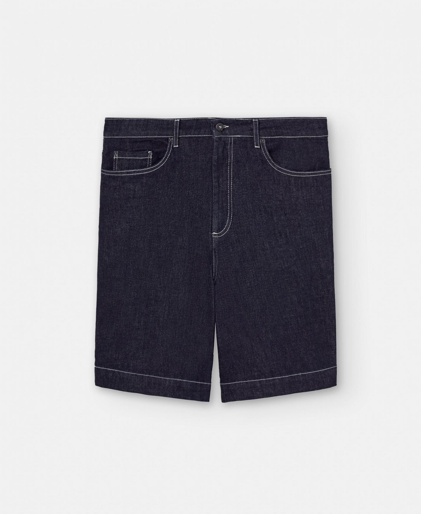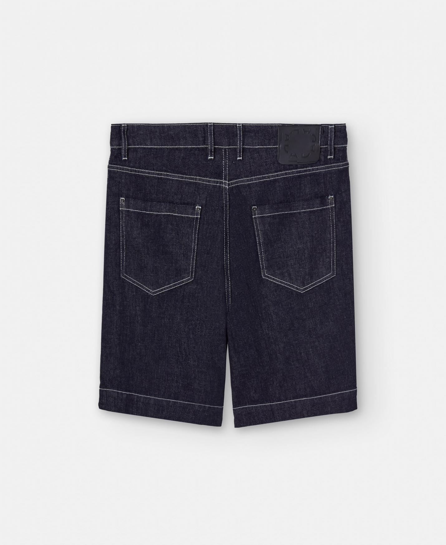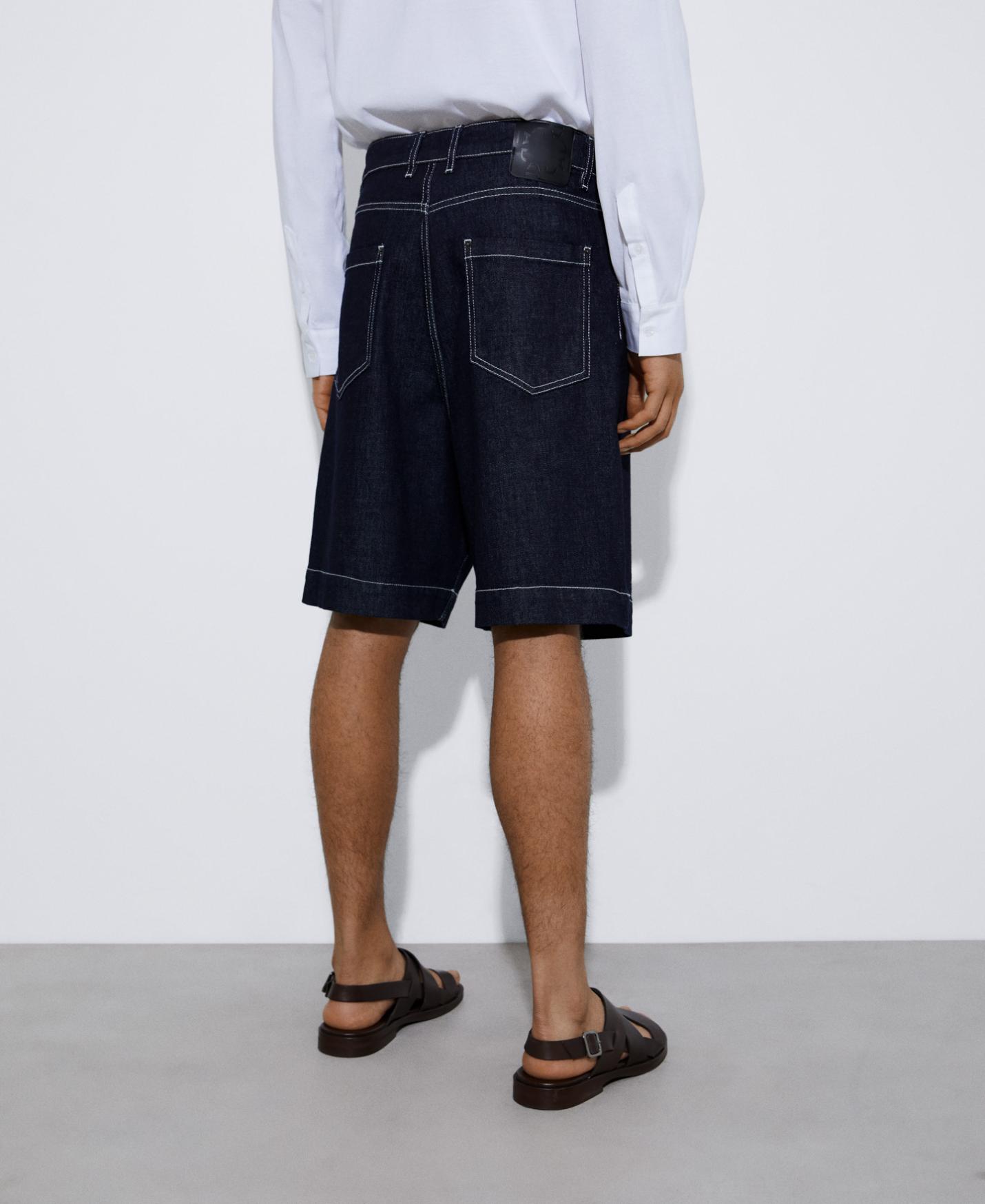 Pantalón vaquero corto en algodón reciclado. Tiene cinco bolsillos, cierre de botón y cremallera. Pespuntes blancos a contraste. Largo rodilla.