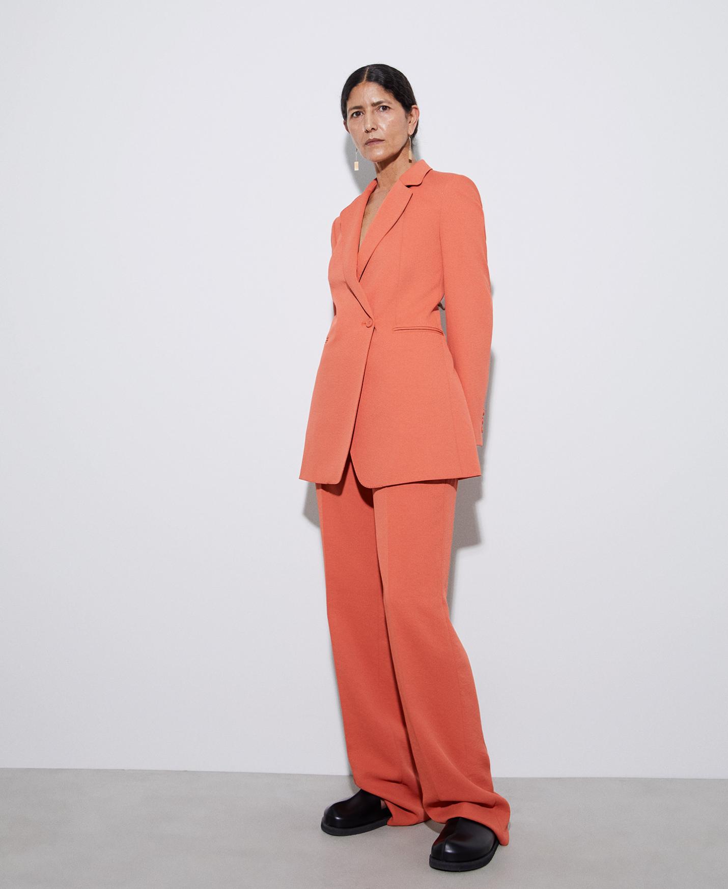 Blazer larga con pespuntes vistos en tejido de poliéster. Tiene cuello solapa, bolsillos en vivo, cierre de un botón y corte fluido. Pantalón a juego.