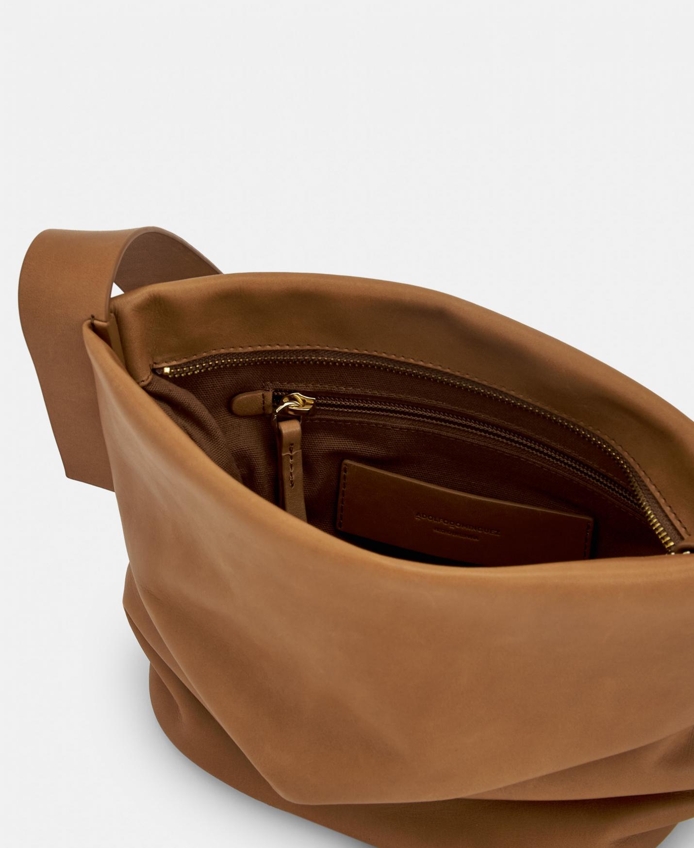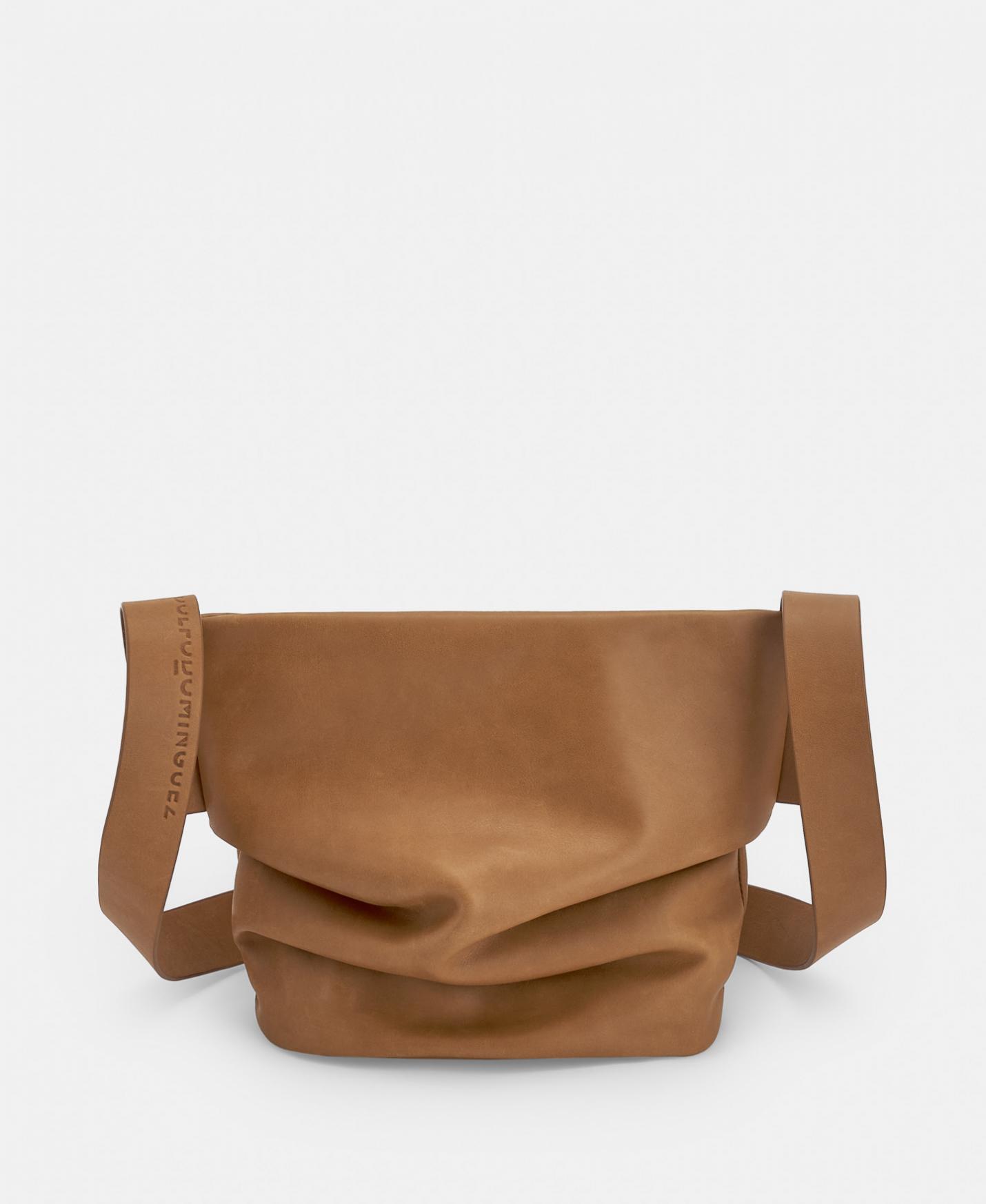 Bandolera en piel bovina de curtición libre de cromo. Tiene un compartimento con pliegues en delantero y trasero para un volumen especial. Bolsillos interiores en canvas orgánico, cierre de cremallera y asa ancha y plana. Hecho en España.