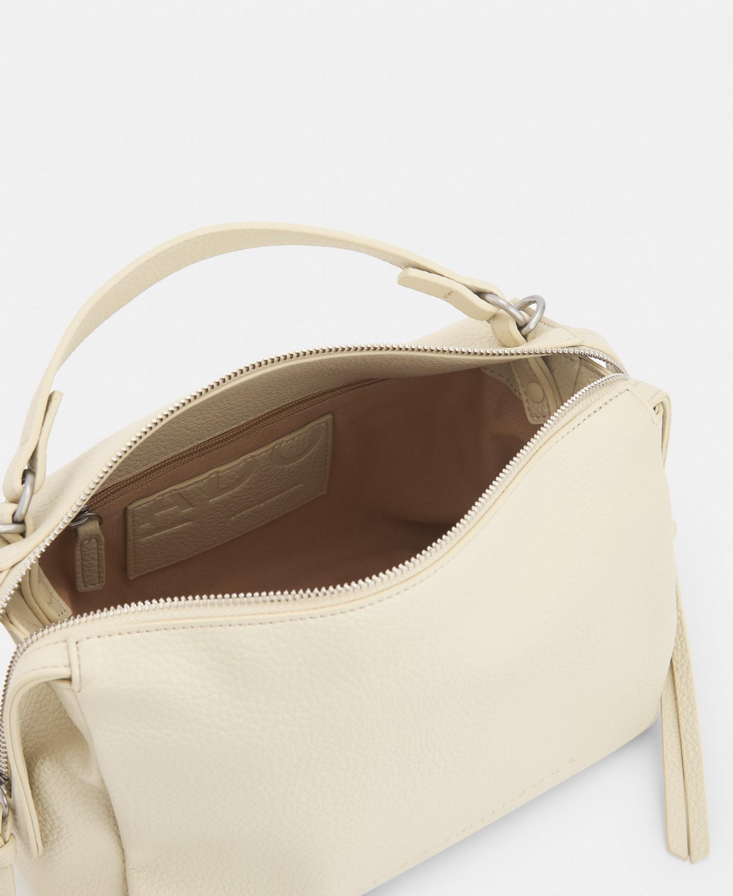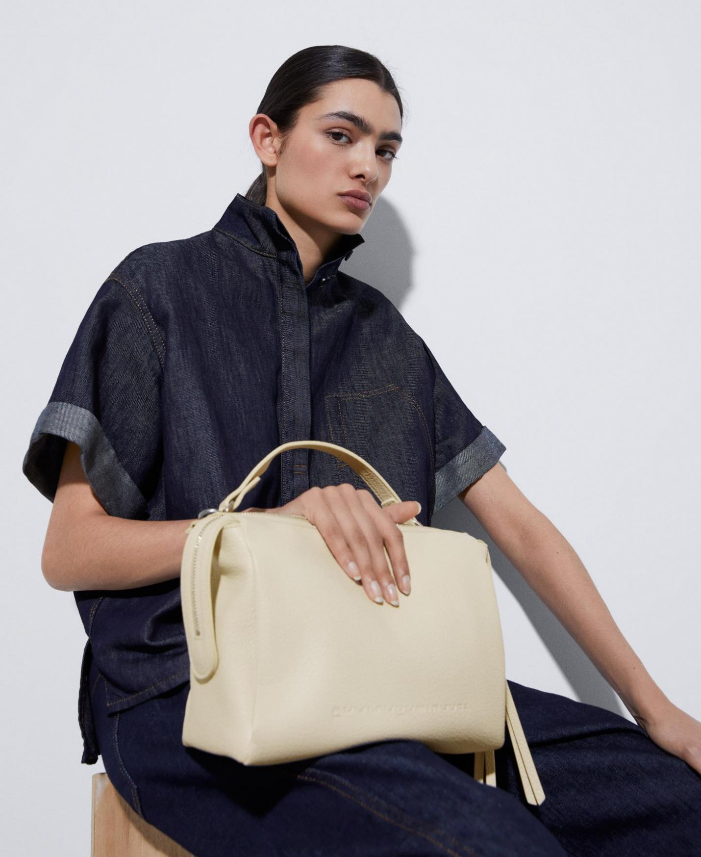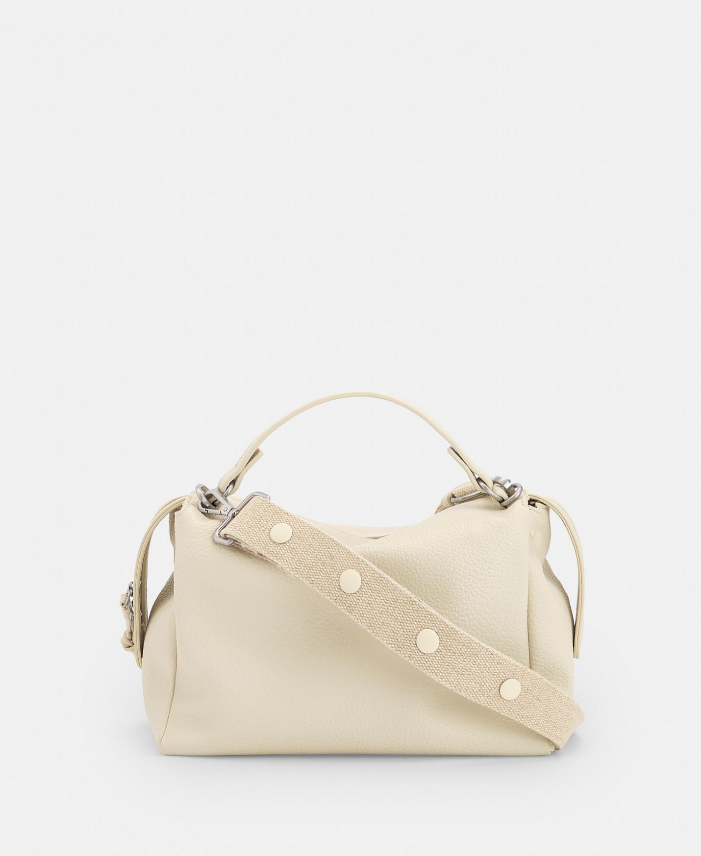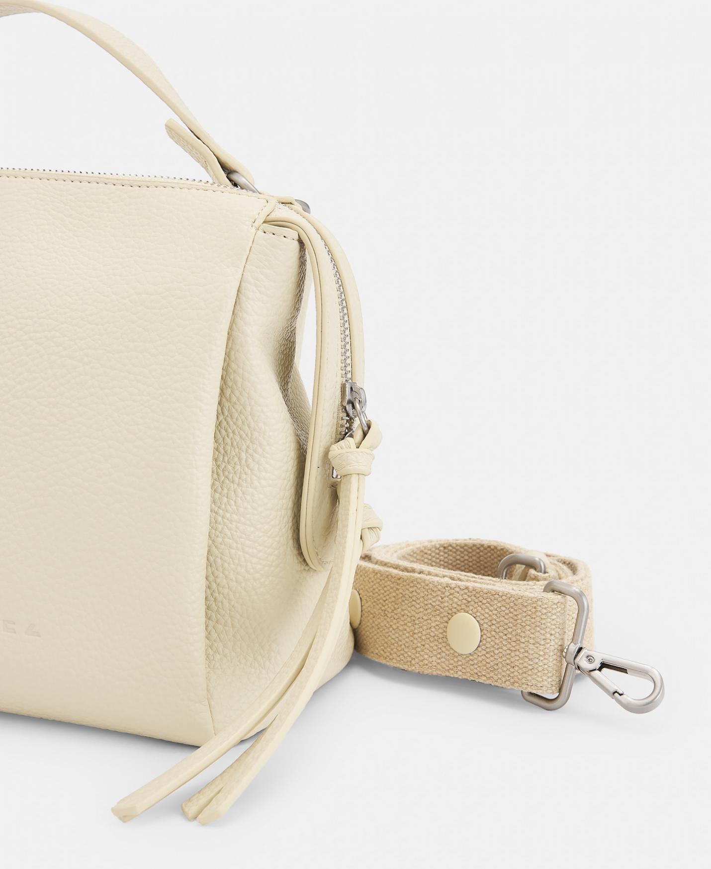Bandolera mediana en poliuretano y poliéster reciclados en textura grano. Tiene un compartimento con cierre cremallera, un asa corta de mano y otra larga en cinta de algodón orgánico regulable con clips.