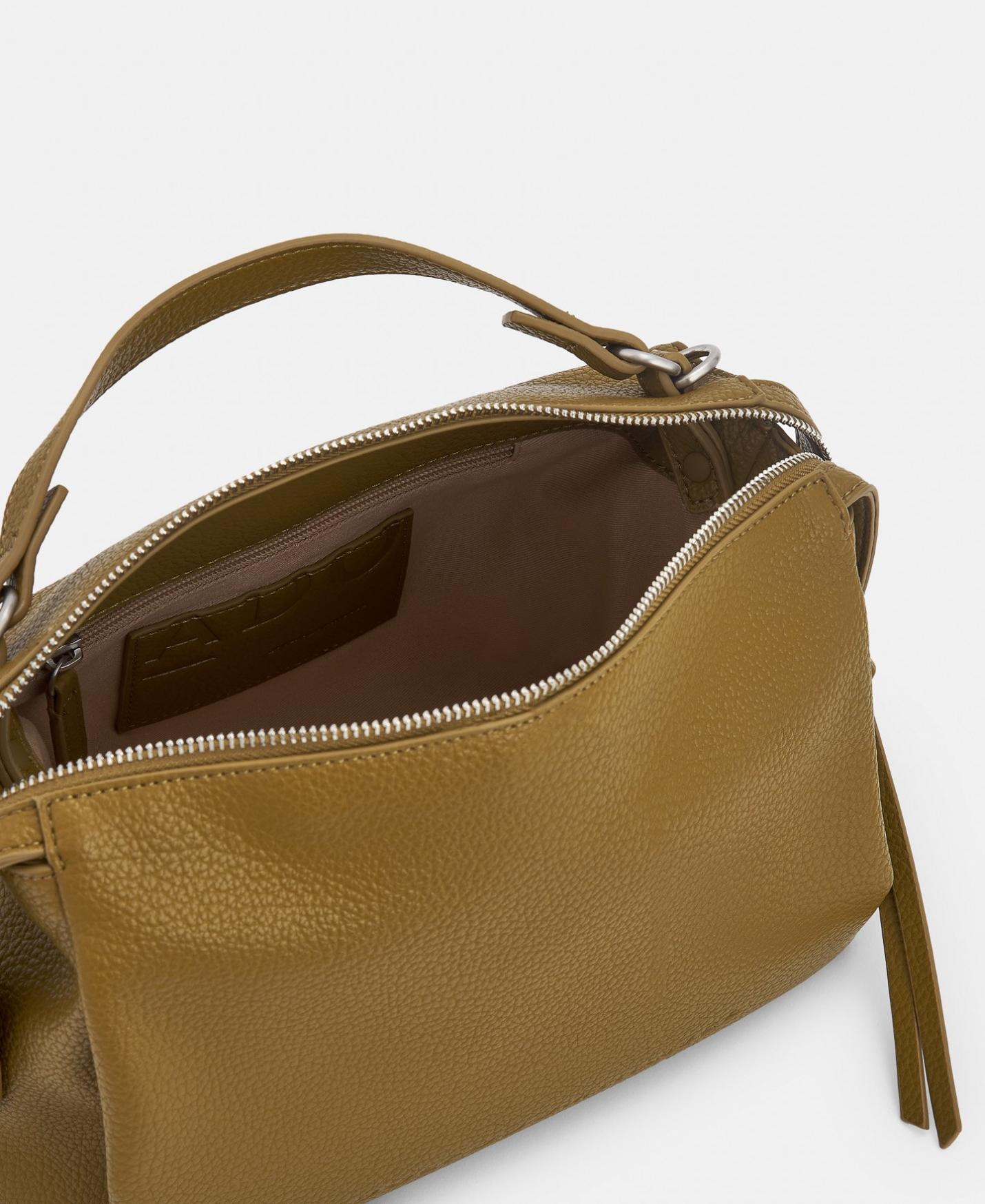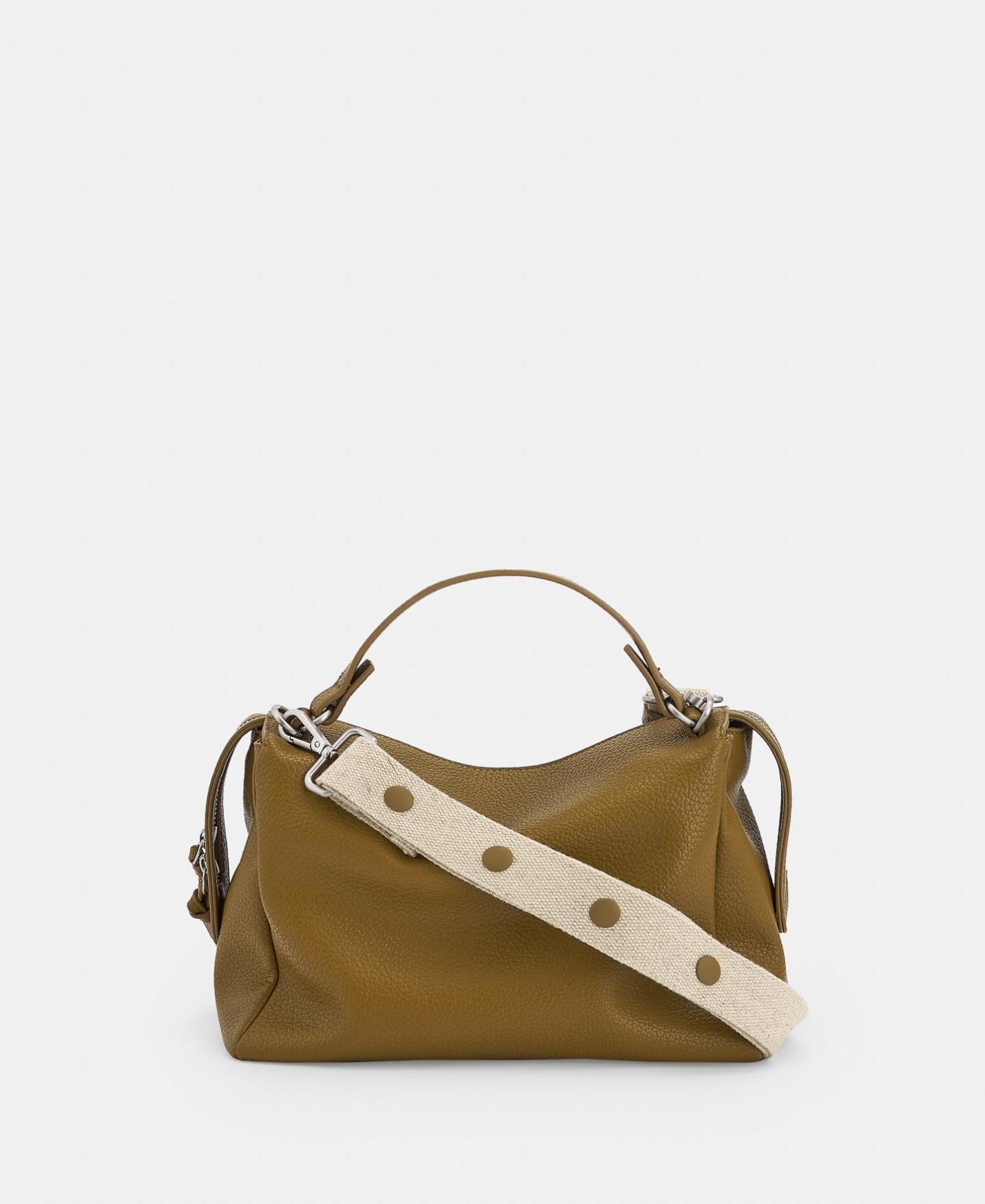 Bandolera mediana en poliuretano y poliéster reciclados con textura grano. Un compartimento con cierre de cremallera, doble asa de mano y asa de algodón regulable por clips.Metales reciclados. Forro algodón orgánico.