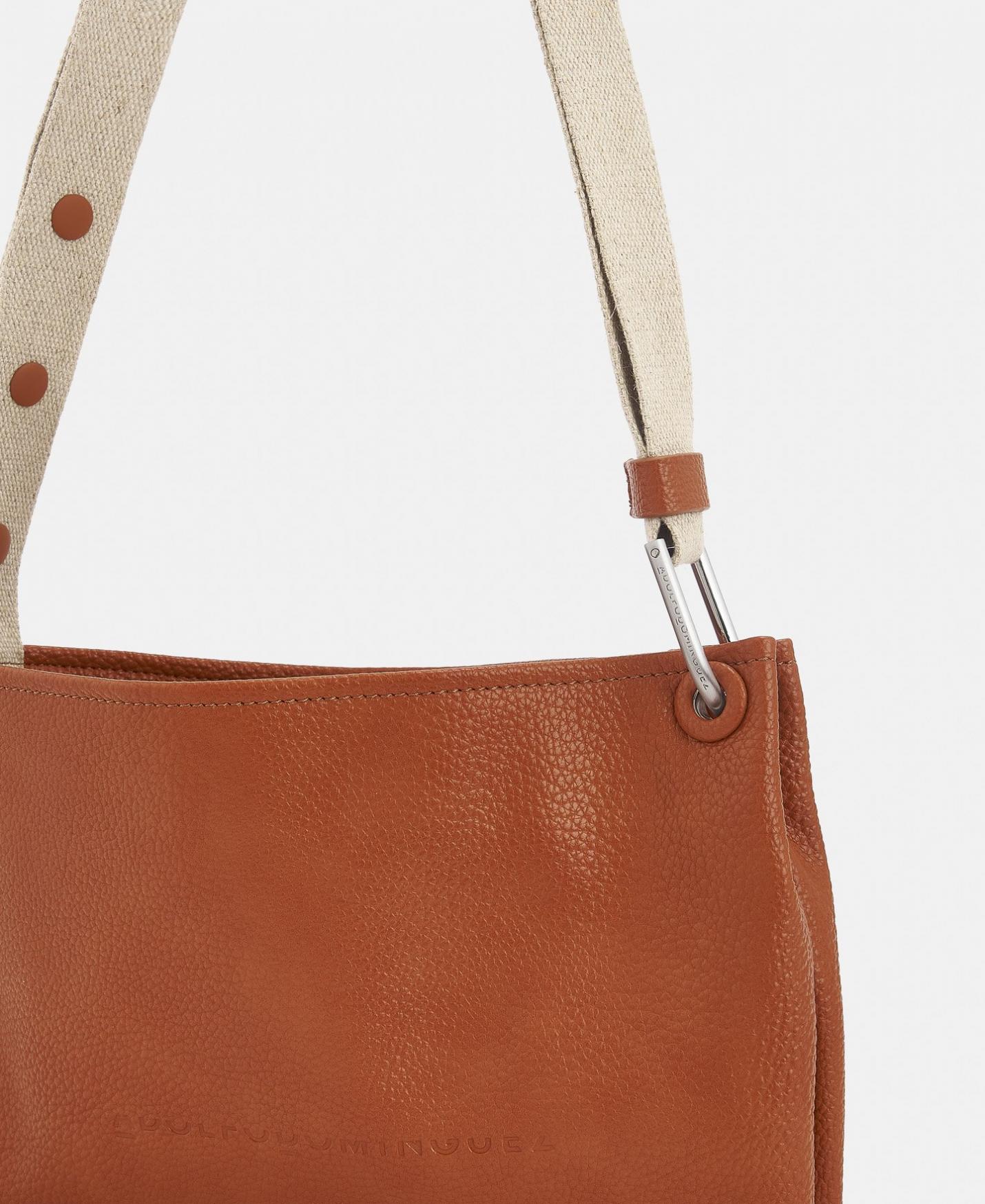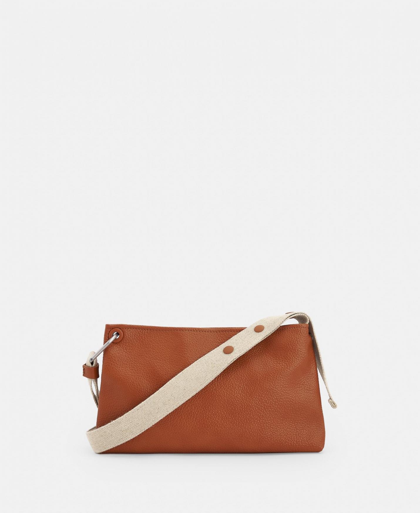 Bandolera pequeña en poliuretano y poliéster reciclados con textura grano. Un compartimento con cierre de cremallera, asa larga de algodón regulable por clips.Metales reciclados. Forro algodón orgánico.