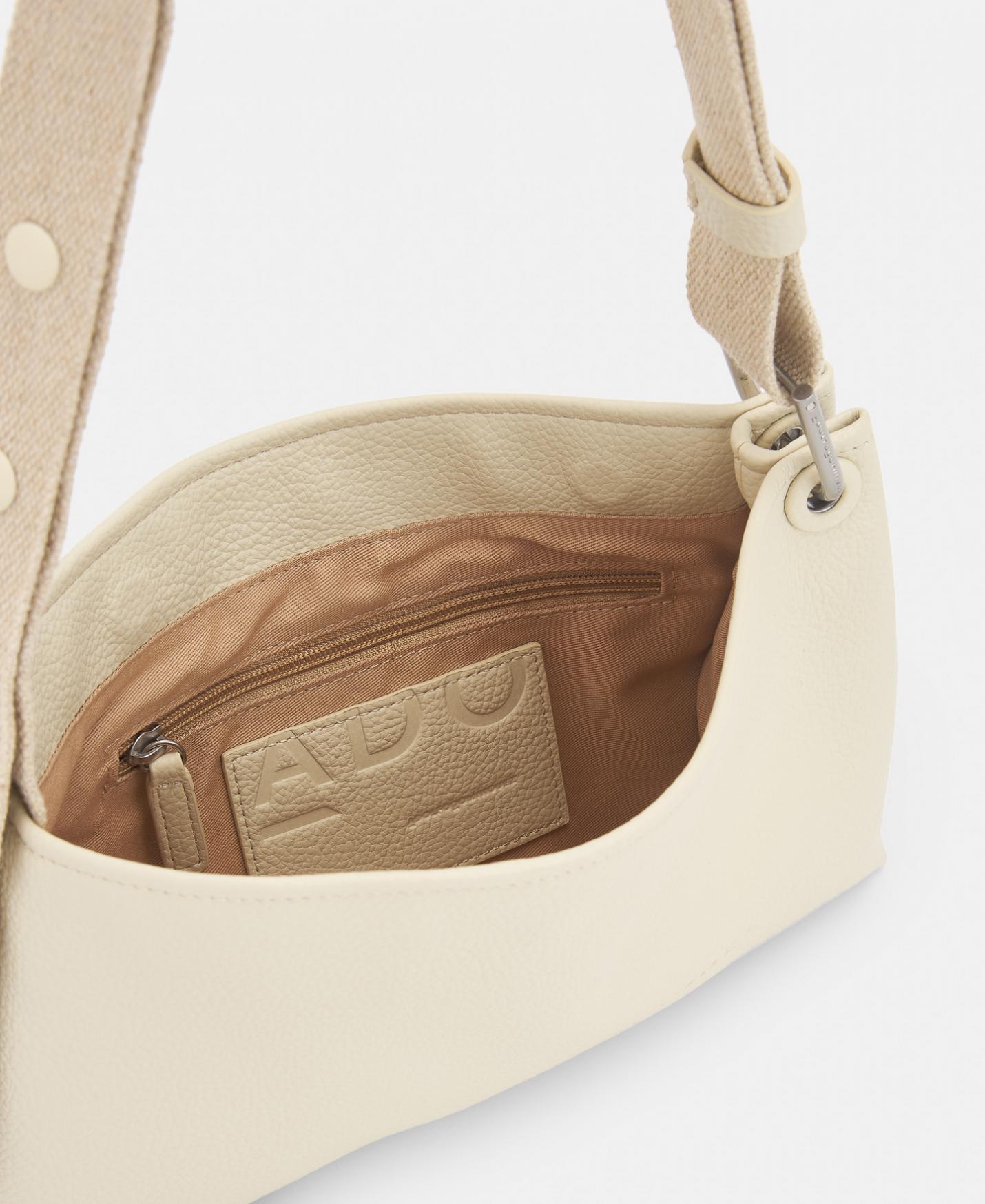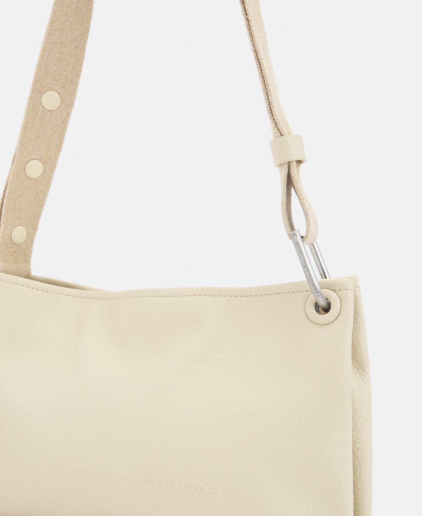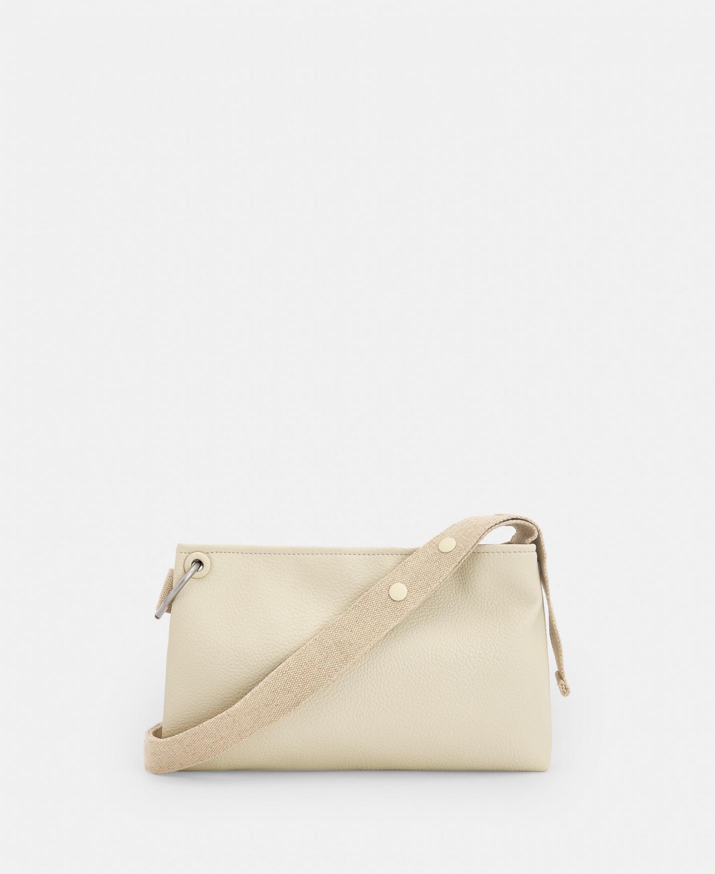 Bandolera pequeña en poliuretano y poliéster reciclados en textura grano. Tiene un compartimento con cierre de clip, pliegue lateral y asa larga de algodón reciclado y lino.