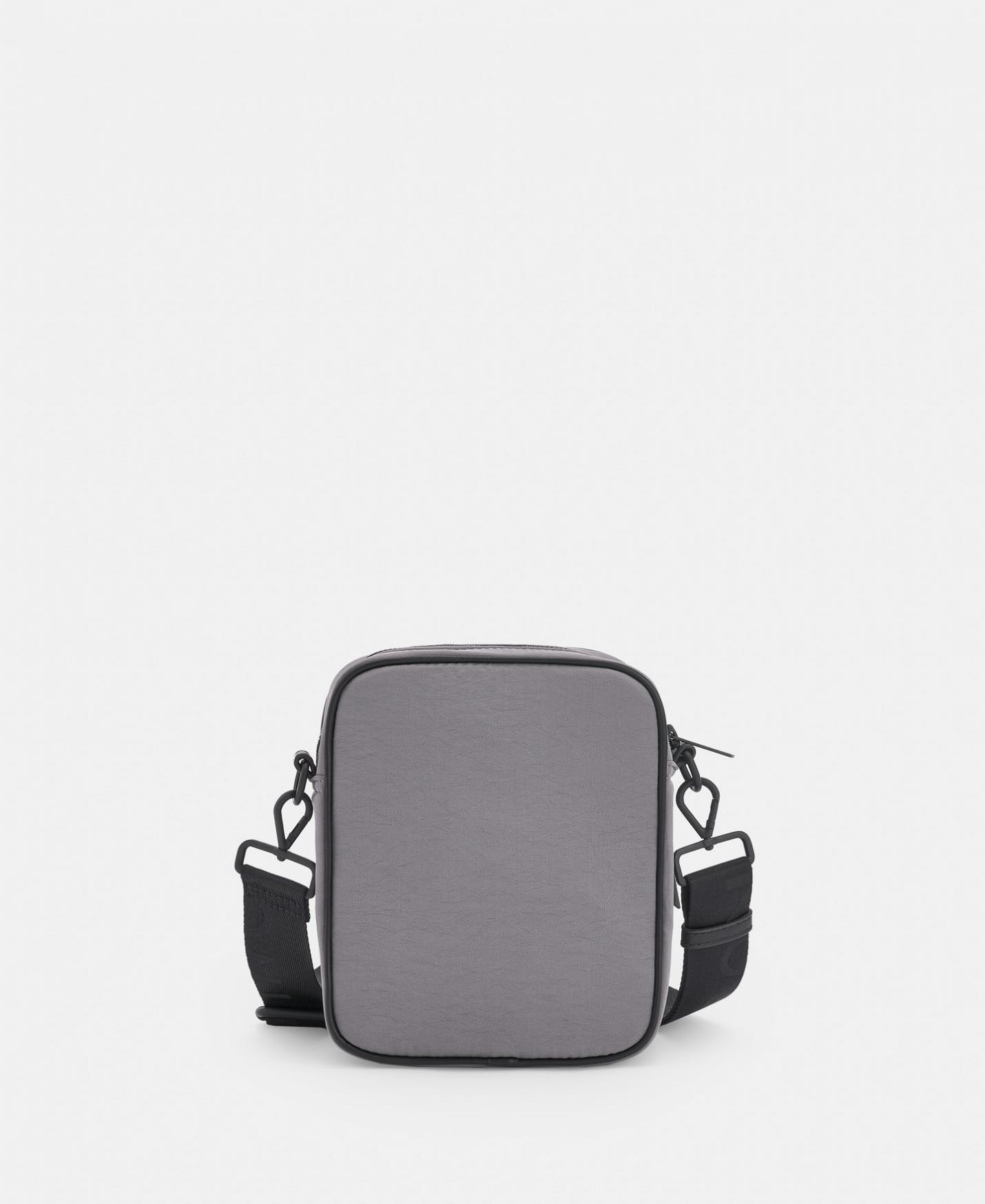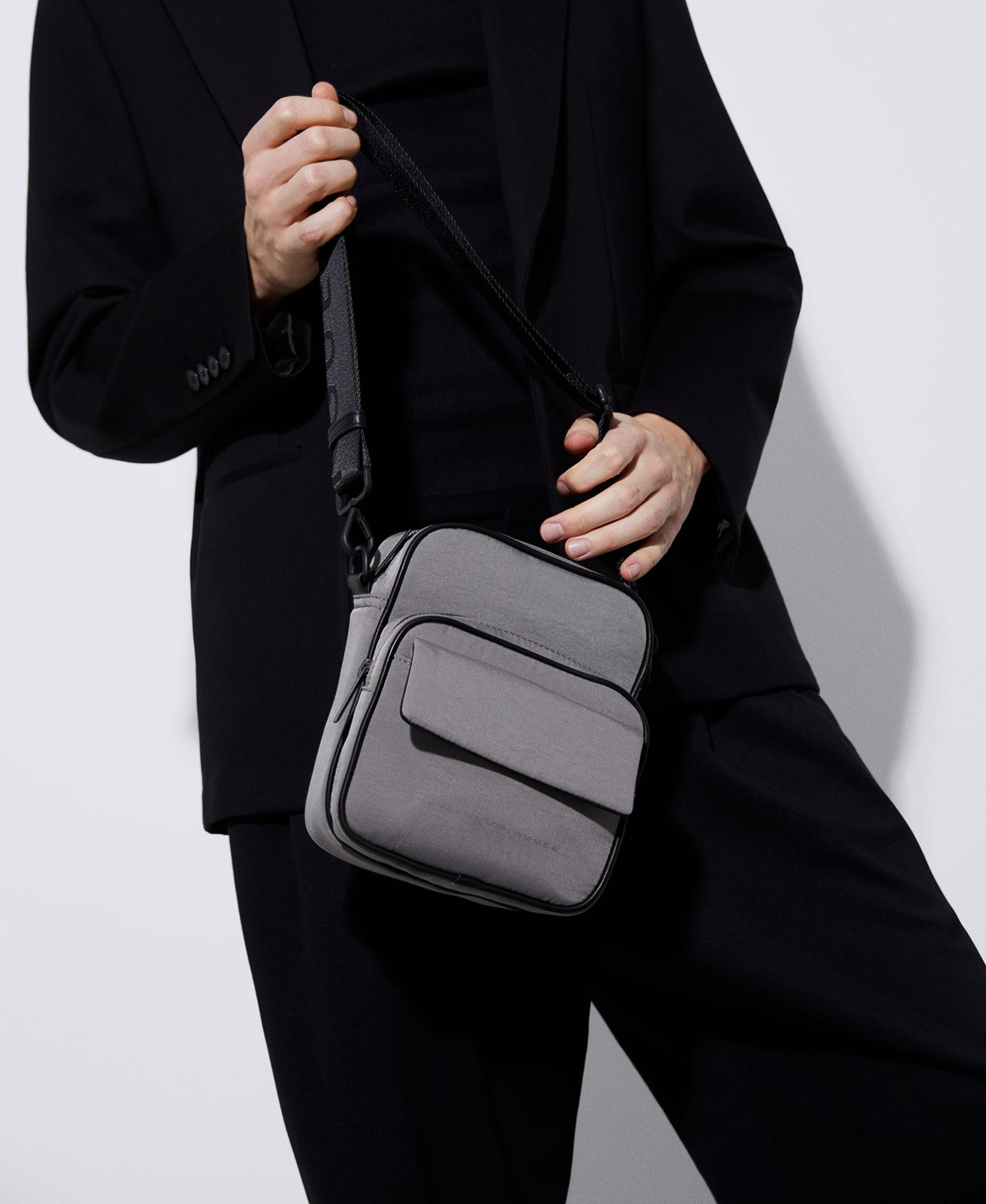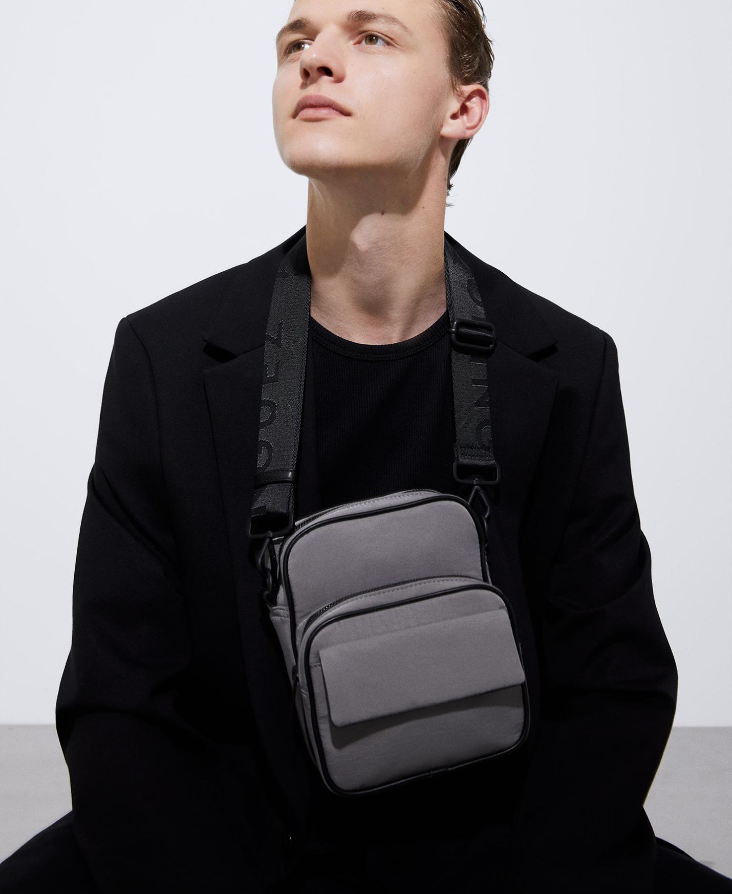 Bandolera pequeña en poliéster reciclado. Correa logotipada en nylon reciclado. Tiene un compartimento con cierre de cremallera y un segundo bolsillo frontal con cierre de imán.