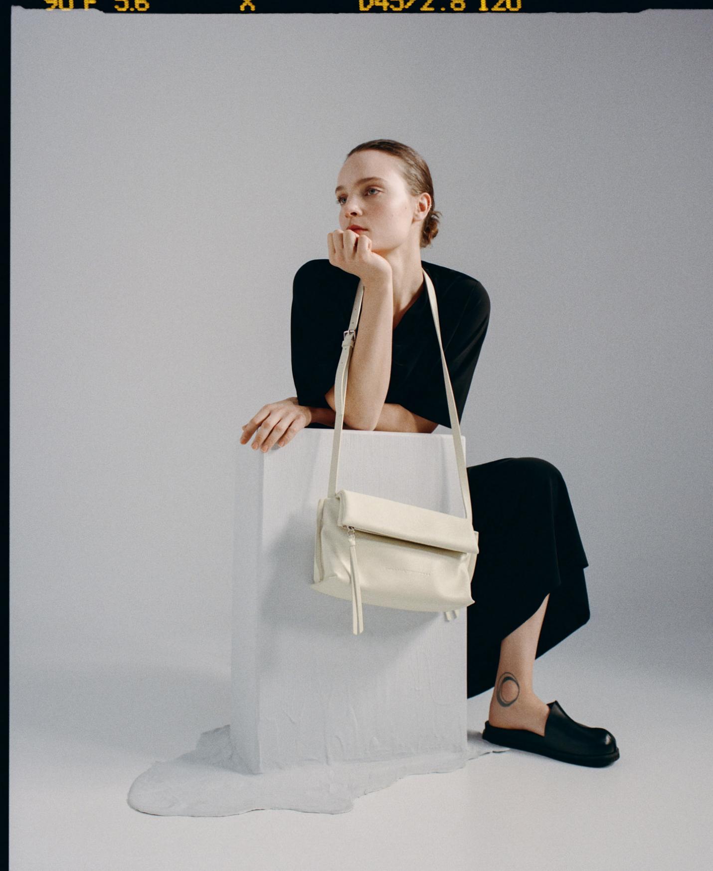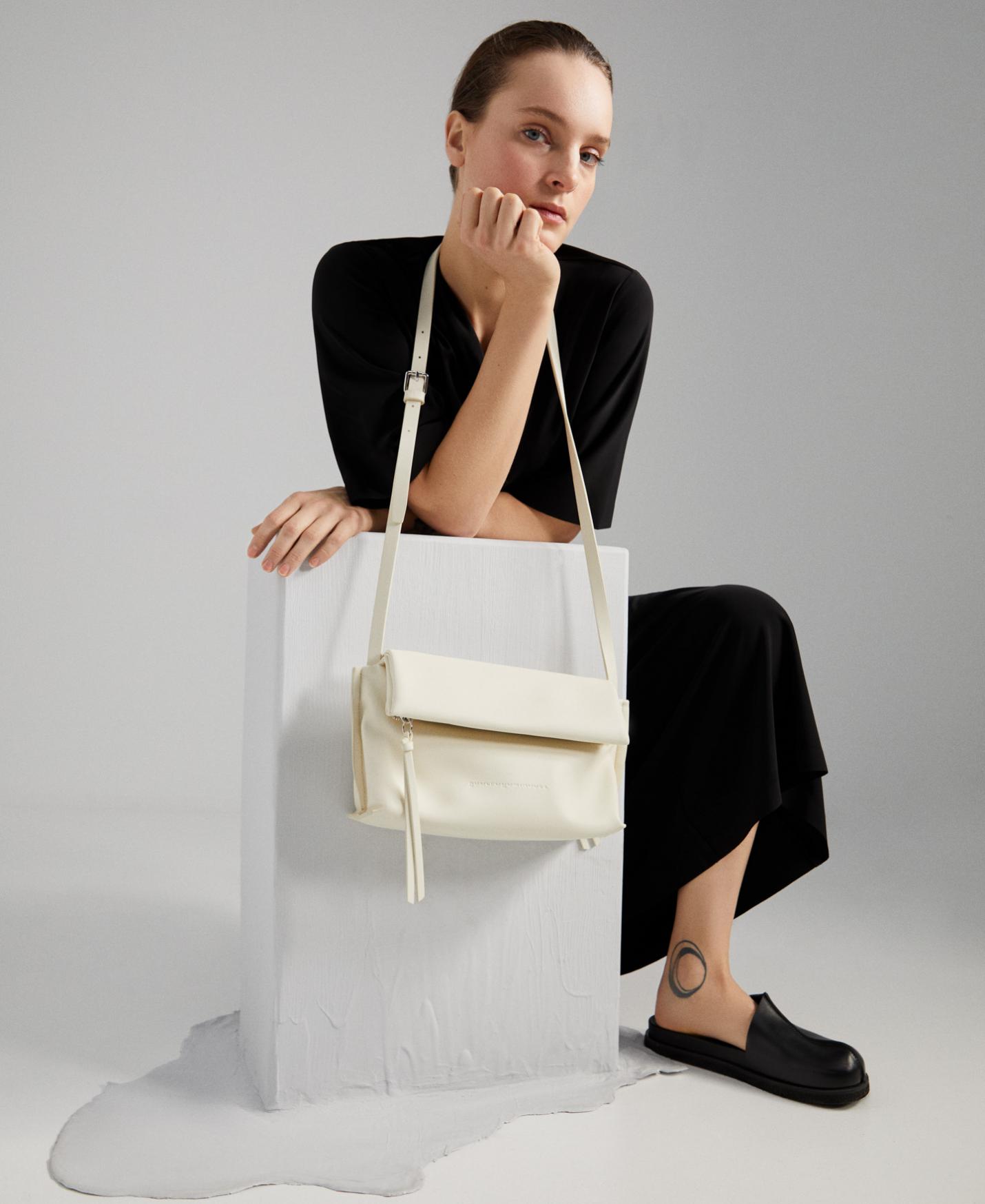 Bandolera en poliuretano reciclado y forro interior de algodón orgánico. Un compartimento con cierre solapa y cremallera. Asa larga regulable en tres posiciones.