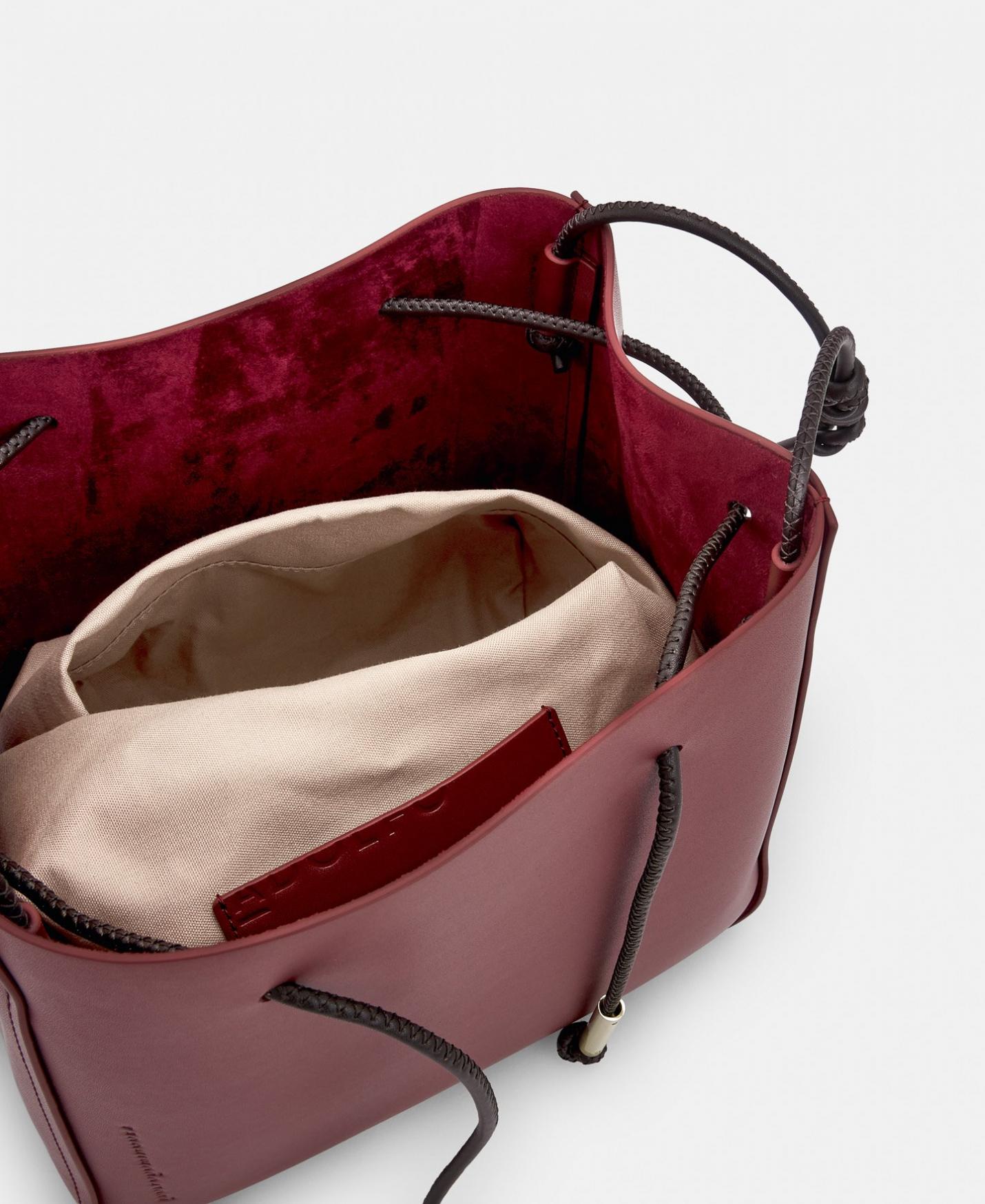 Bolso cubo en piel vaqueta rectificada. En su proceso de curtición se han utilizado prácticas responsables con el medioambiente. Tiene asas tubulares, cierre con cordón y bolsa interior.