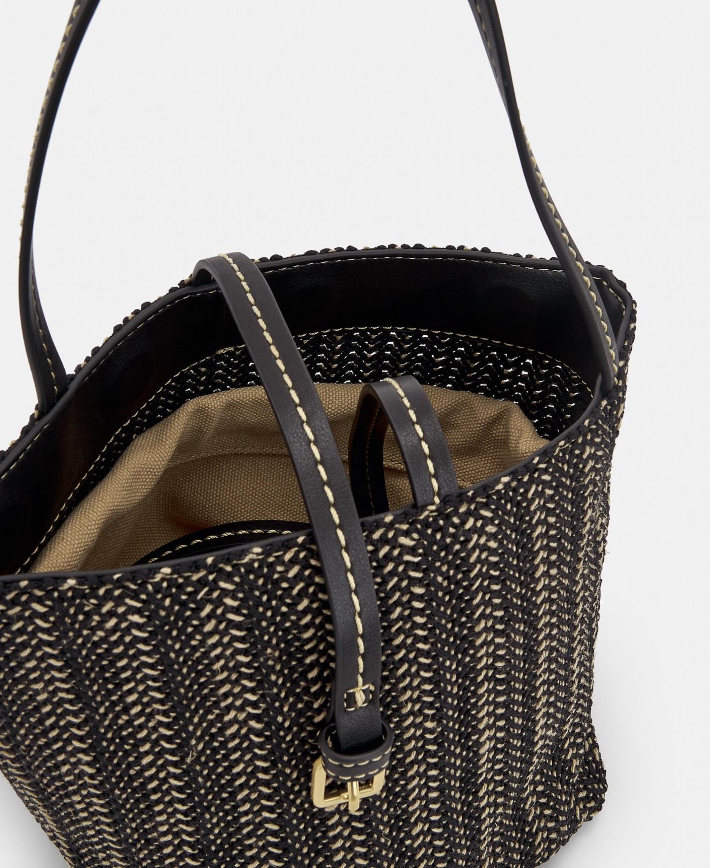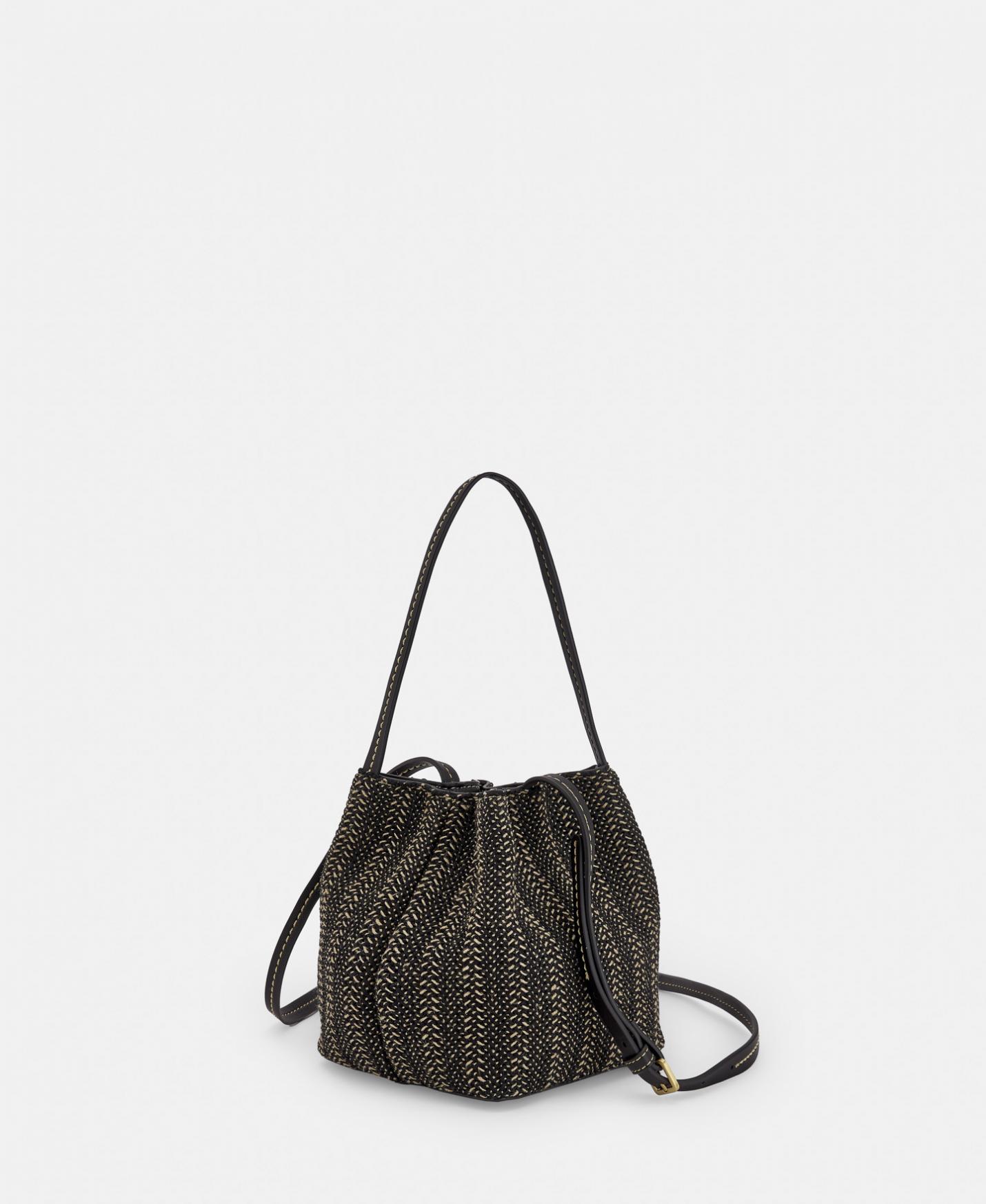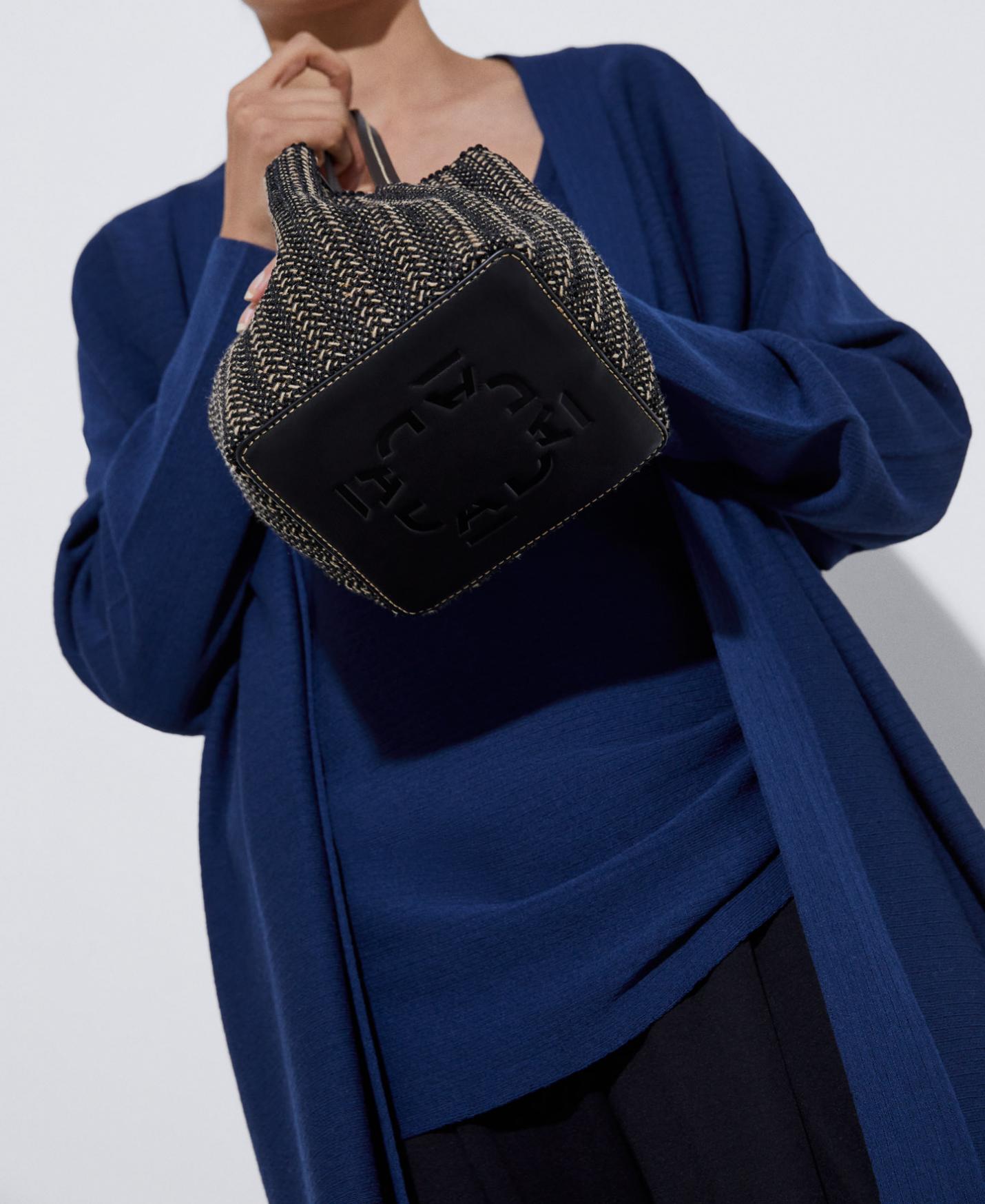 Bolso pequeño en rafia de poliéster reciclado y yute. Tiene un compartimento transformable en saco o capazo por cierre magnético. Base cuadrada logotipada, con asa corta de mano y larga regulable. Bolsa interior en algodón reciclado.