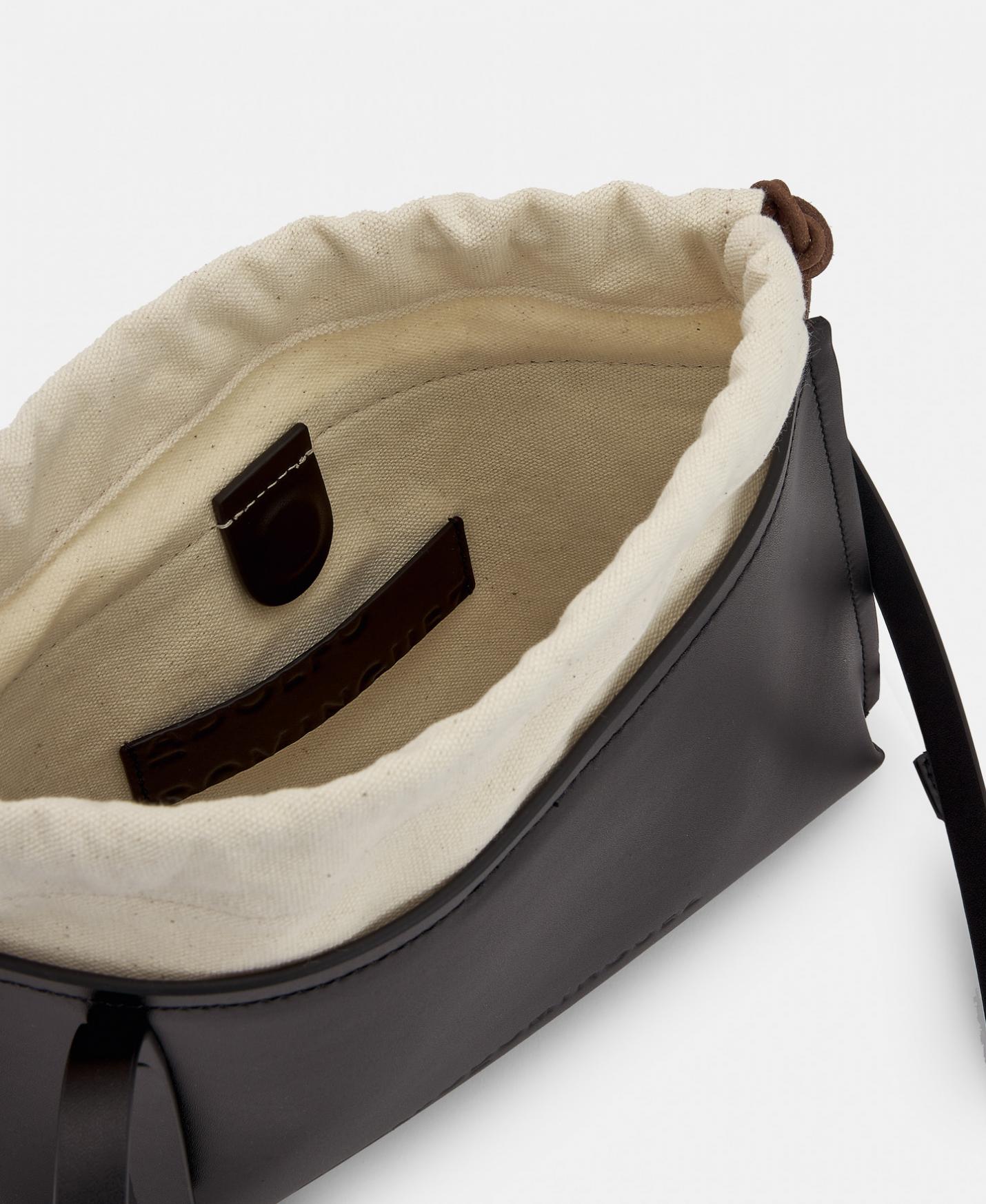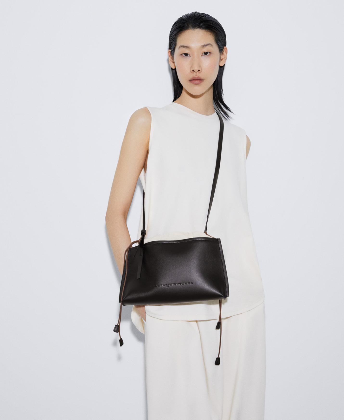 Bolso bandolera con forma rectangular en 100% piel. Forro interior de 100% algodón orgánico. Asa larga ajustable, logotipo repujado.