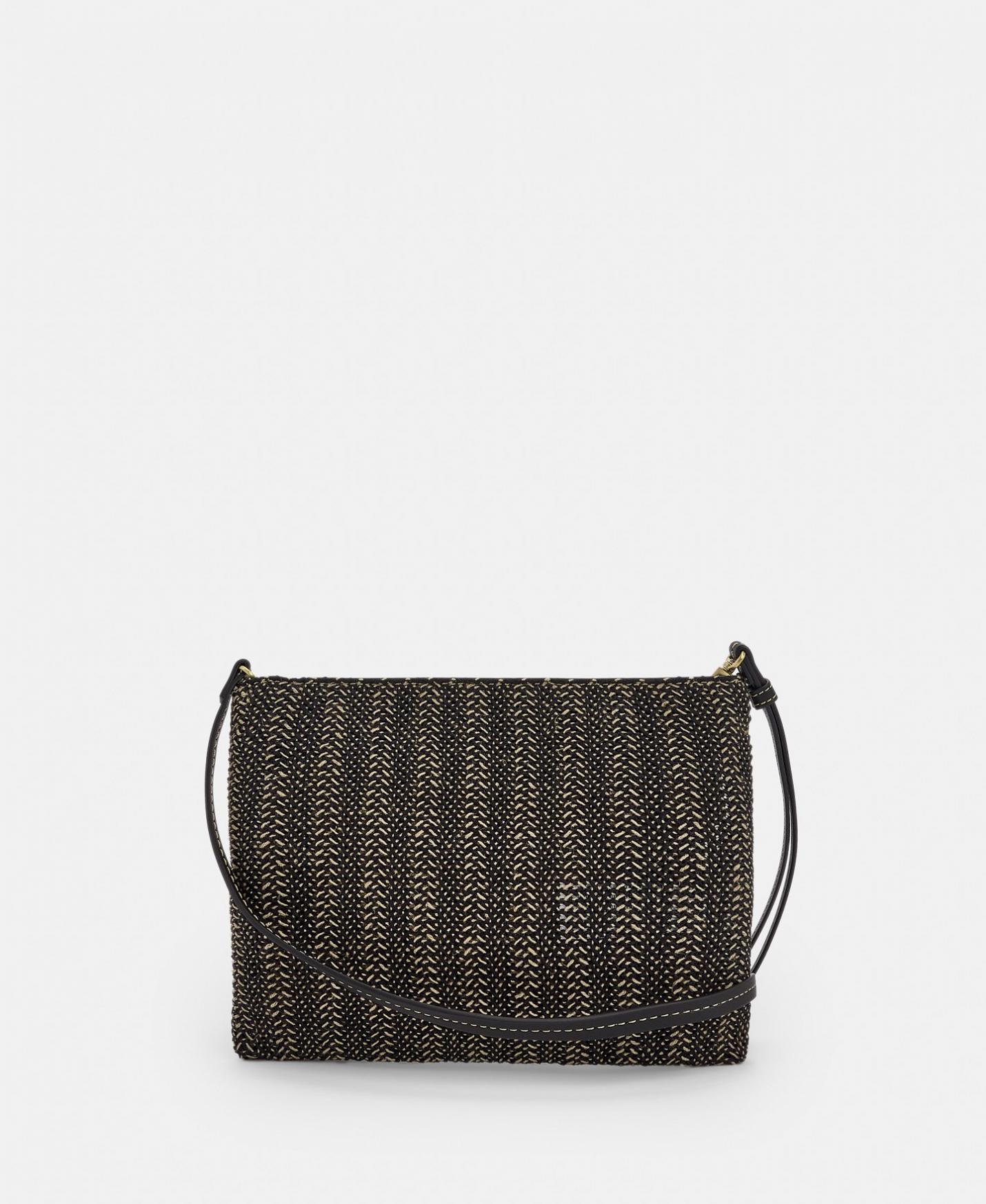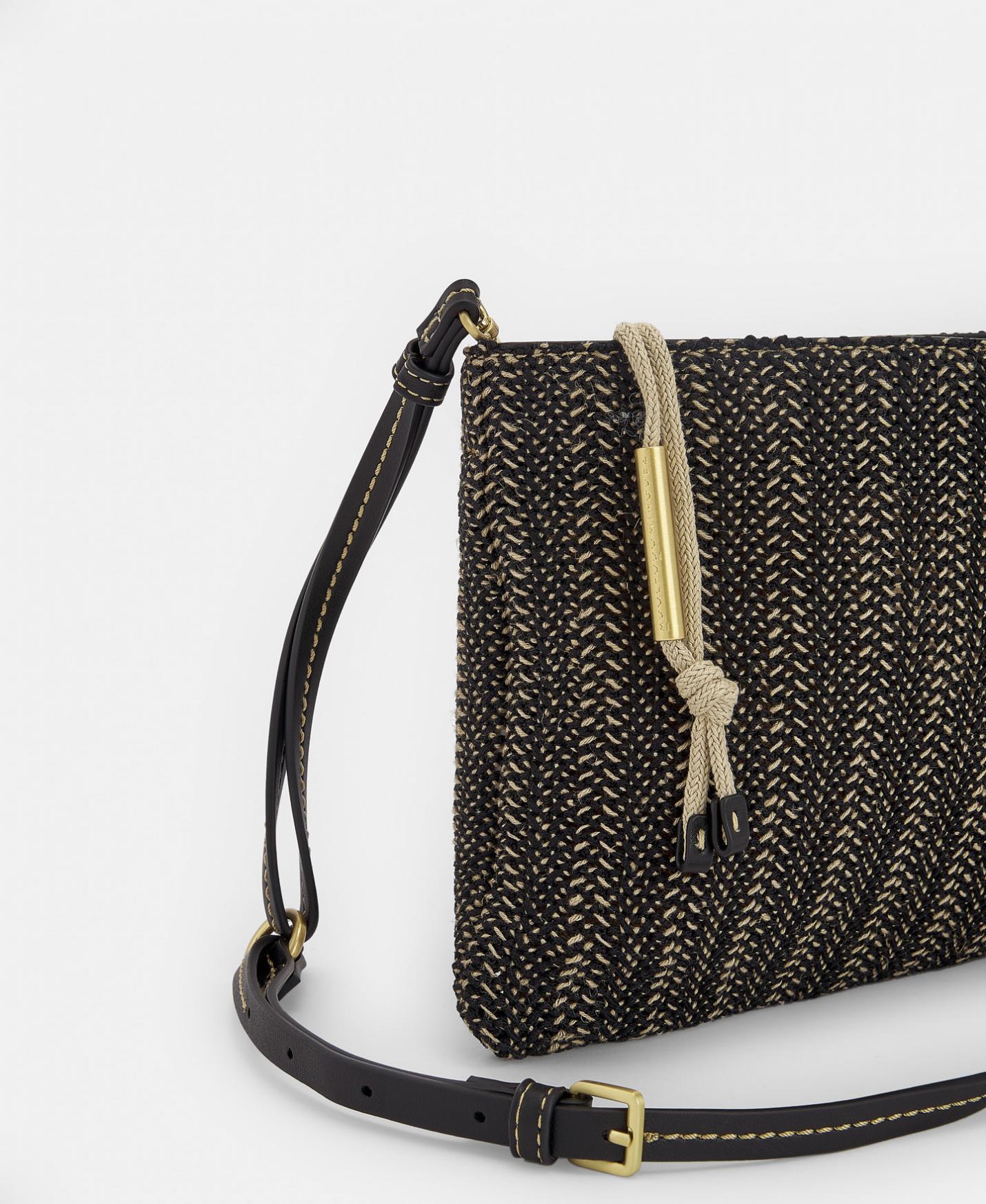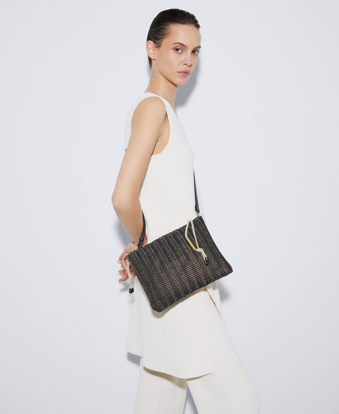 Clutch en rafia calada de poliéster reciclado. Tiene un compartimento, cierre de cremallera de metal reciclado. Asa muñequera y opción de asa bandolera regulable. Forro de algodón reciclado.