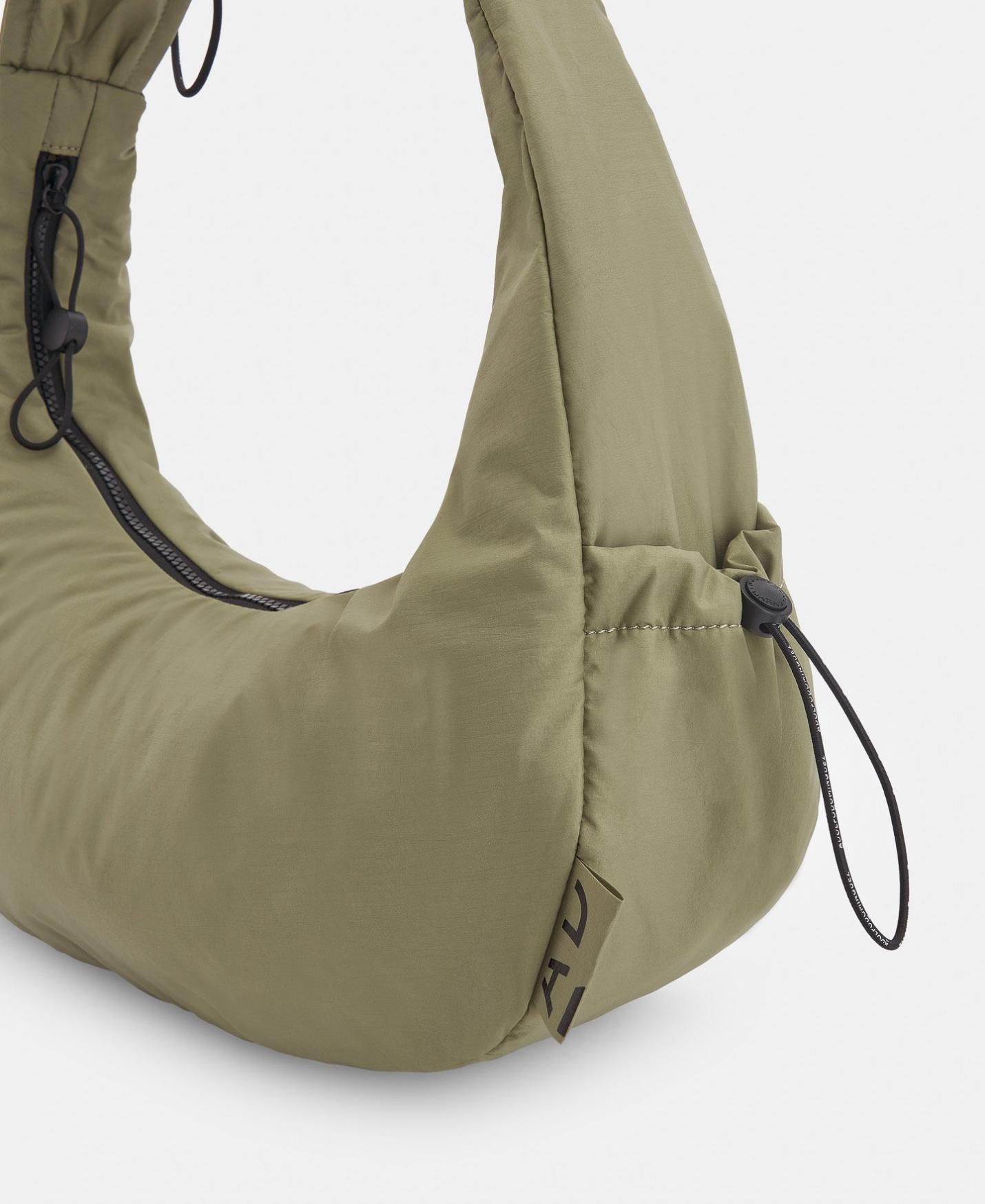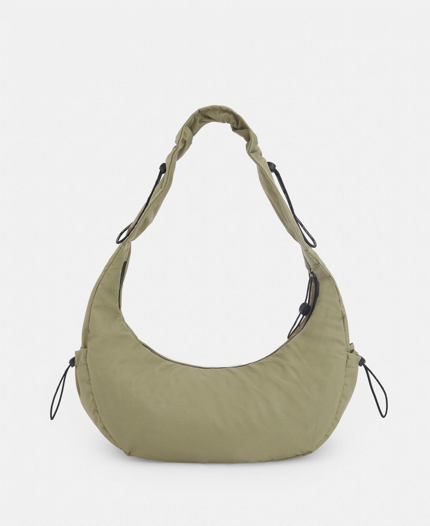 Hobo en nylon reciclado de tamaño medio. Tiene un compartimento con cierre cremallera y dos bolsillos laterales con cierre de estrangulador. Asa ligeramente regulable.