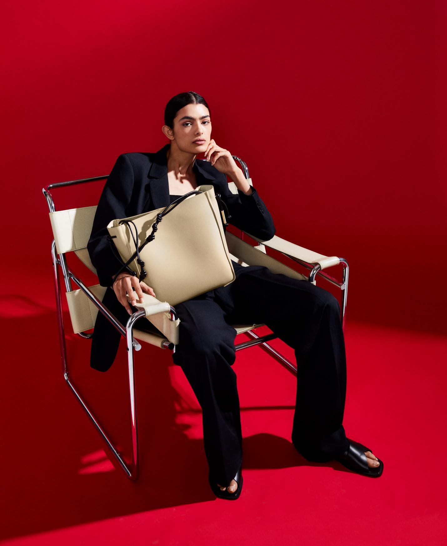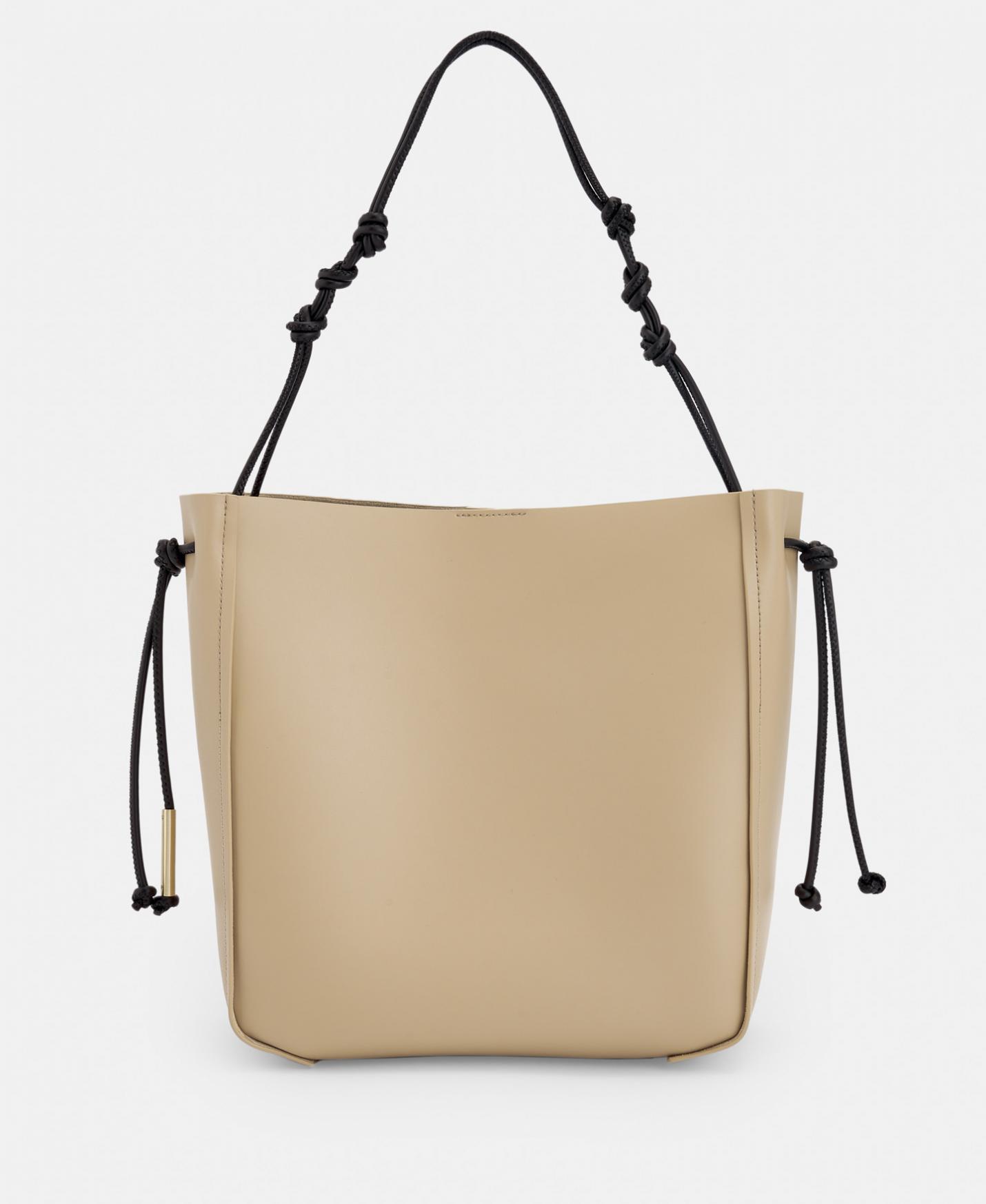 Hobo en piel vaqueta rectificada. En su proceso de curtición se han utilizado prácticas responsables con el medioambiente. Tiene asas tubulares, cierre con cordón y bolsa interior.