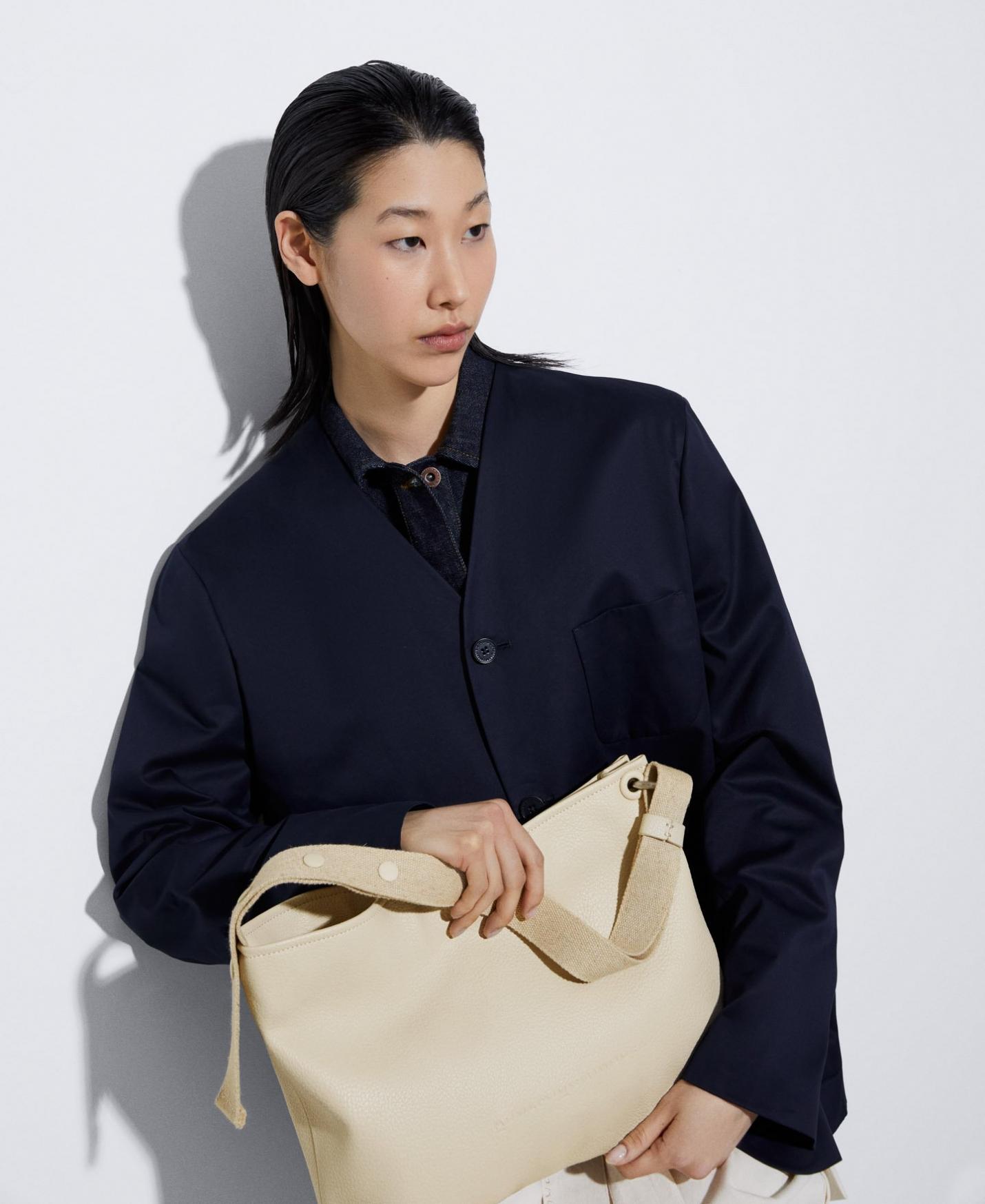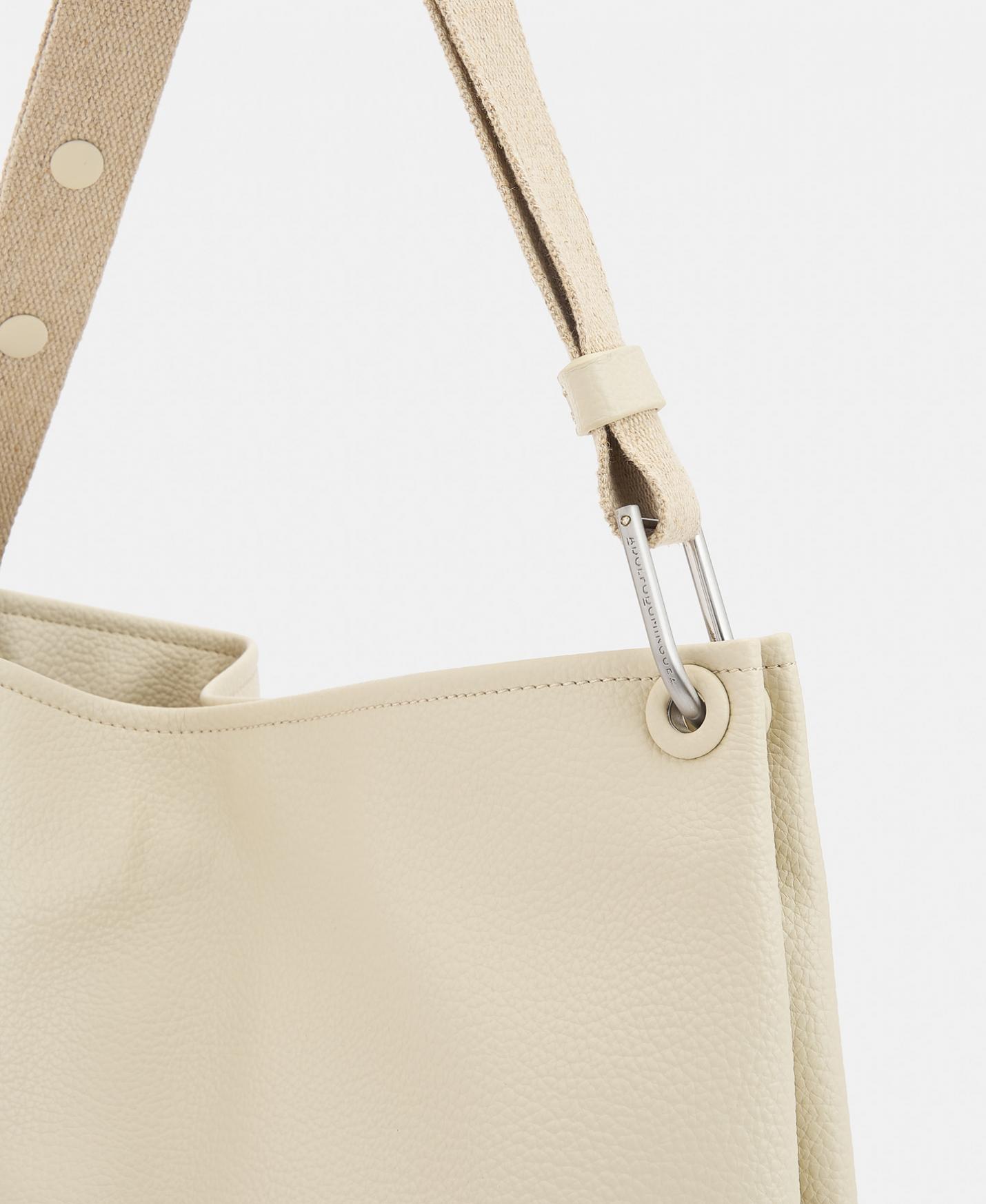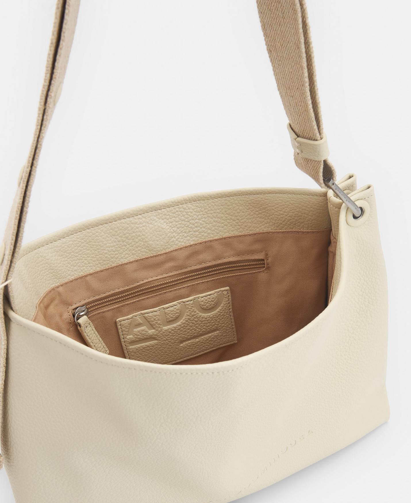 Hobo horizontal en poliuretano y poliéster reciclados en textura grano. Tiene un compartimento con cierre cremallera, asa de cinta de algodón orgánico regulable con clips.
