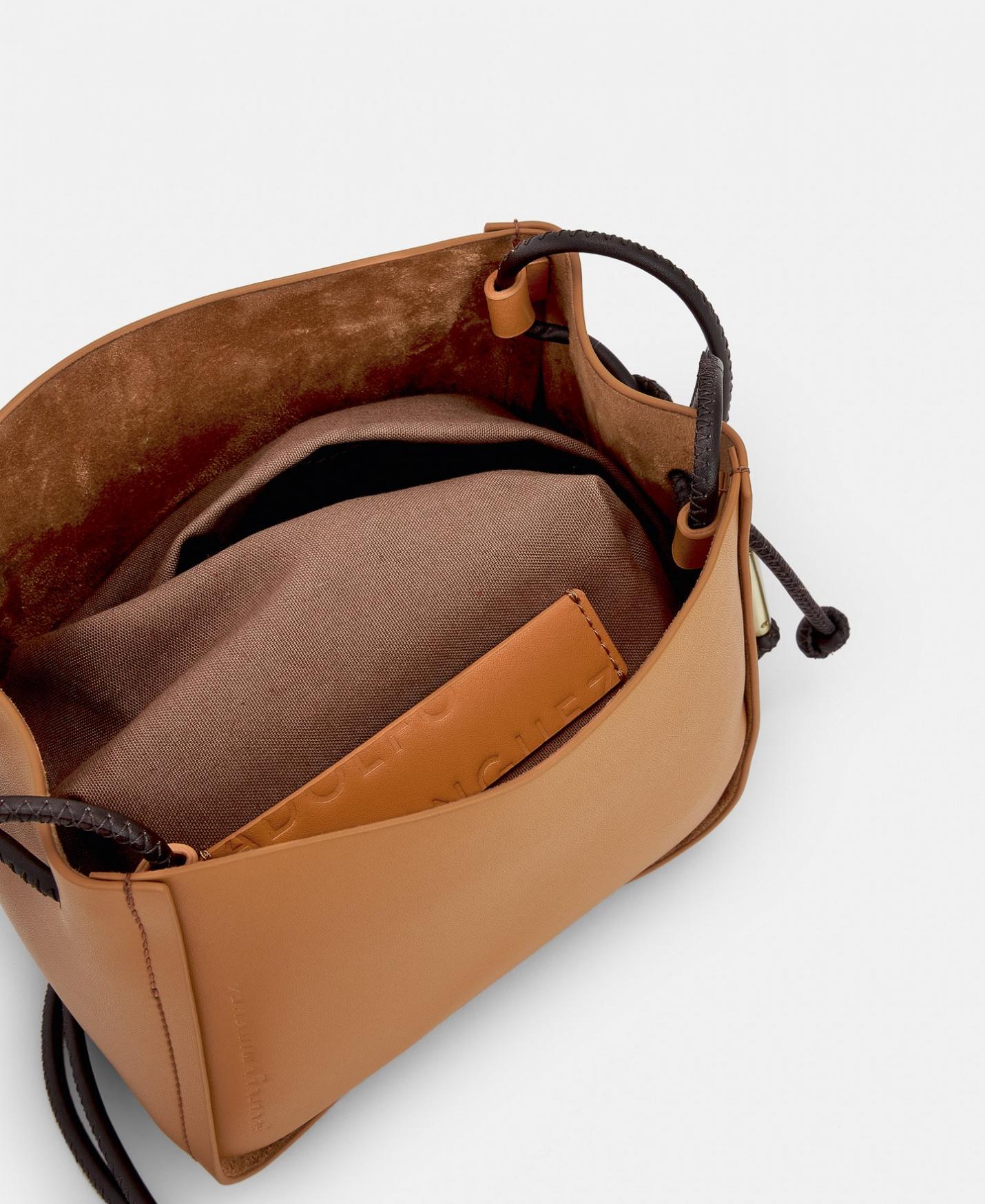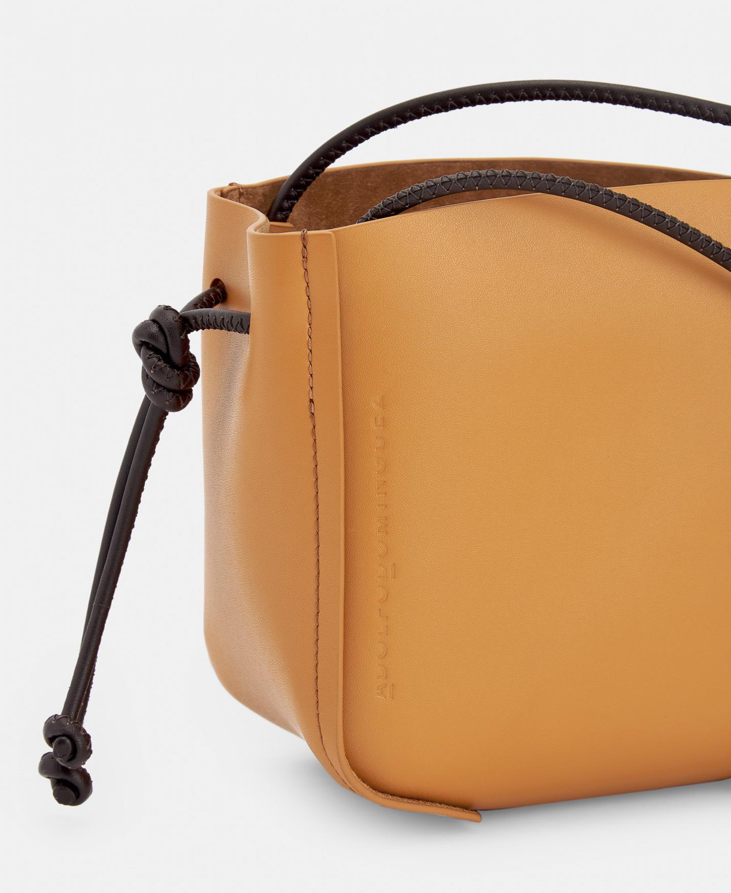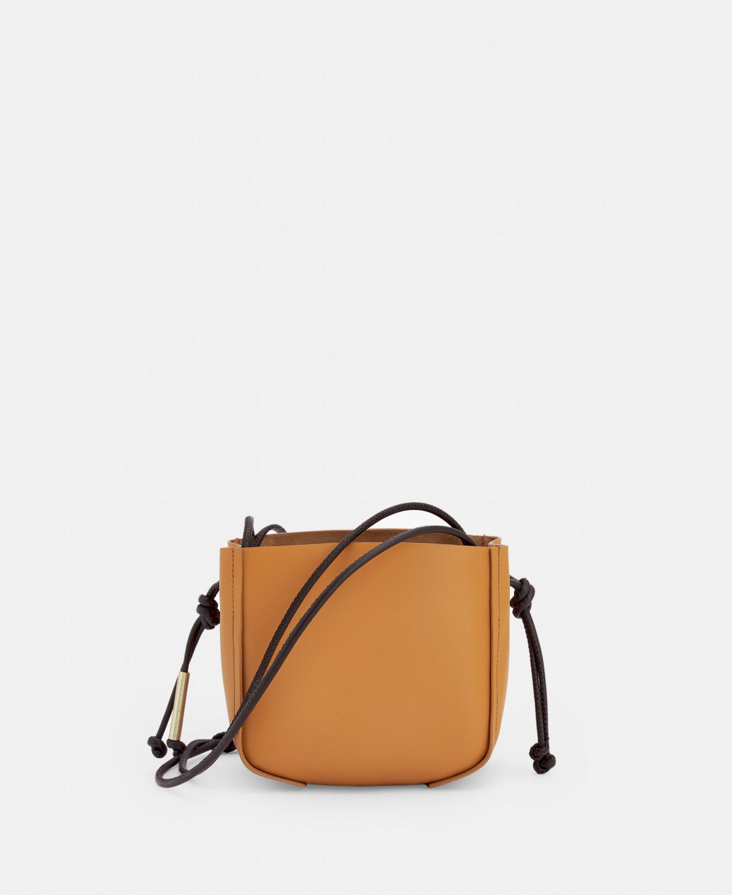 Mini bolso cubo en piel vaqueta rectificada. En su proceso de curtición se han utilizado prácticas responsables con el medioambiente. Tiene asas tubulares, cierre con cordón y bolsa interior.