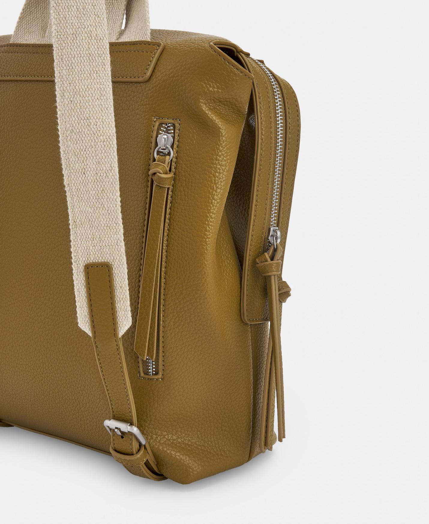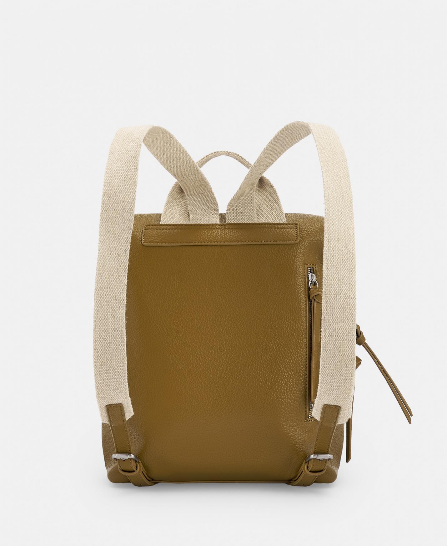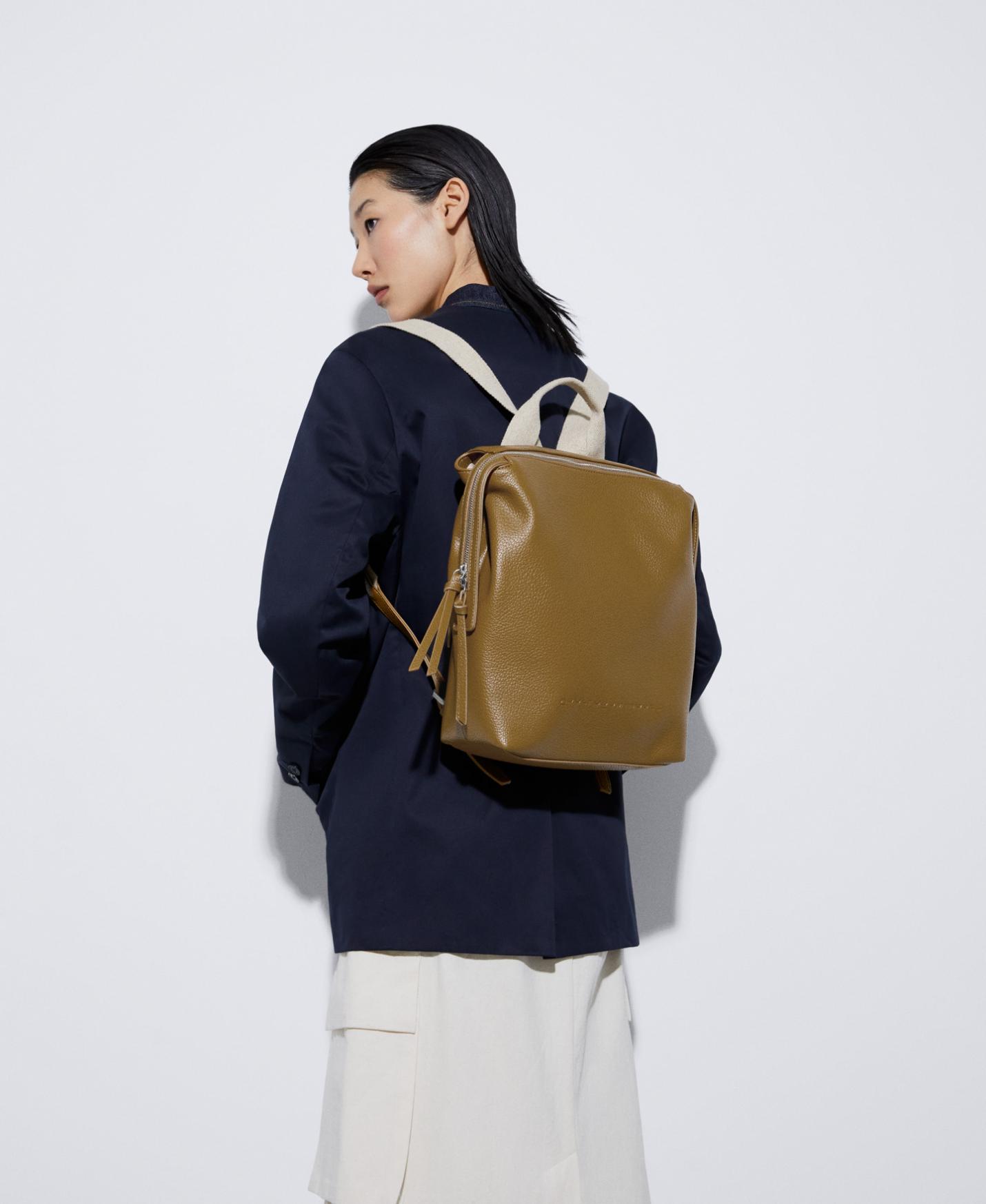 Mochila en poliuretano y poliéster reciclados con textura grano. Un compartimento con cierre de cremallera, asas de algodón y yute regulables por clips.Metales reciclados. Forro algodón orgánico. Capacidad para un iPad y portátil de 13 pulgadas.