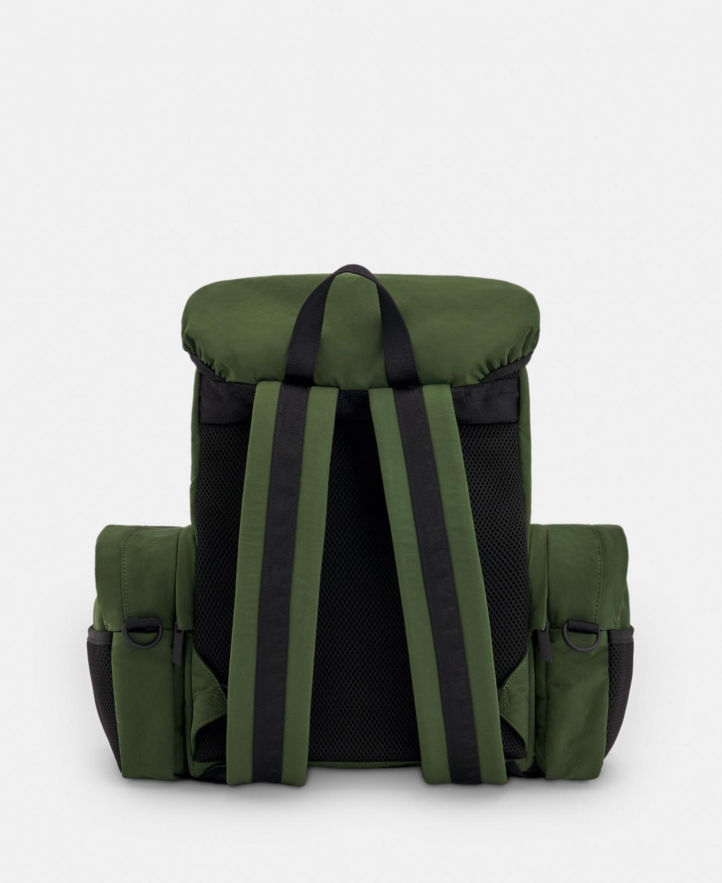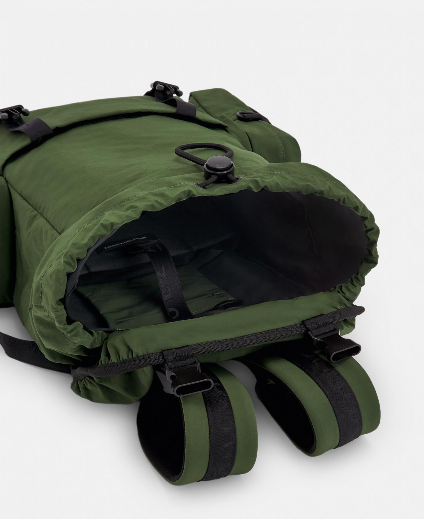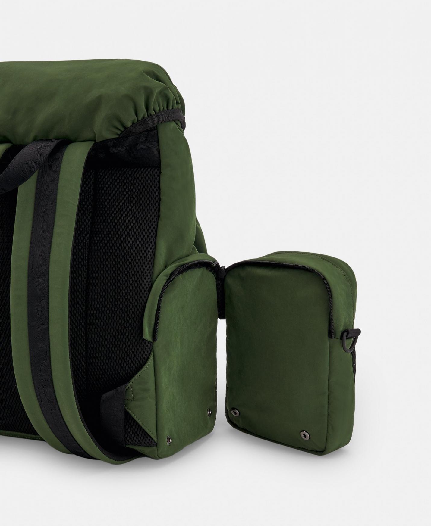 Mochila modular con bandoleras laterales desmontables en poliéster reciclado. Tiene un compartimento con cierre de estrangulador y solapa con cierre de doble cinta de nylon. Los bolsillos laterales, unidos por cremallera, se transforman en bandolera.
