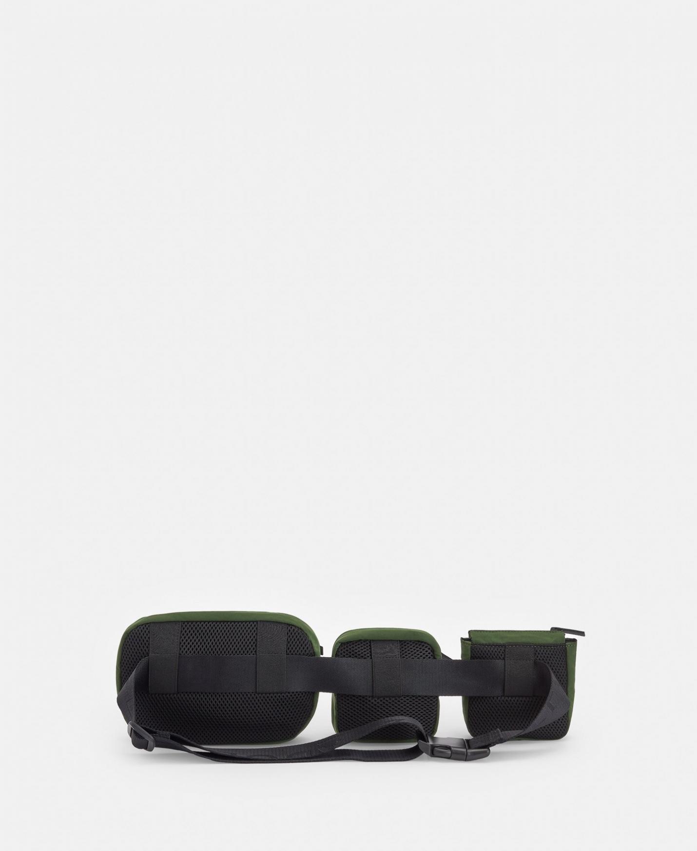 Riñonera modular en tres cuerpos en poliéster reciclado. Cada cuerpo es independiente y tienen cierre de cremallera, uno de ellos con bolsillo exterior con solapa. Correa de nylon.