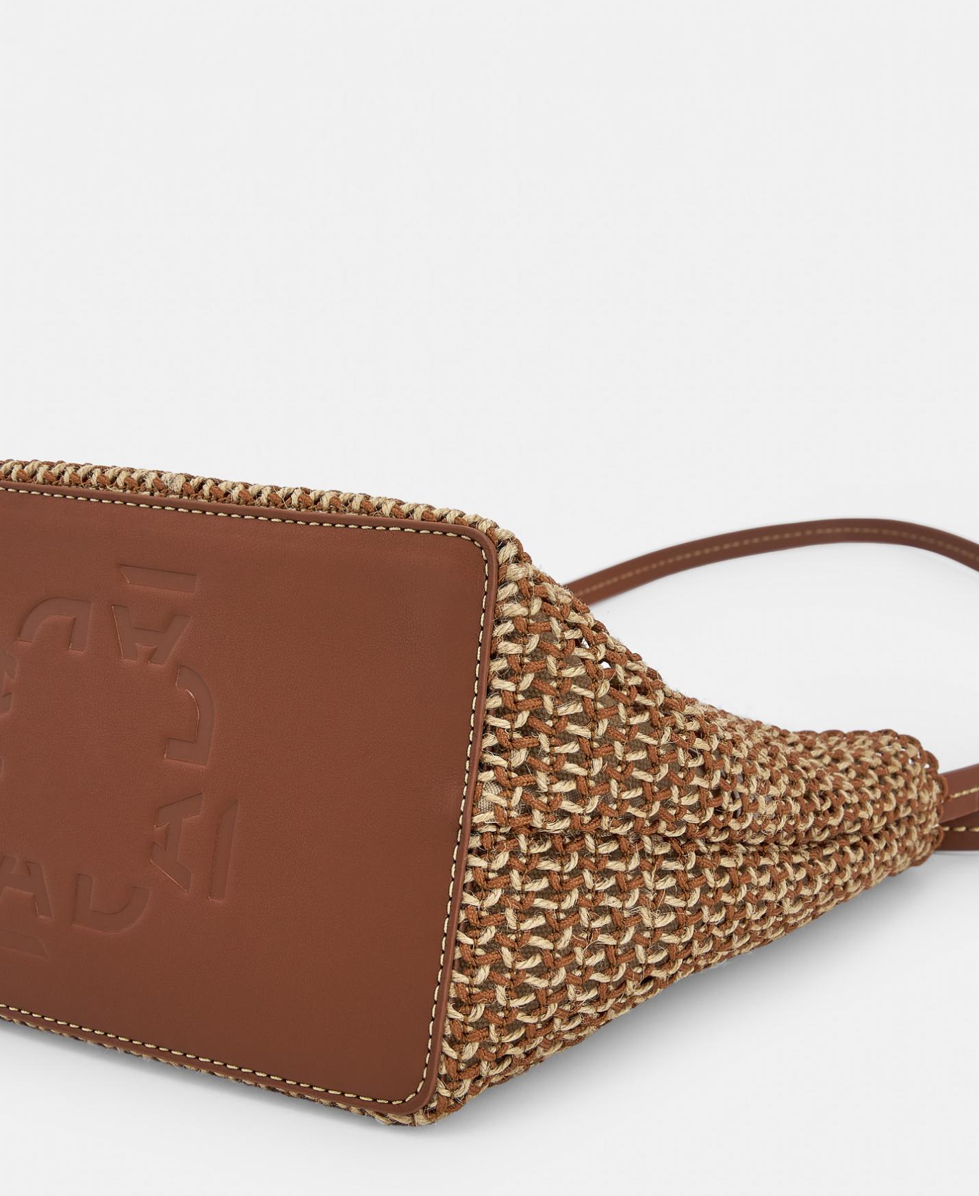 Saco en rafia de poliéster reciclado y yute. Tiene un compartimento, asa corta de mano y larga regulable y bolsa interior extraible de algodón reciclado.