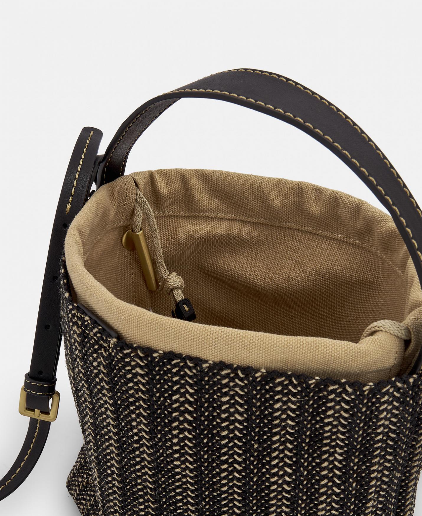 Saco en rafia de poliéster reciclado y yute. Tiene un compartimento, asa corta de mano y larga regulable y bolsa interior extraible de algodón reciclado.