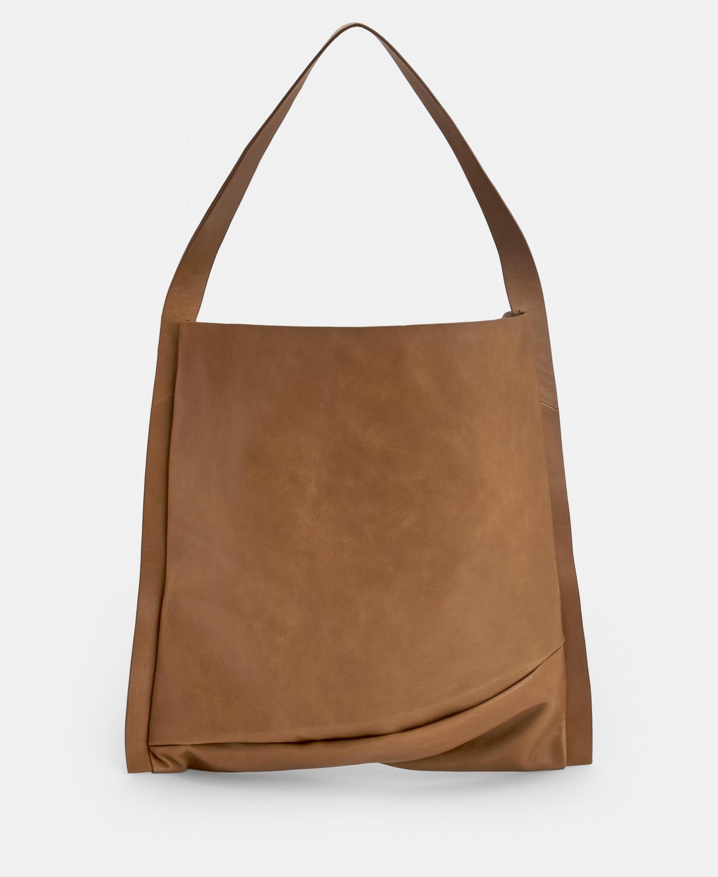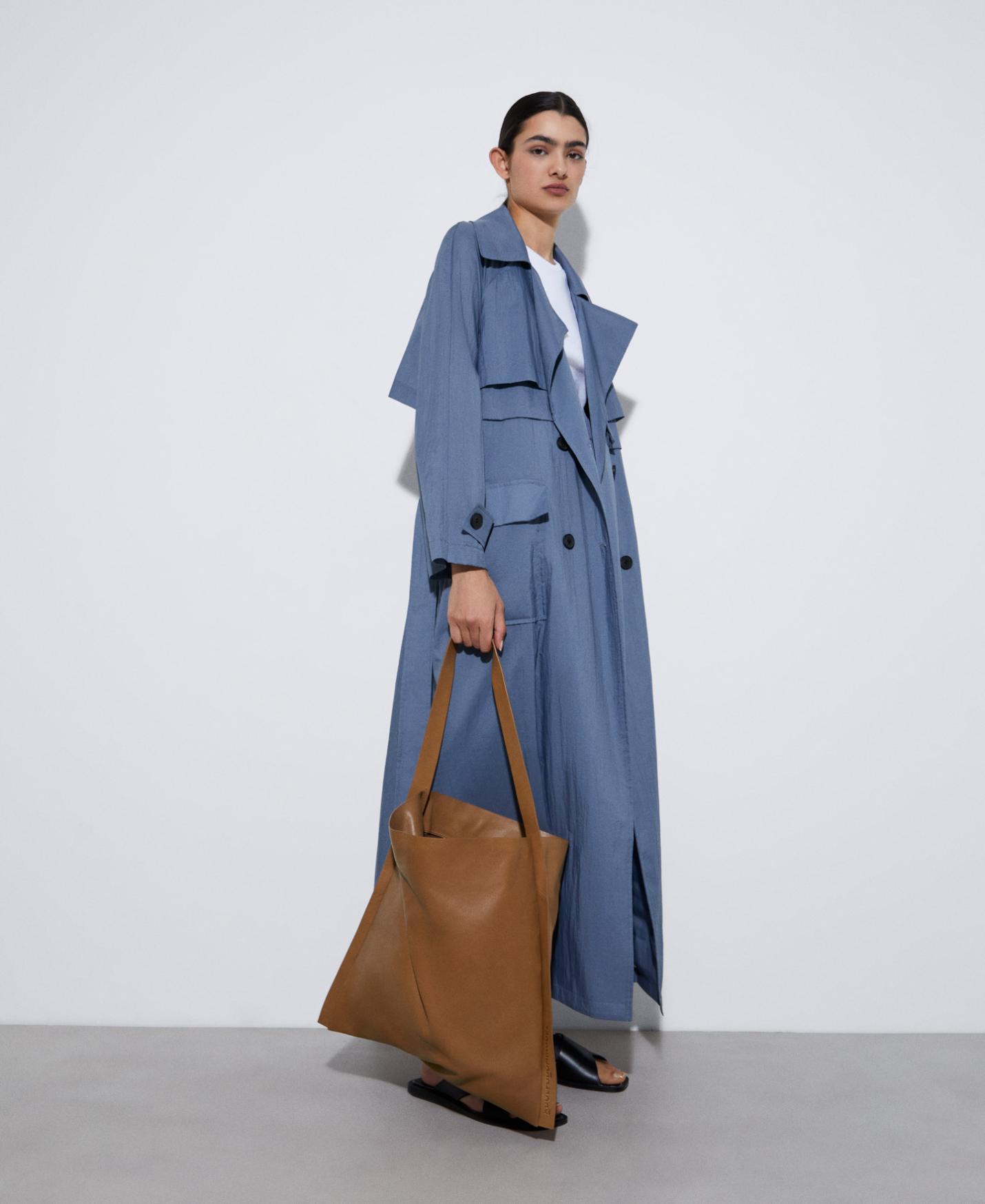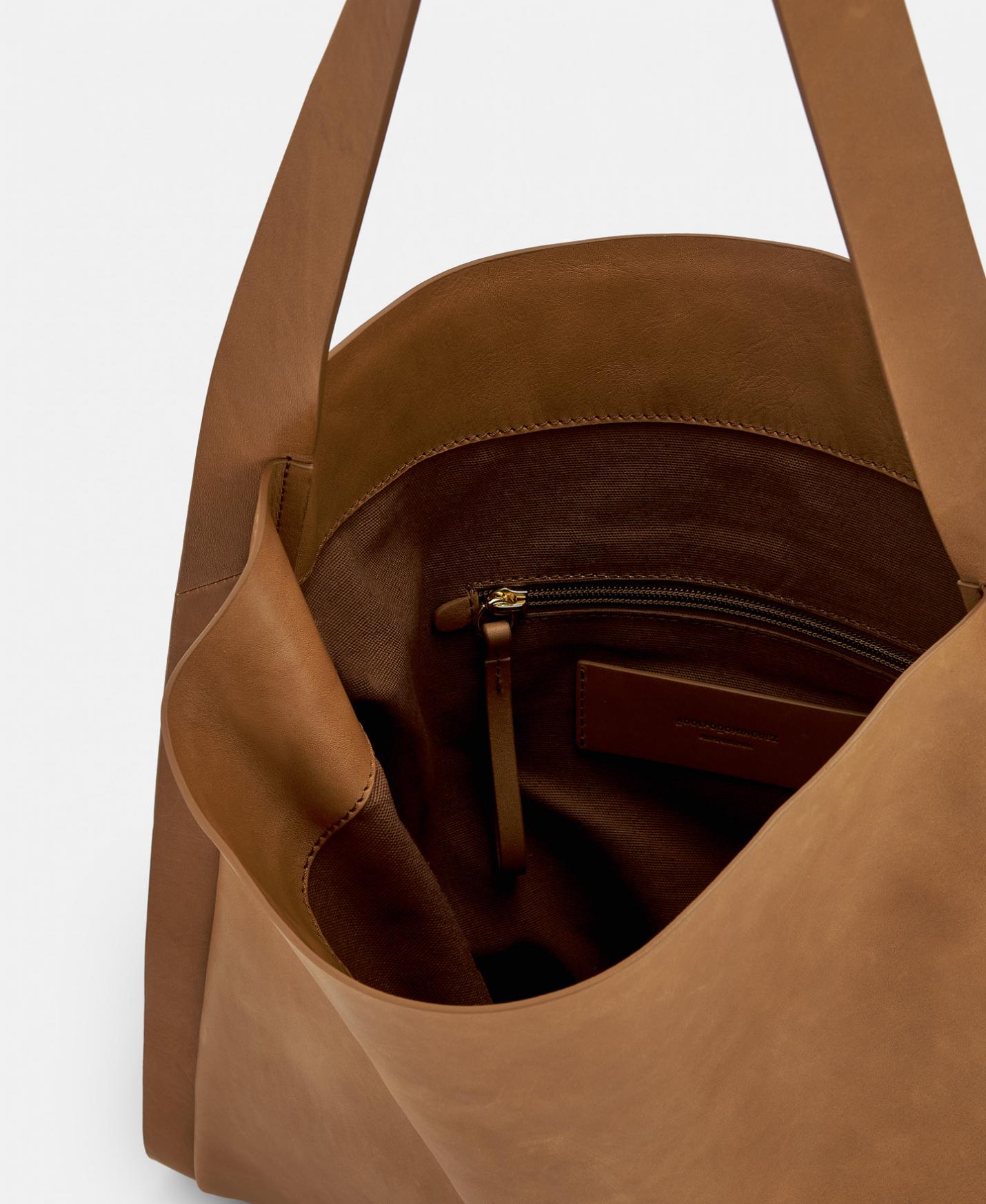 Shopper en piel responsable. Tiene pliegues en delantero y trasero para conseguir un volumen especial. Un compartimento y bolsillos interiores en canvas de algodón orgánico. Hecho en España.