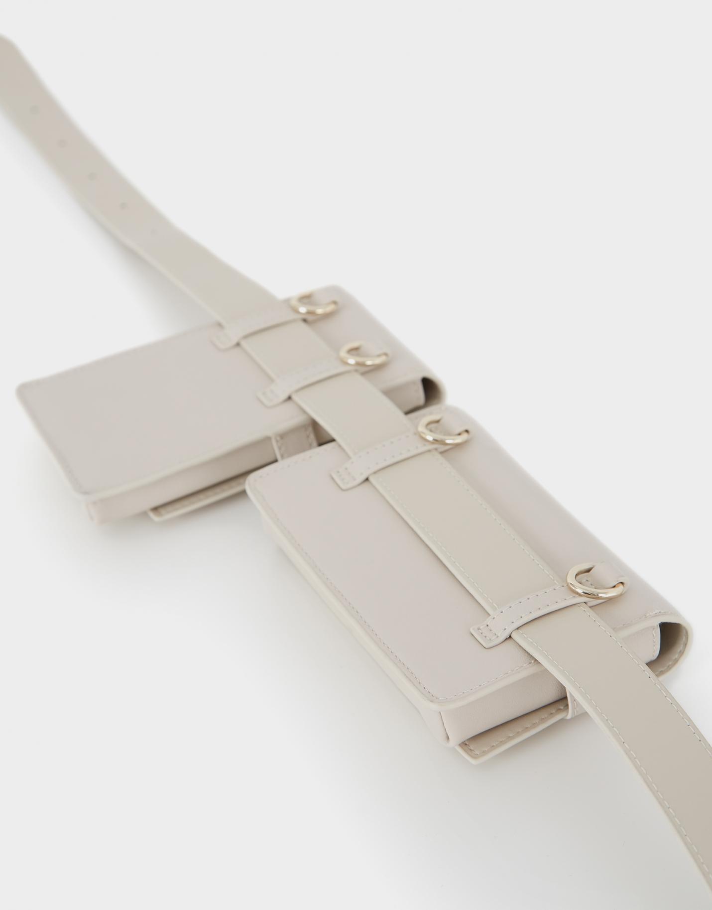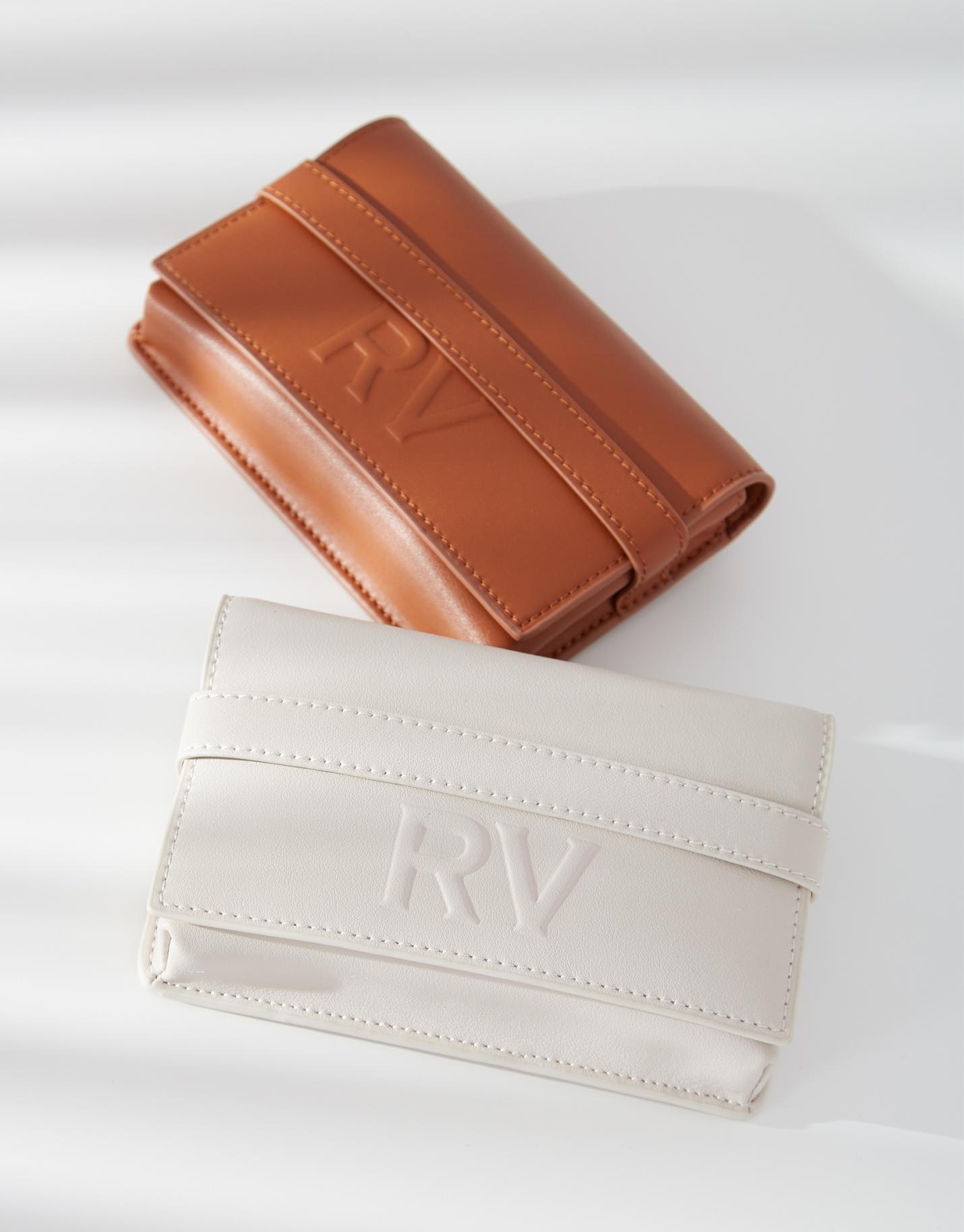 Bolso bandolera pequeño fabricado en piel color crudo con cierre de tapeta y logo en relieve en la parte delantera. Construcción semirrígida, asa bandolera regulable y acabados metálicos en oro quiaro. Medidas aproximadas: 16,5 x 10 x 2,5 cm. Asa regulable: 114 x 1 cm.