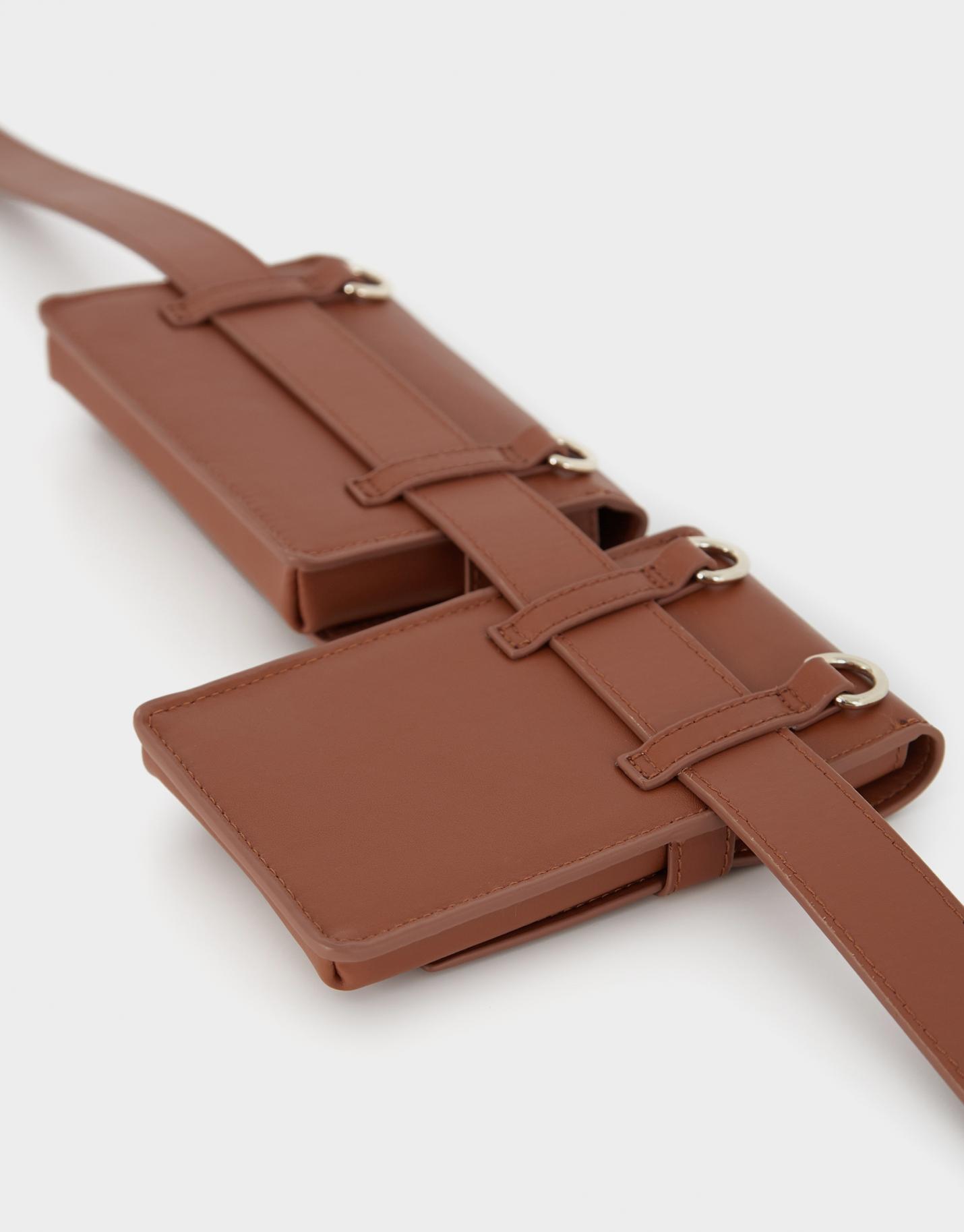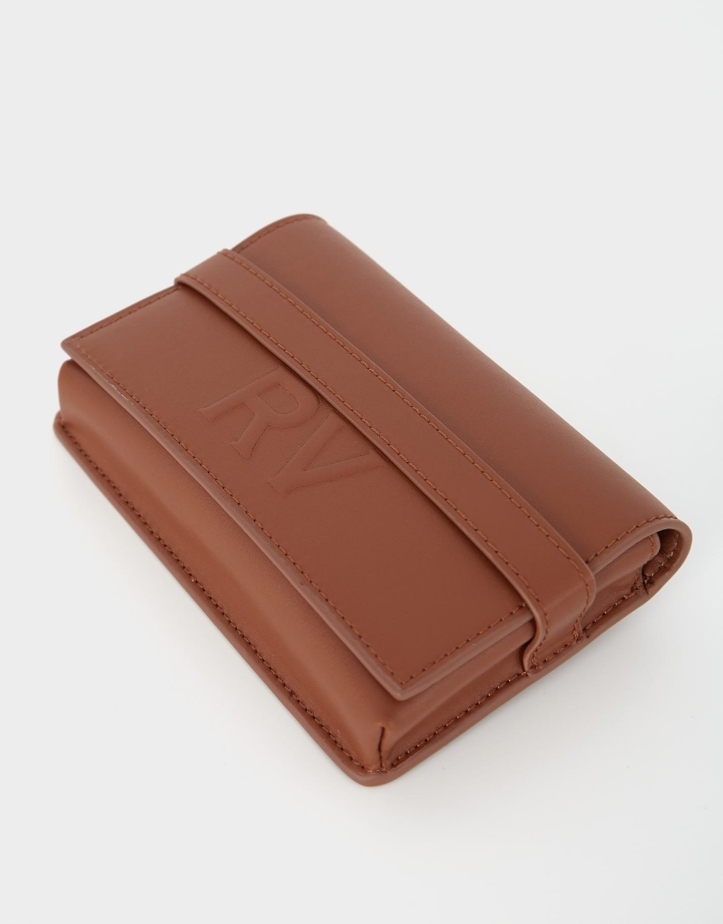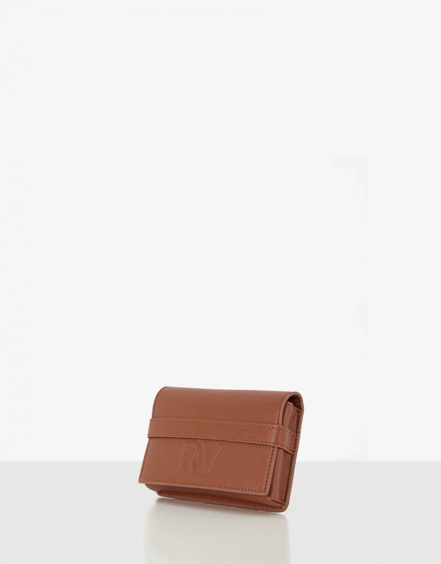 Bolso bandolera pequeño fabricado en piel color cuero con cierre de tapeta y logo en relieve en la parte delantera. Construcción semirrígida, asa bandolera regulable y acabados metálicos en oro quiaro. Medidas aproximadas: 16,5 x 10 x 2,5 cm. Asa regulable: 114 x 1 cm.