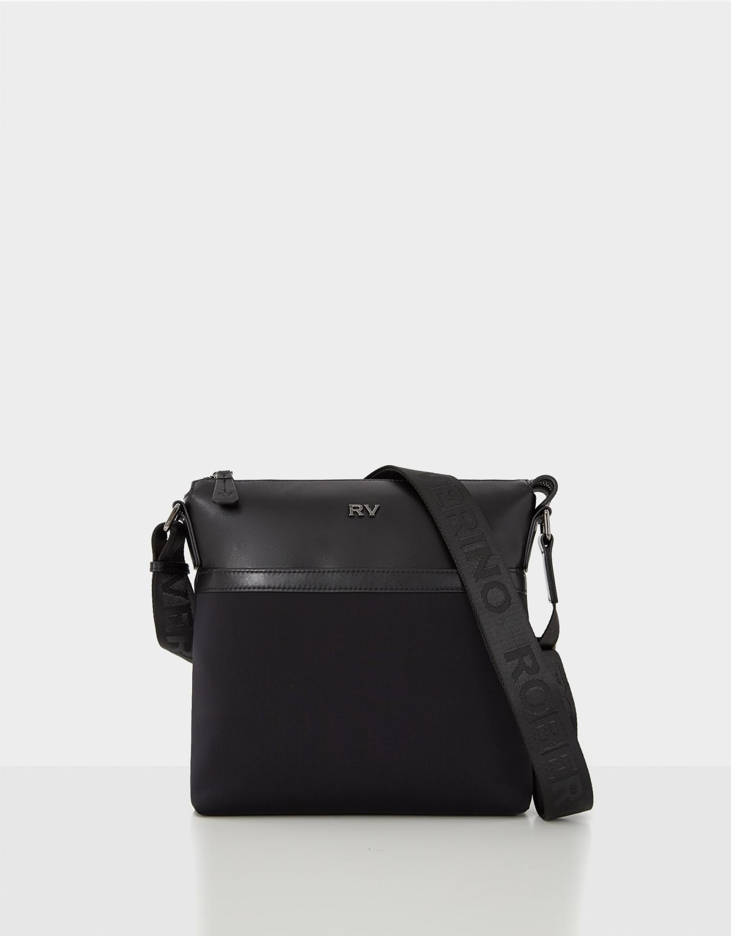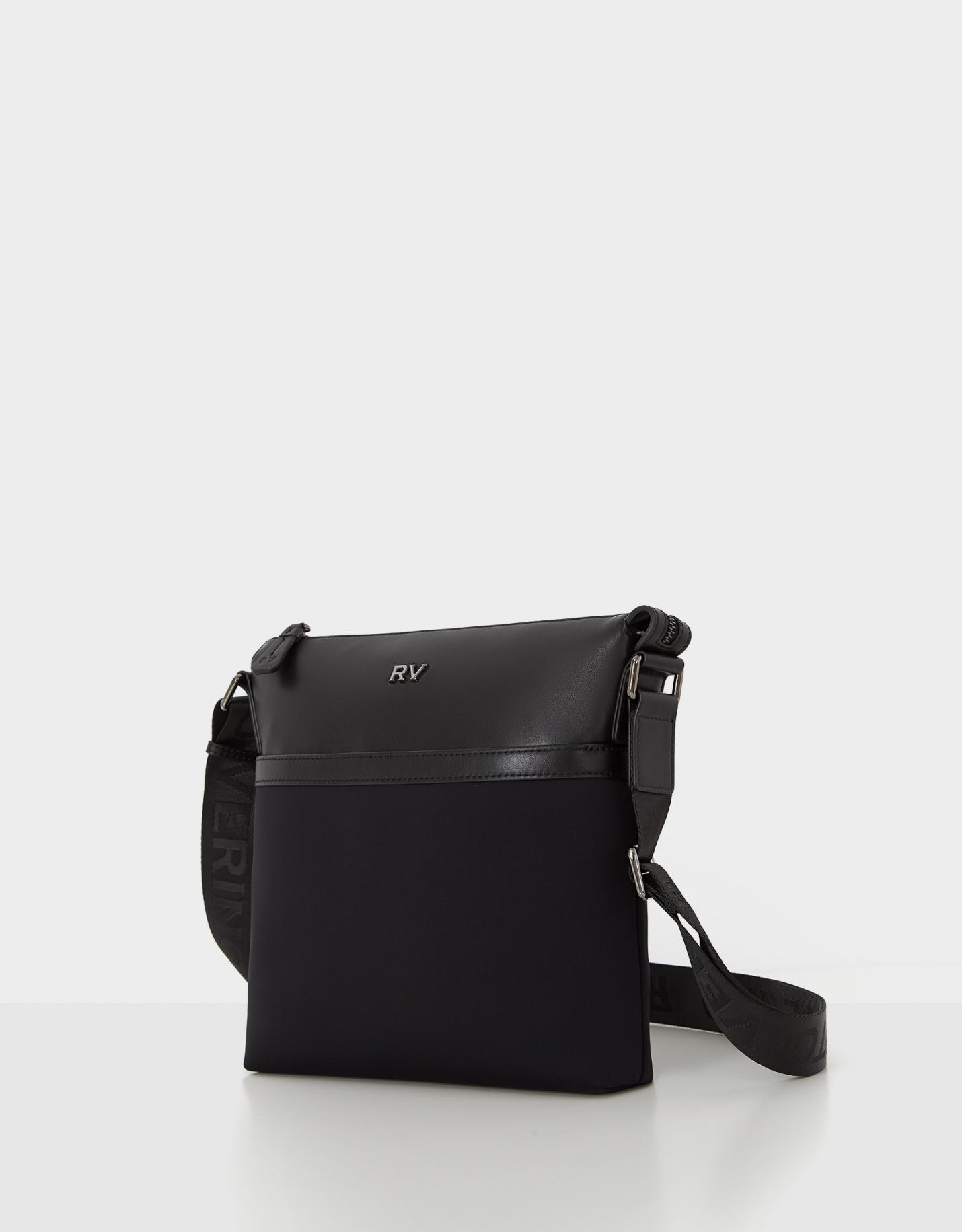 Bolso bandolera masculino fabricado en neopreno y piel color negro con asa de nastro personalizada y regulable. Bolsillo exterior abierto de neopreno con bies de piel y logo metálico RV en delantero. Cierre superior de cremallera con tiradores de piel personalizado, interior forrado y compartimentado. Medidas aproximadas: 27 x 27 x 8 cm. Medidas asa: de 139,5 a 77 cm