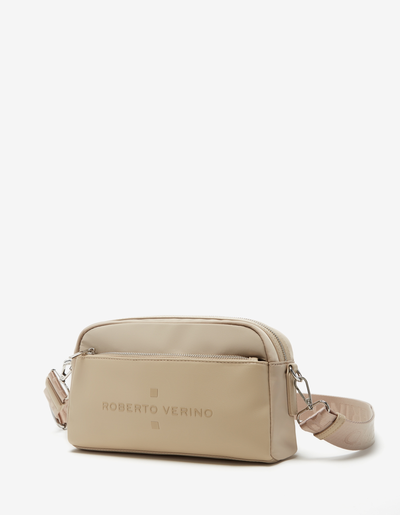 Bolso bandolera fabricado en tejido técnico de nailon en color arena con bolsillo de cremallera en frontal y m…