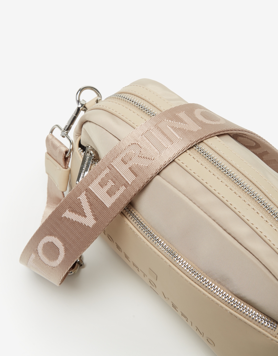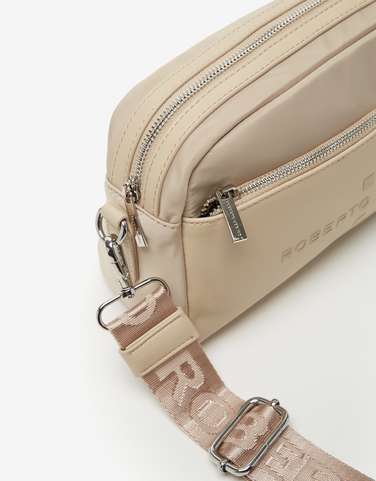 Bolso bandolera fabricado en tejido técnico de nailon en color arena con bolsillo de cremallera en frontal y maxi logo grabado. Asa bandolera regulable y cierre de cremallera con interior compartimentado y personalizado. Acabados metálicos en oro chiaro. Medidas: 26 x 15 x 9 cm. Asa bandolera regulable de 86 a 154 cm
