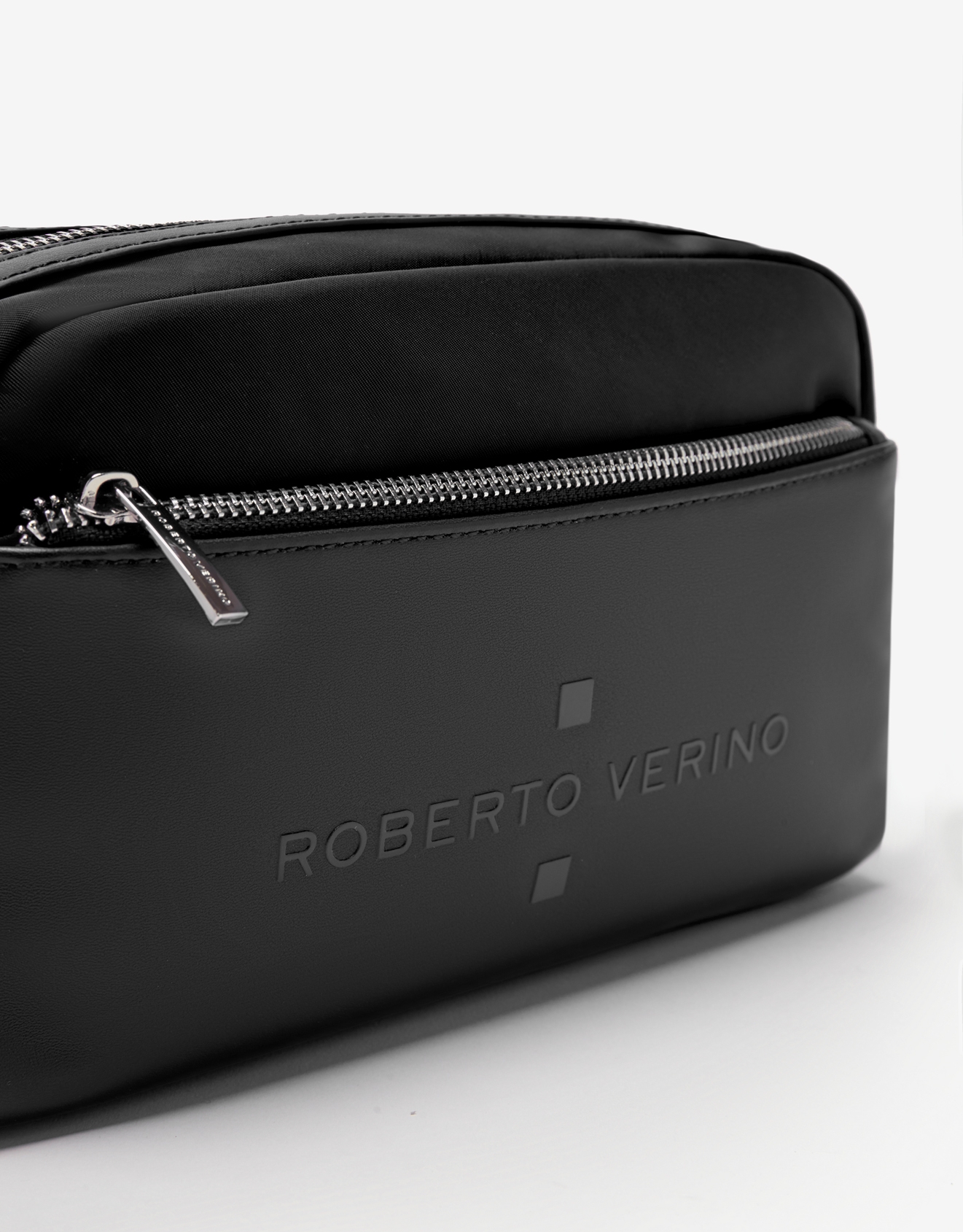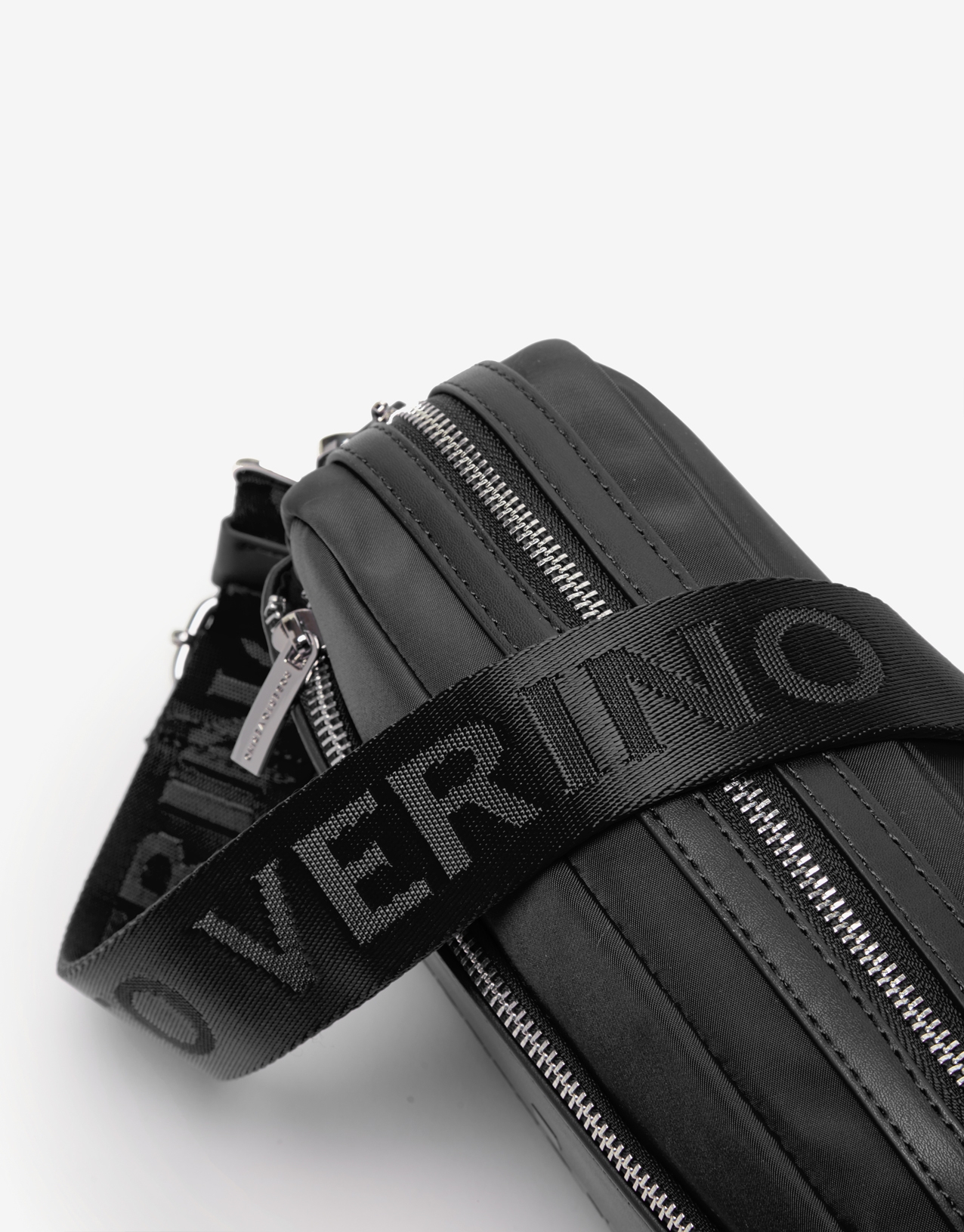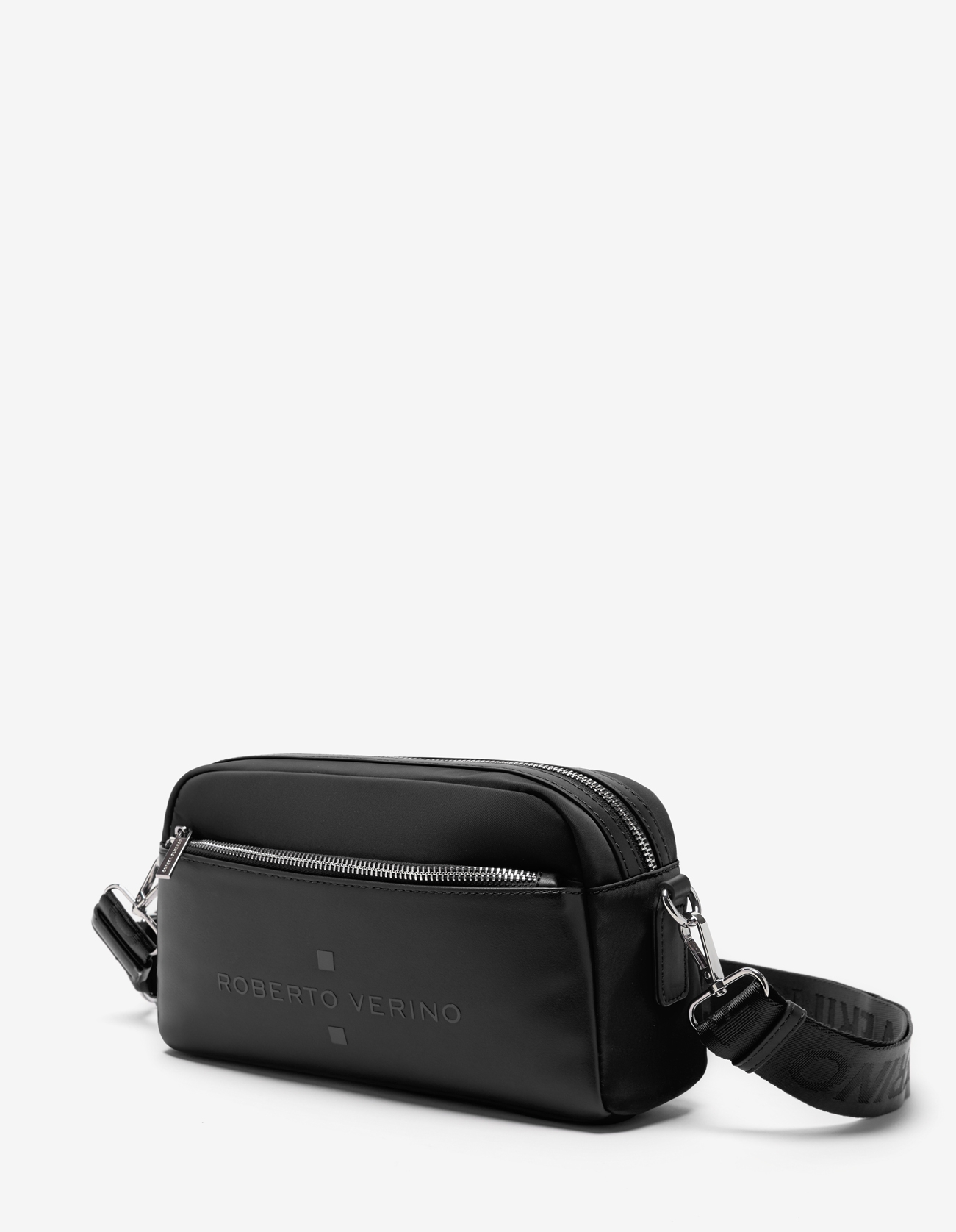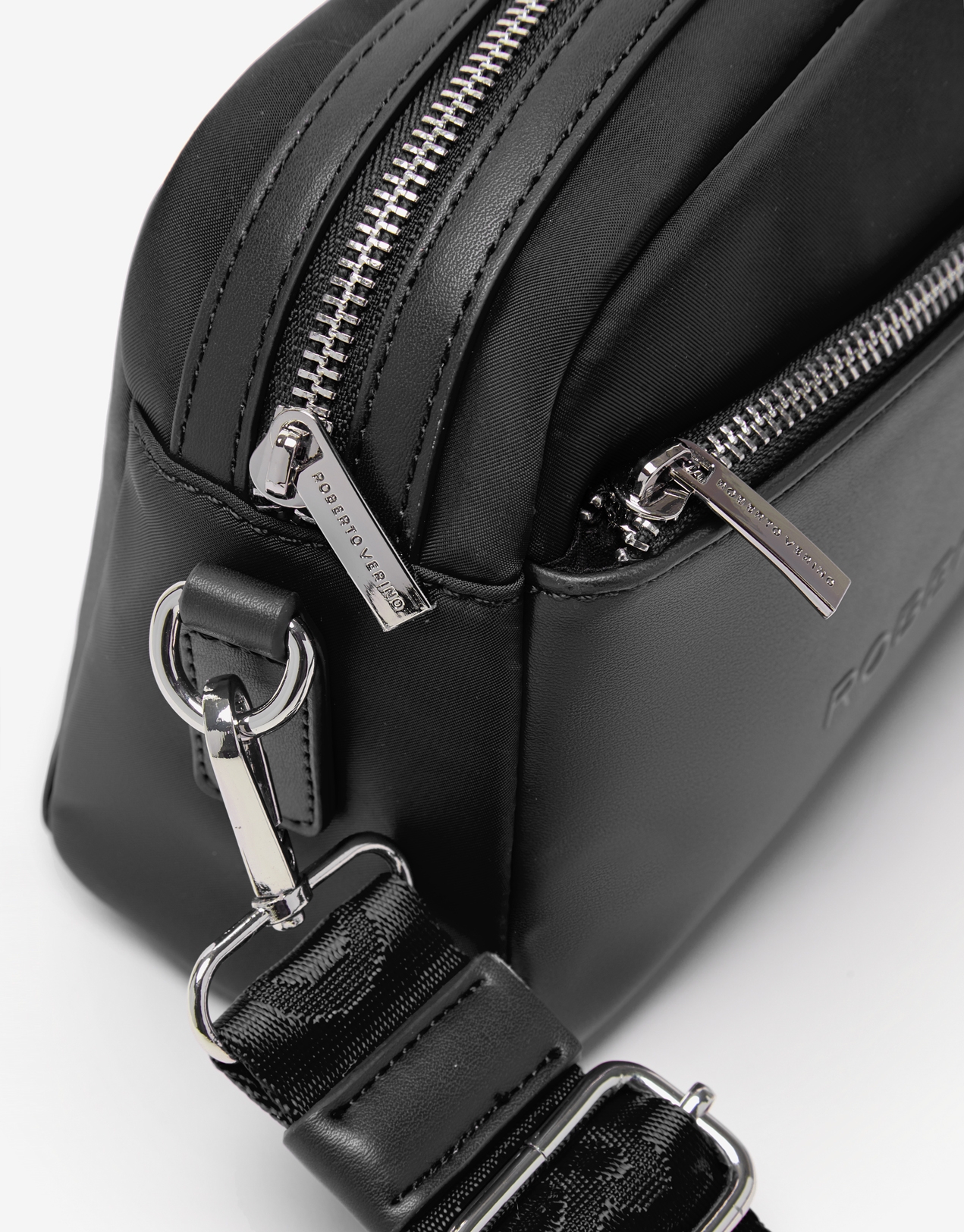 Bolso bandolera fabricado en tejido técnico de nailon en color negro con bolsillo de cremallera en frontal y maxi logo grabado. Asa bandolera regulable y cierre de cremallera con interior compartimentado y personalizado. Acabados metálicos en oro chiaro. Medidas: 26 x 15 x 9 cm. Asa bandolera regulable de 86 a 154 cm