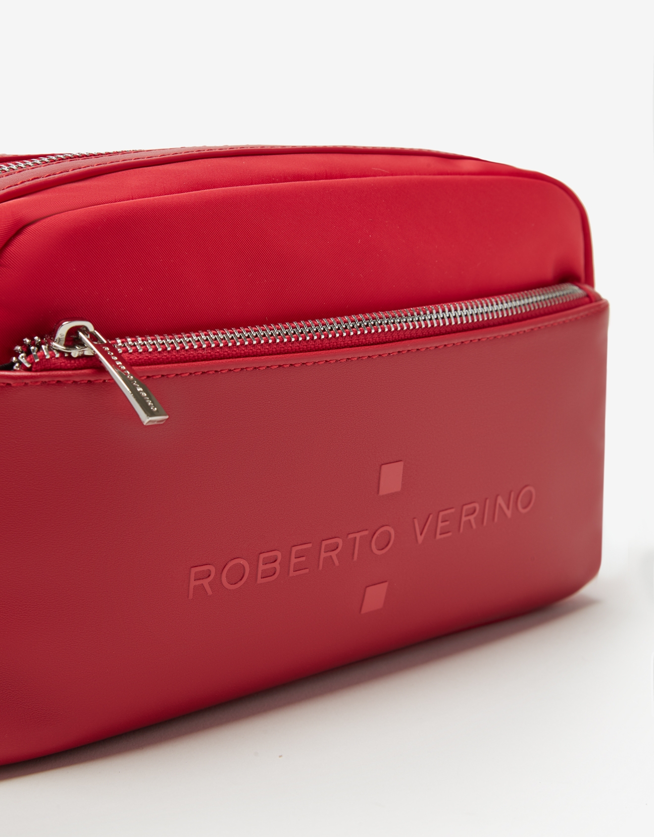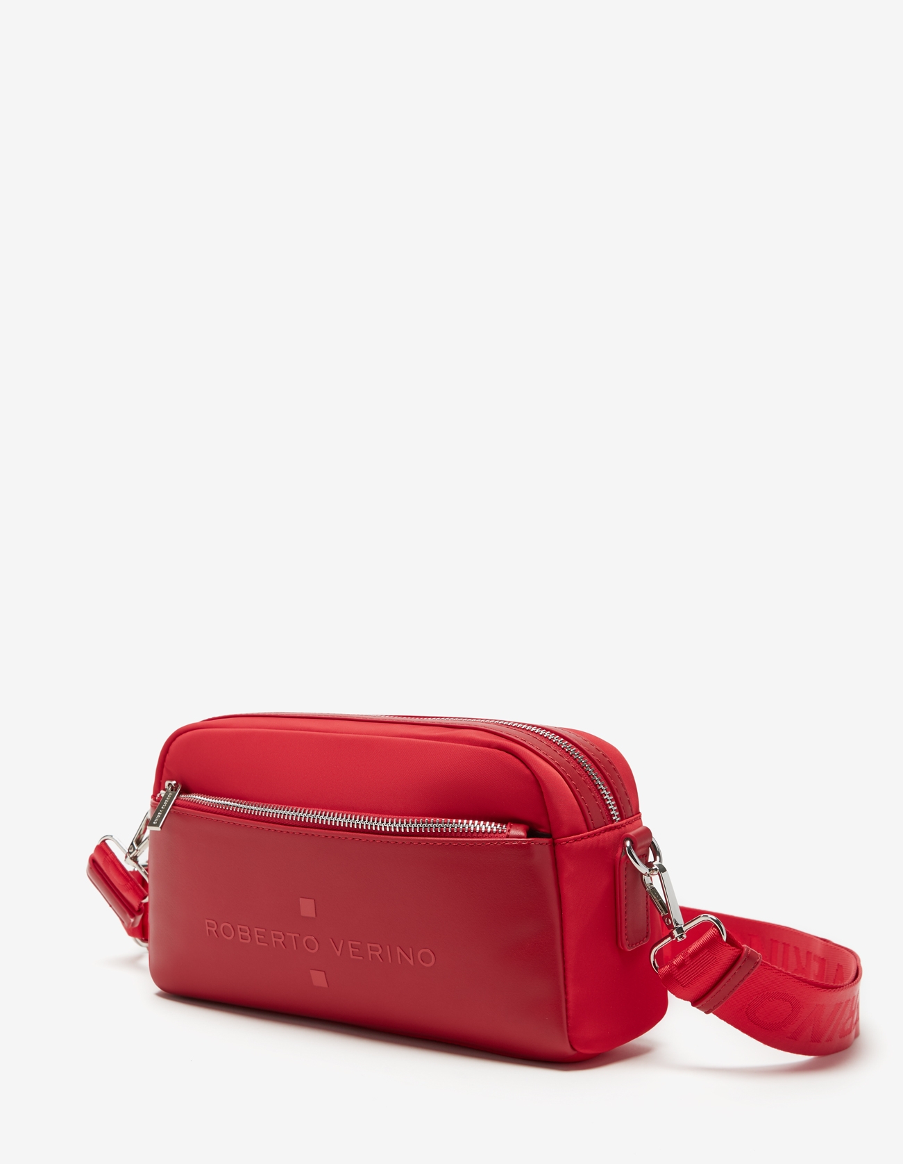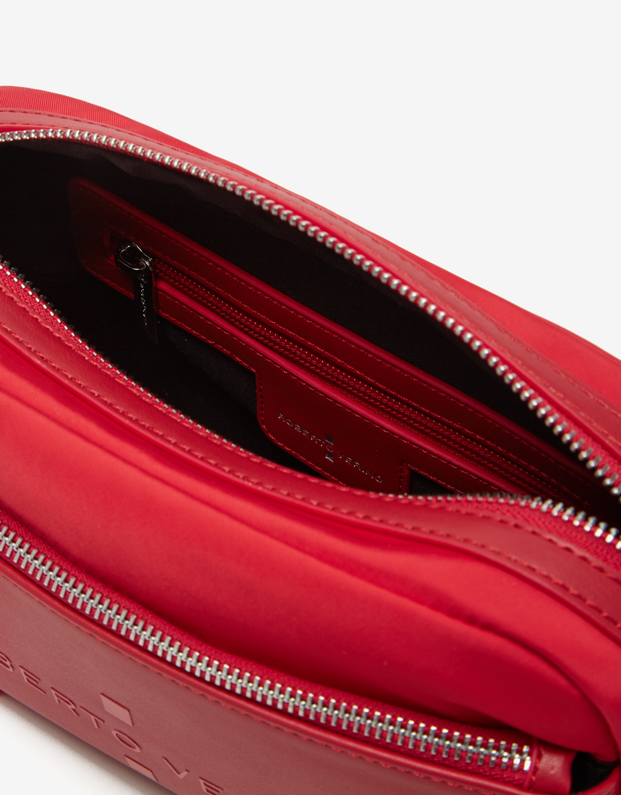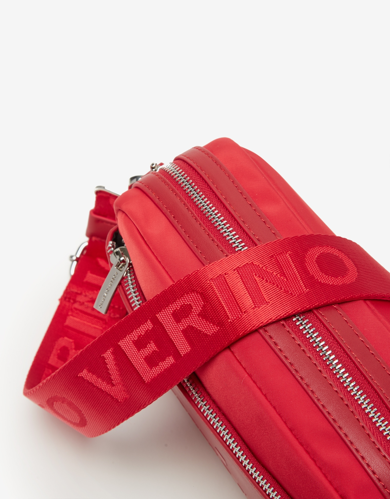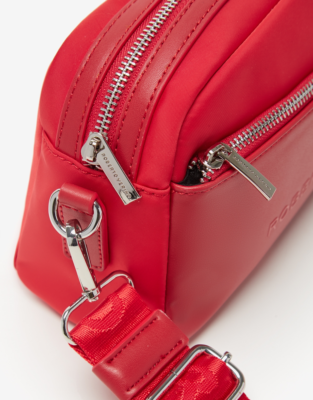 Bolso bandolera fabricado en tejido técnico de nailon en color rojo con bolsillo de cremallera en frontal y maxi logo grabado. Asa bandolera regulable y cierre de cremallera con interior compartimentado y personalizado. Acabados metálicos en oro chiaro. Medidas: 26 x 15 x 9 cm. Asa bandolera regulable de 86 a 154 cm