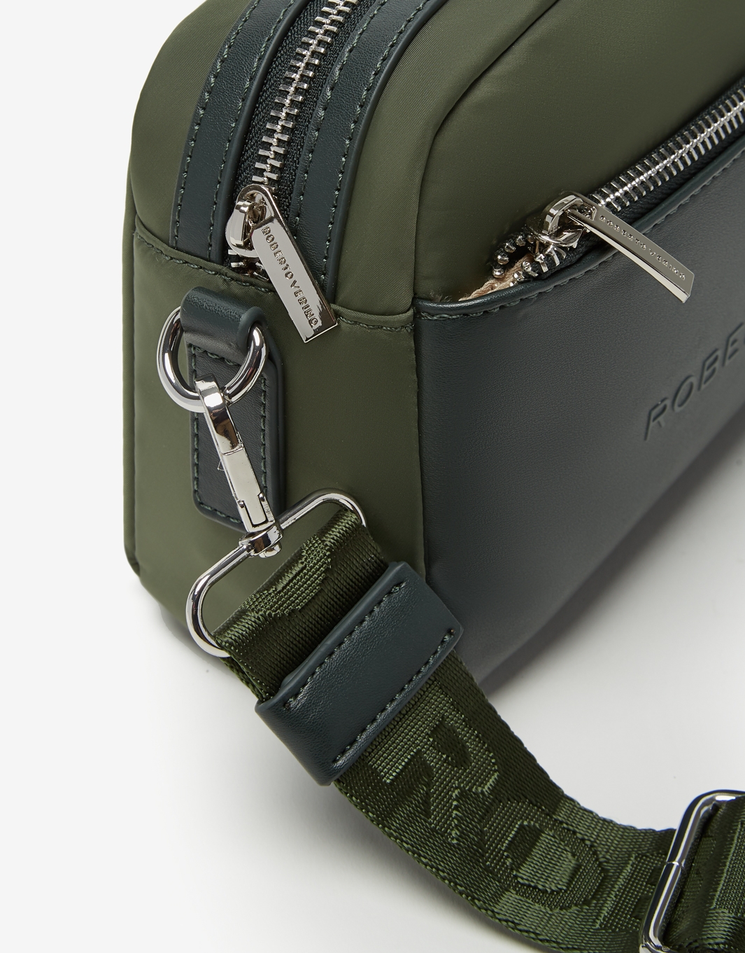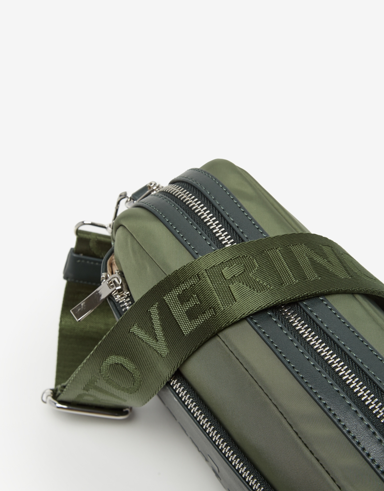 Bolso bandolera fabricado en tejido técnico de nailon en color verde con bolsillo de cremallera en frontal y maxi logo grabado. Asa bandolera regulable y cierre de cremallera con interior compartimentado y personalizado. Acabados metálicos en oro chiaro. Medidas: 26 x 15 x 9 cm. Asa bandolera regulable de 86 a 154 cm