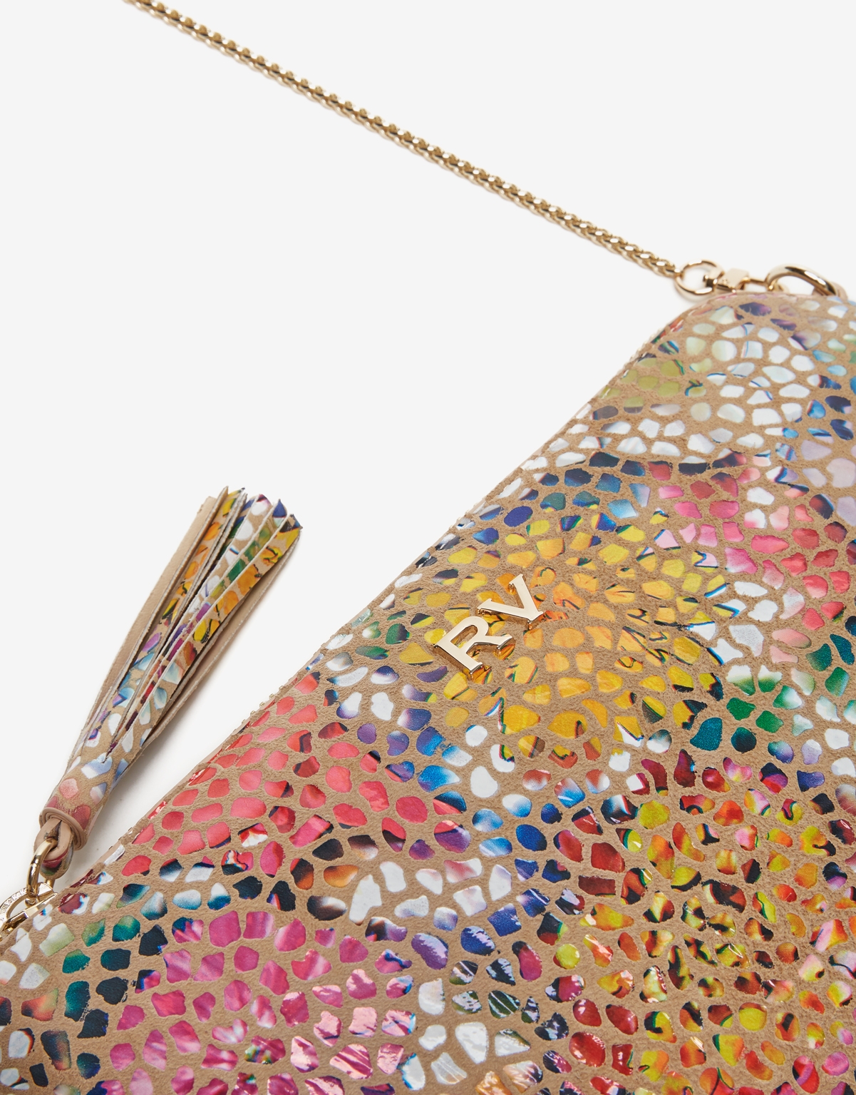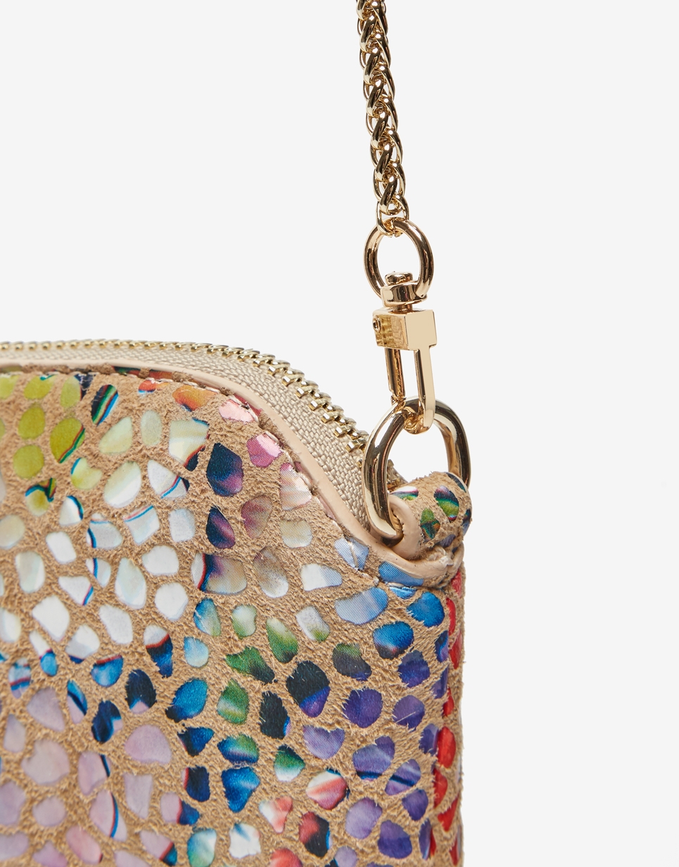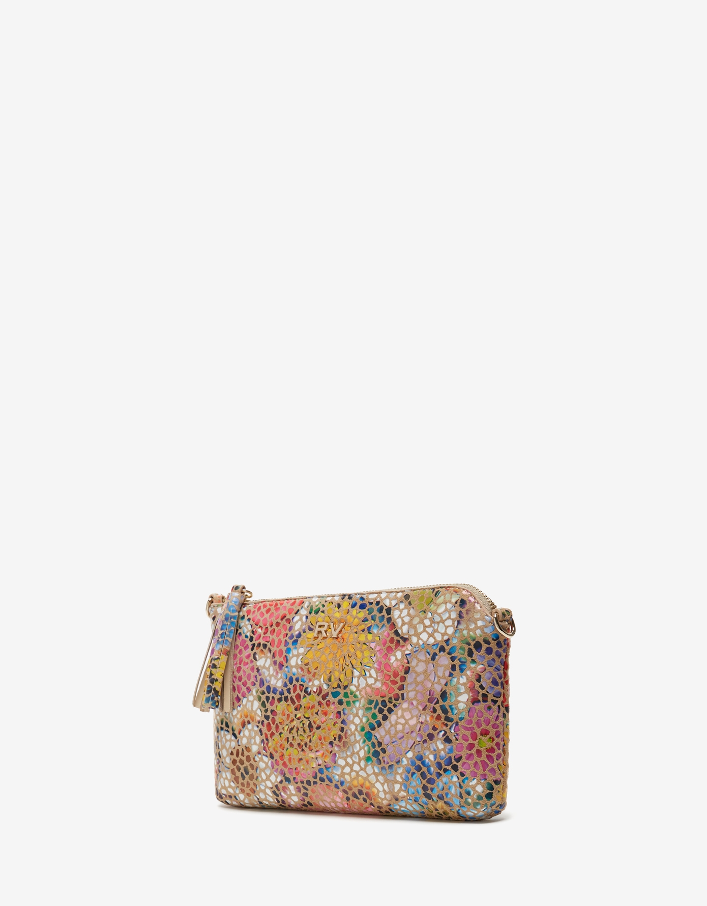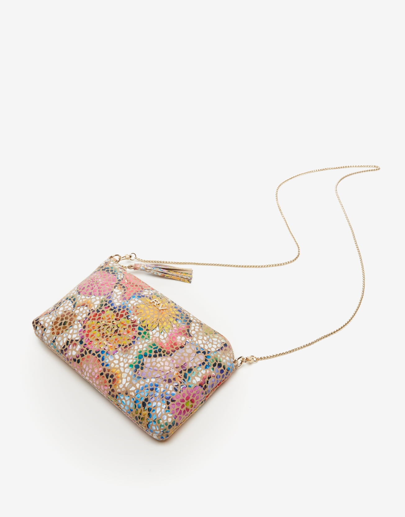 Bolso clutch pequeño fabricado en piel con lámina de estampado floral multicolor. Cierre con cremallera acompañado de tirador con flecos en piel y logo clásico grabado en oro chiaro. Cadena metálica extraíble de 110 cm. Medidas 23 cm x 12 cm.
