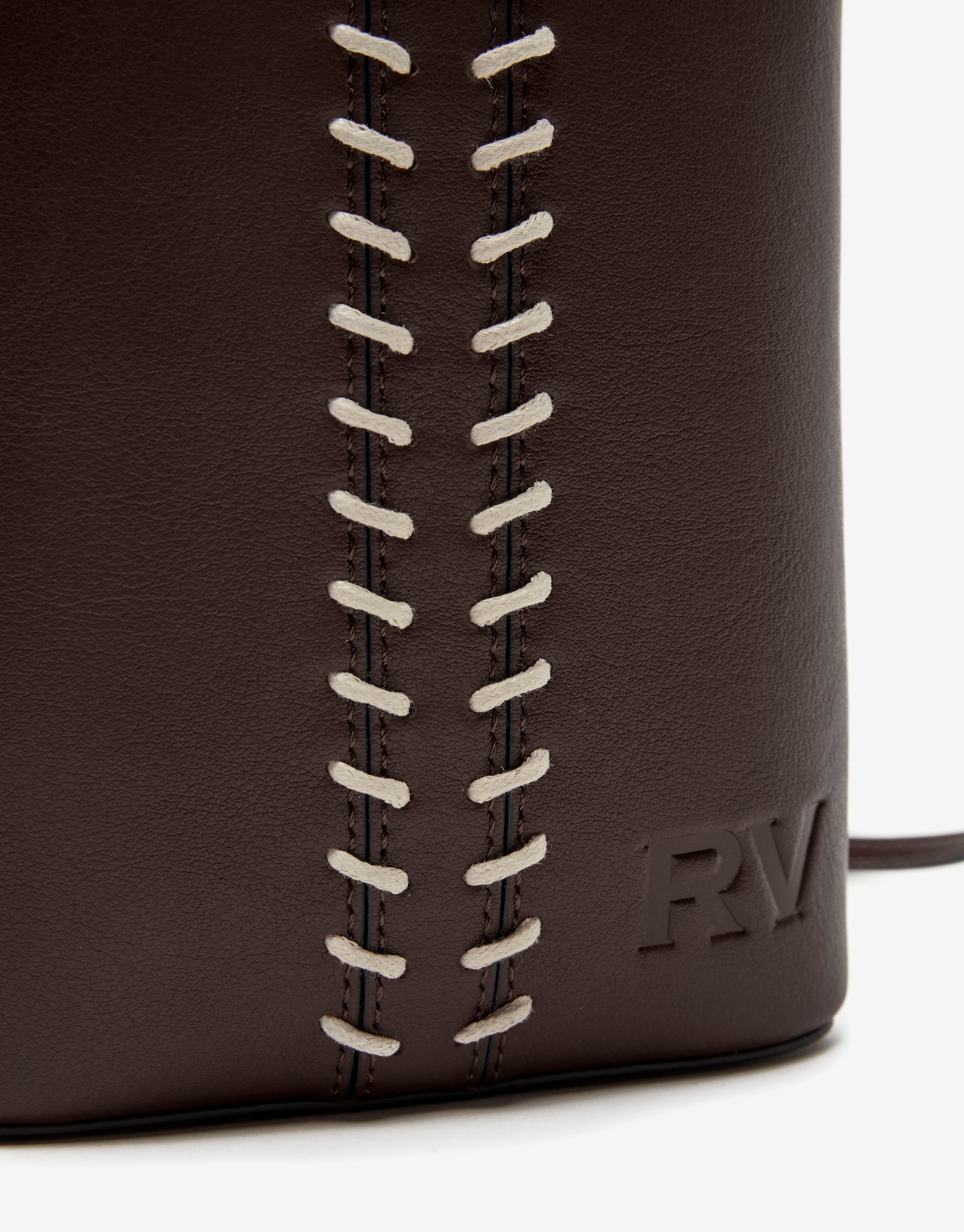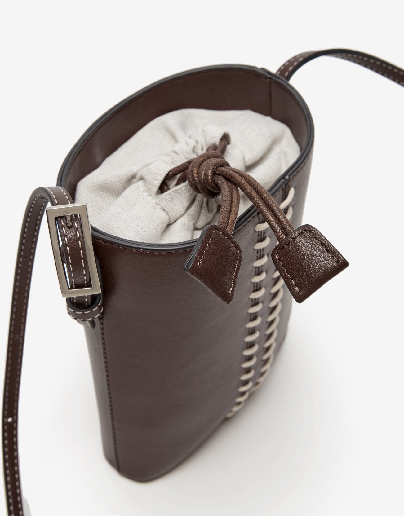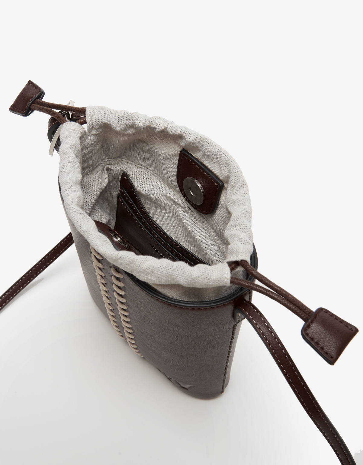 Bolso de hombro mini fabricado en piel color marrón con un compartimento principal forrado con tela de lino y cerrado con cordón. Panel delantero con pespunte decorativo hecho a mano y logo grabado en el frontal. Asa regulable hecha en piel de 128 x1 cm. Acabados metálicos en plateado. Medidas aproximadas: 19 x 18,5 x 4 cm
