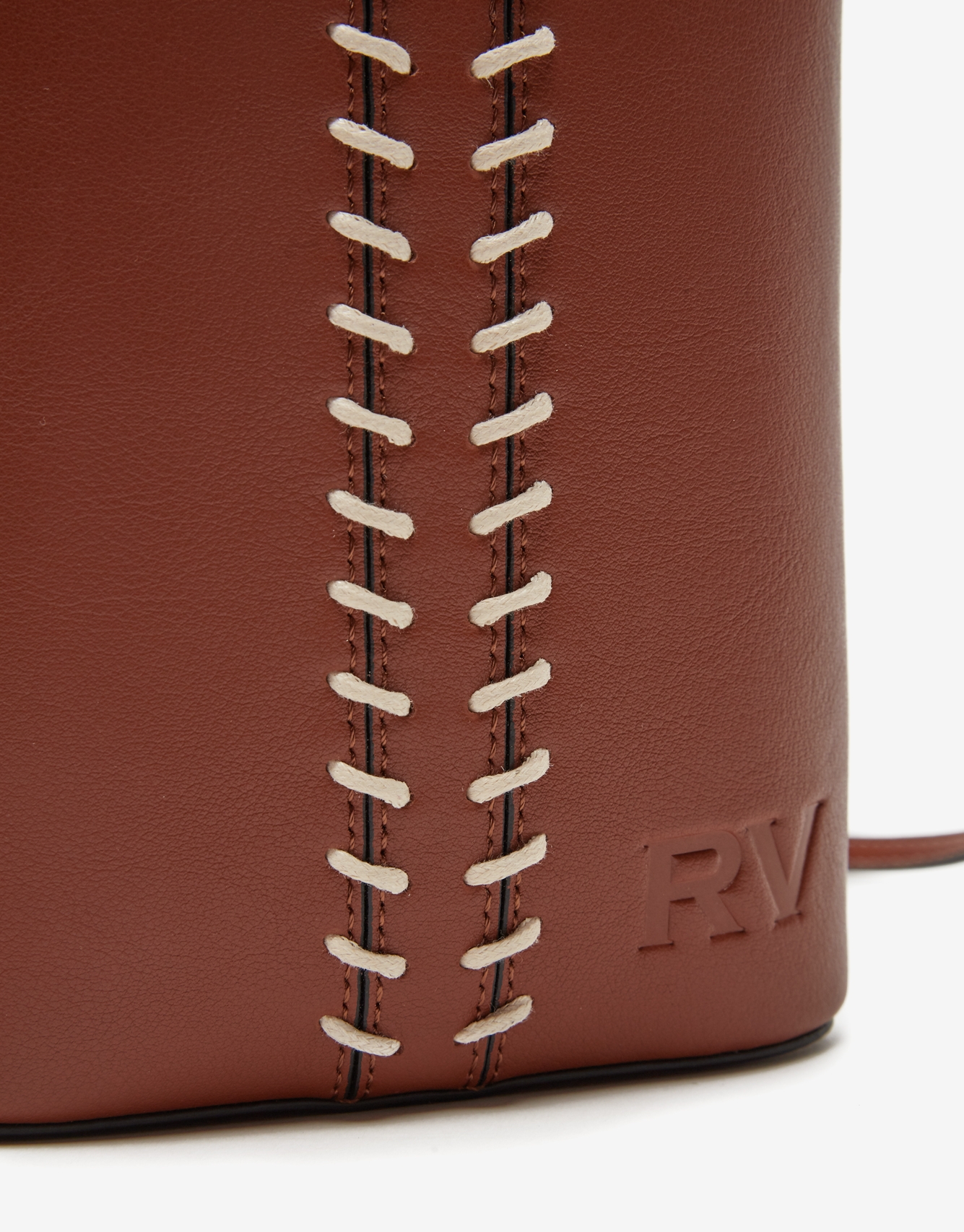 Bolso de hombro mini fabricado en piel color cuero con un compartimento principal forrado con tela de lino y cerrado con cordón. Panel delantero con pespunte decorativo hecho a mano y logo grabado en el frontal. Asa regulable hecha en pi…