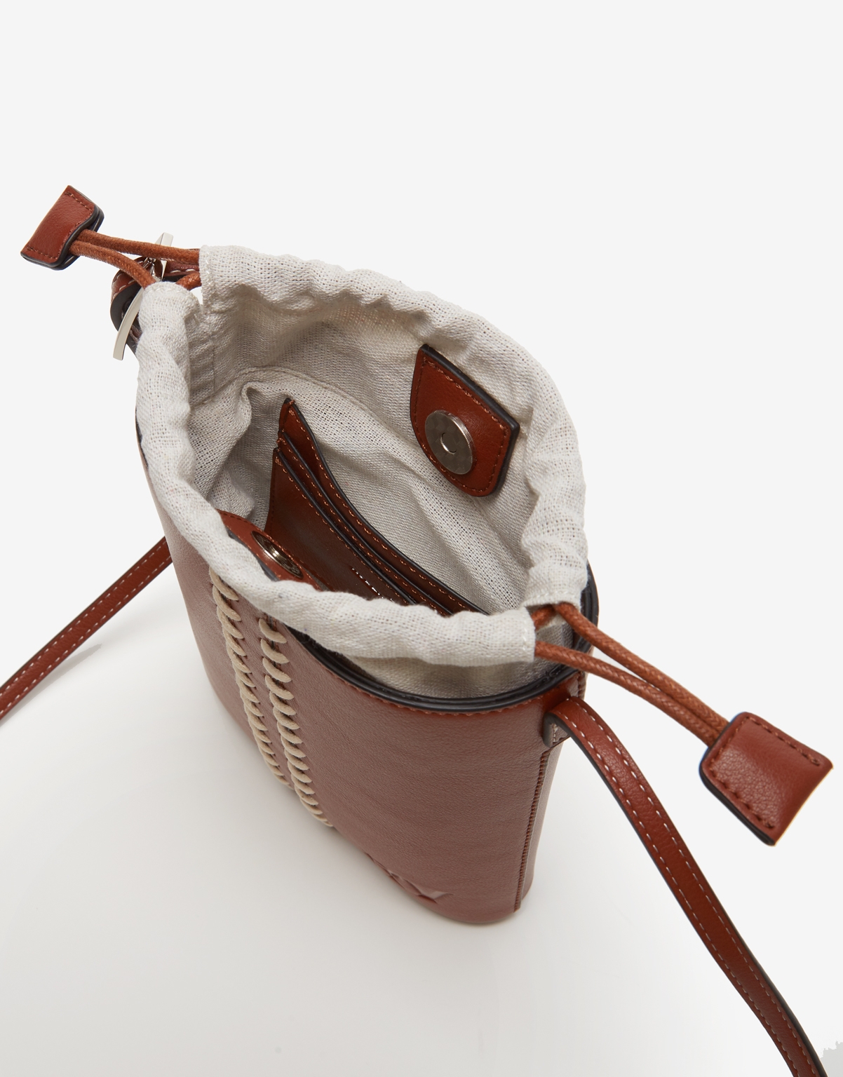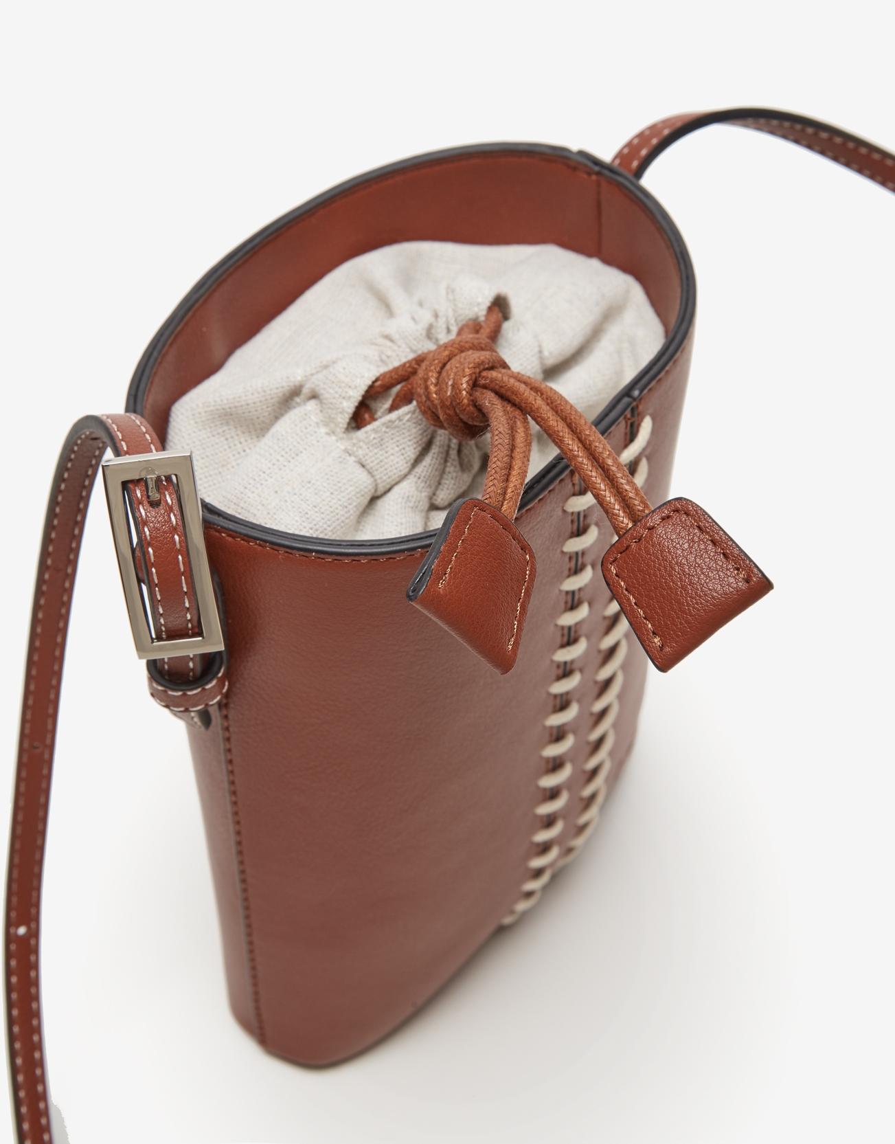 Bolso de hombro mini fabricado en piel color cuero con un compartimento principal forrado con tela de lino y cerrado con cordón. Panel delantero con pespunte decorativo hecho a mano y logo grabado en el frontal. Asa regulable hecha en piel de 128 x1 cm. Acabados metálicos en plateado. Medidas aproximadas: 19 x 18,5 x 4 cm