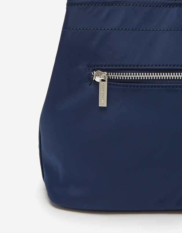 Bolso de hombro pequeño fabricado en tejido de nailon color azul marino con tres bolsillos cerrados con imán y cremallera en el centro. Maxi logo grabado a tono en frontal y acabados metálicos en plateado. Interior forrado y compartimentado. Medidas: 24 x 22 x 13,5 cm. Altura asa: 19 cm.