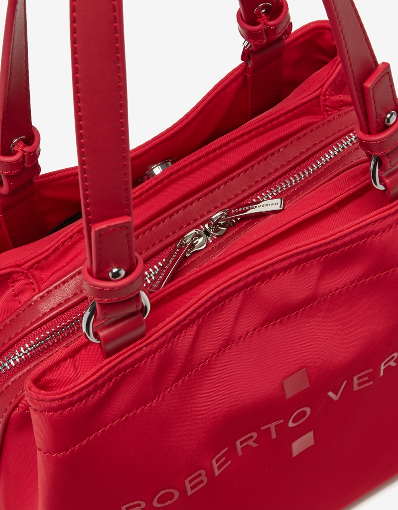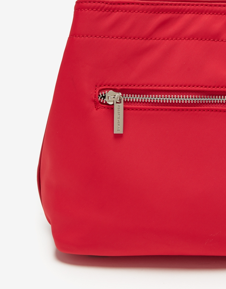 Bolso de hombro pequeño fabricado en tejido de nailon color granate con tres bolsillos cerrados con imán y cremallera en el centro. Maxi logo grabado a tono en frontal y acabados metálicos en plateado. Interior forrado y compartimentado. Medidas: 24 x 22 x 13,5 cm. Altura asa: 19 cm.