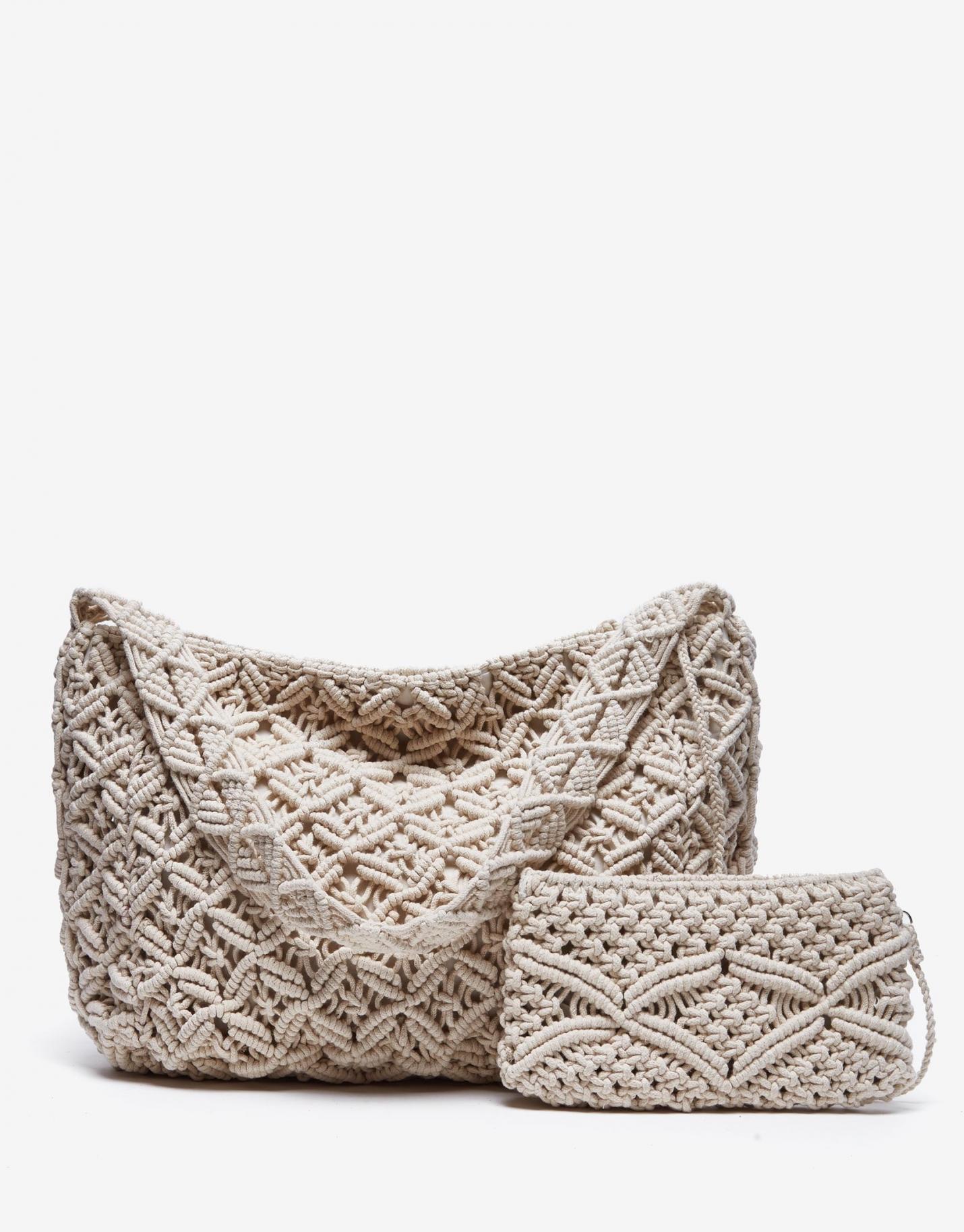 Bolso maxi hobo tejido a mano en un macramé de algodón color crudo y con un mini bolso plano de igual acabado en el interior, unido con un cordón …