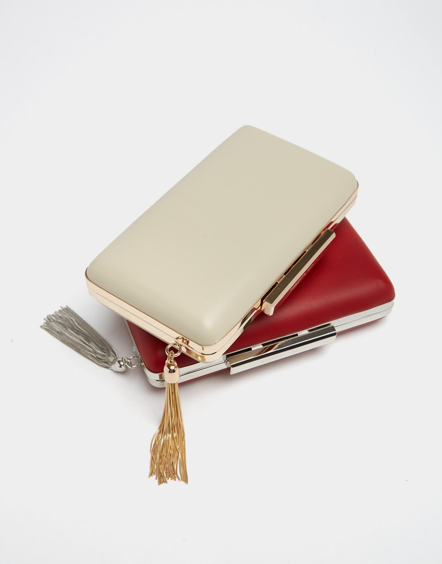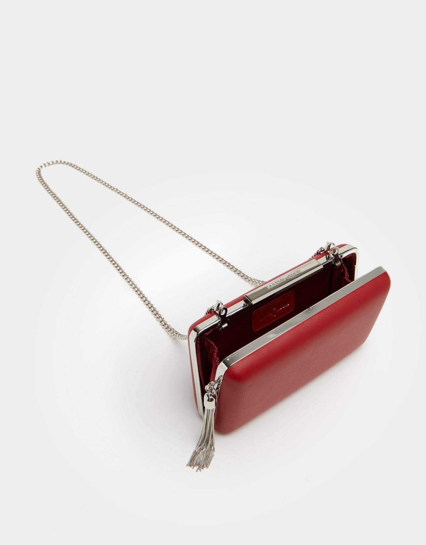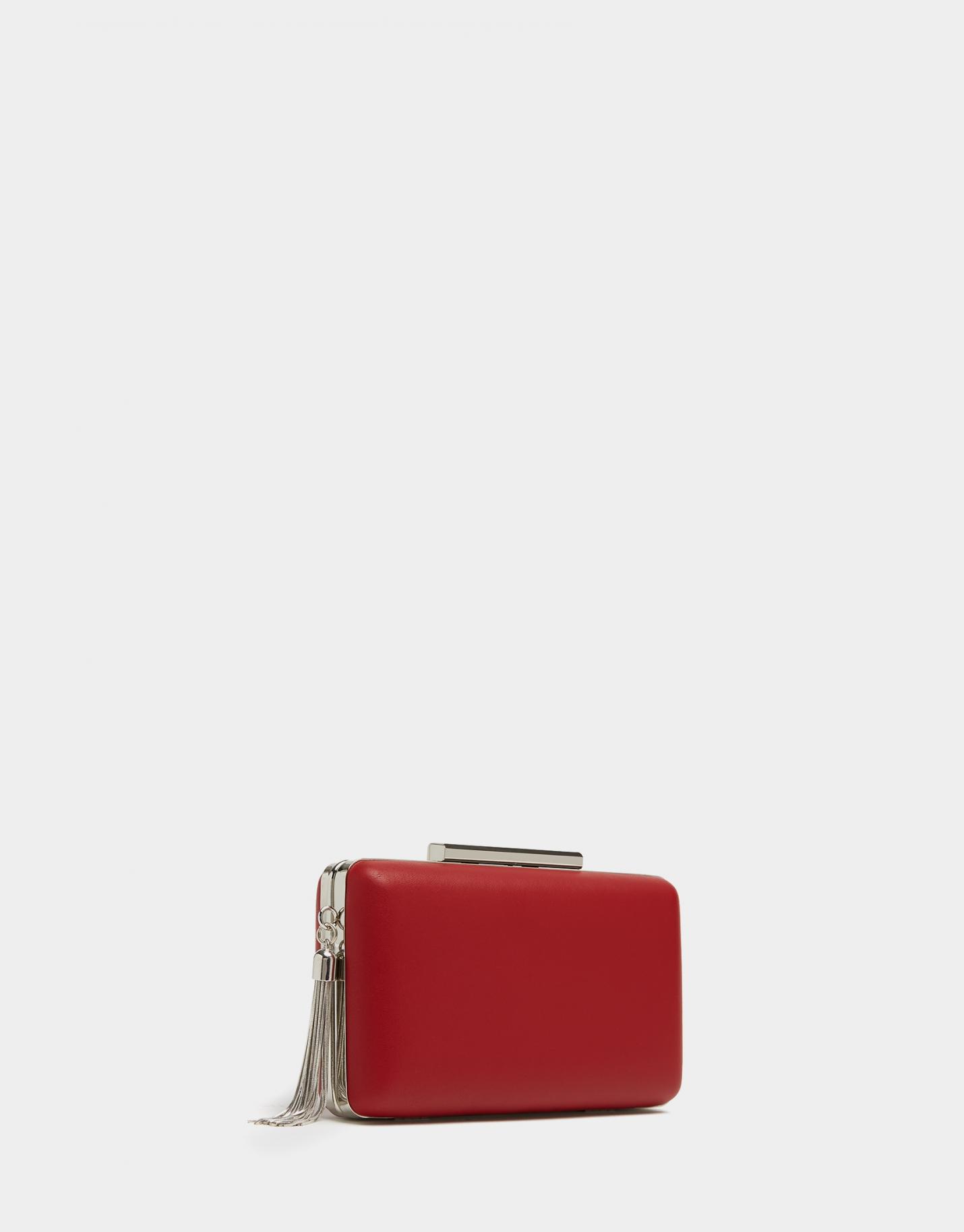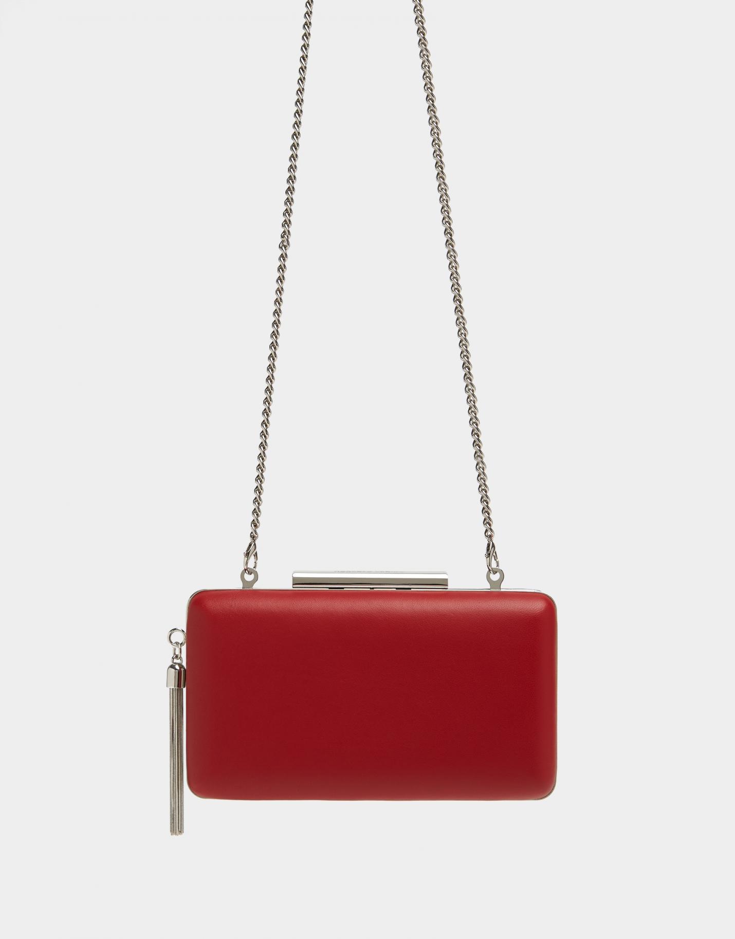 Bolso clutch rígido de forma rectangular en piel color rojo. Cierre metálico a presión con logo grabado, cadena metálica extraíble de 110 cm y borla metálica decorativa. Interior forrado en textil. Medidas 20 cm x 10 cm x 5 cm.