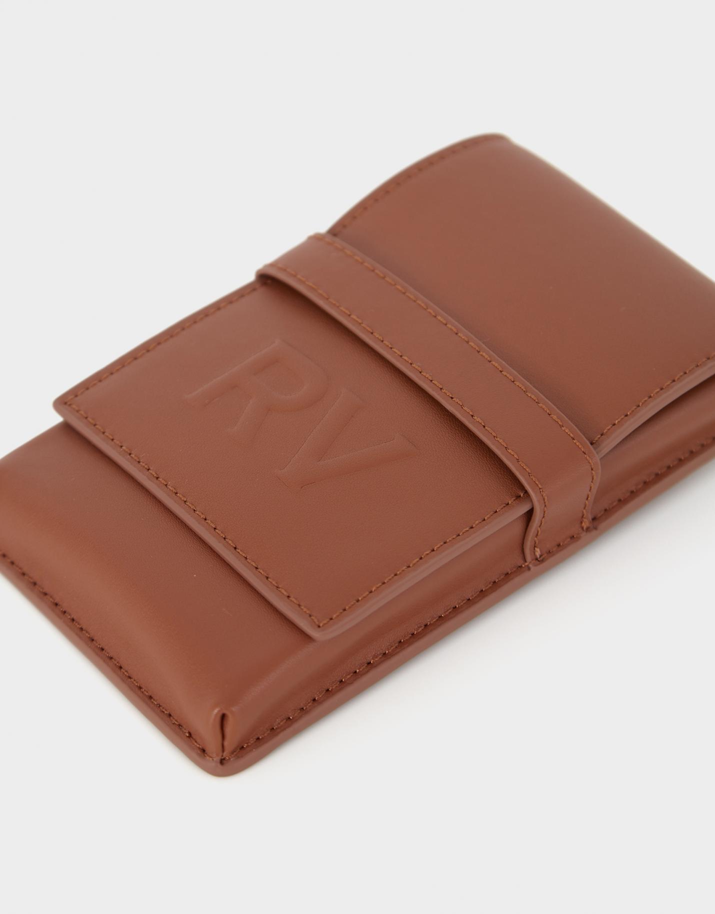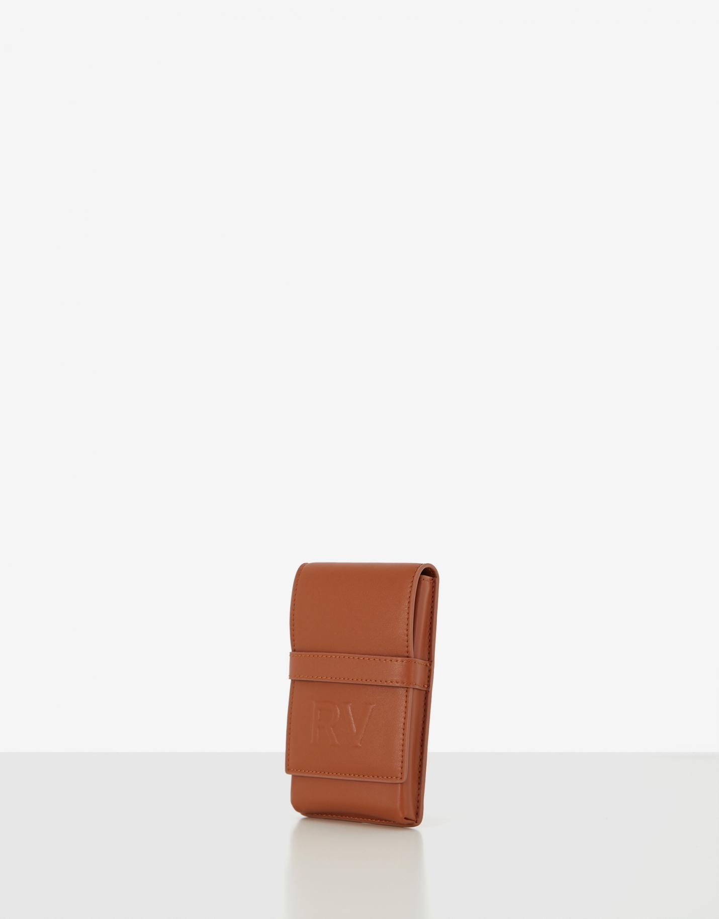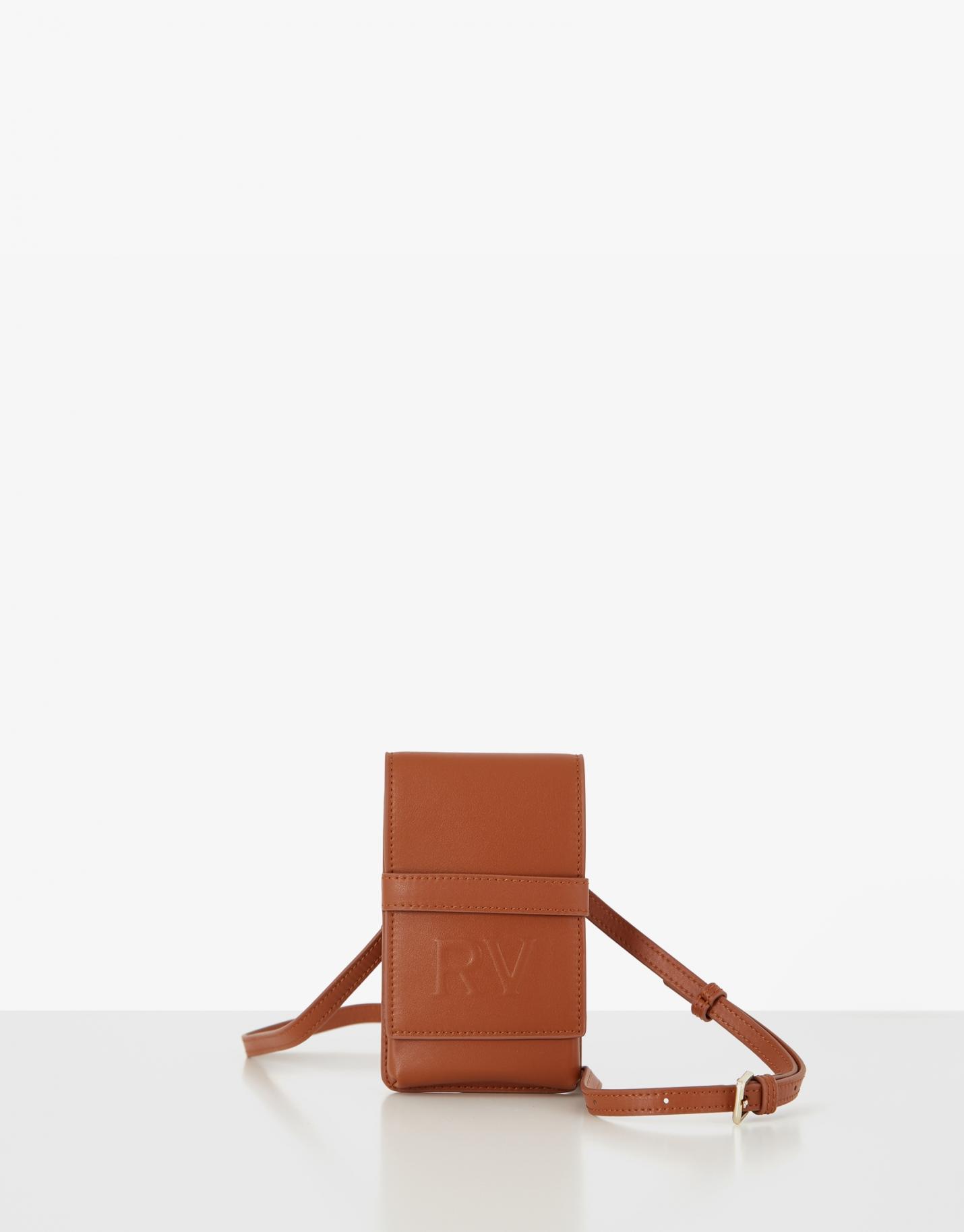 Bolso bandolera para móvil fabricado en piel color cuero con cierre de tapeta y logo en la parte delantera. Construcción semirrígida, asa bandolera regulable y acabados metálicos en oro quiaro. Medidas aproximadas: 10 x 16,5 x 2 cm. Asa regulable: 114 x 1 cm.