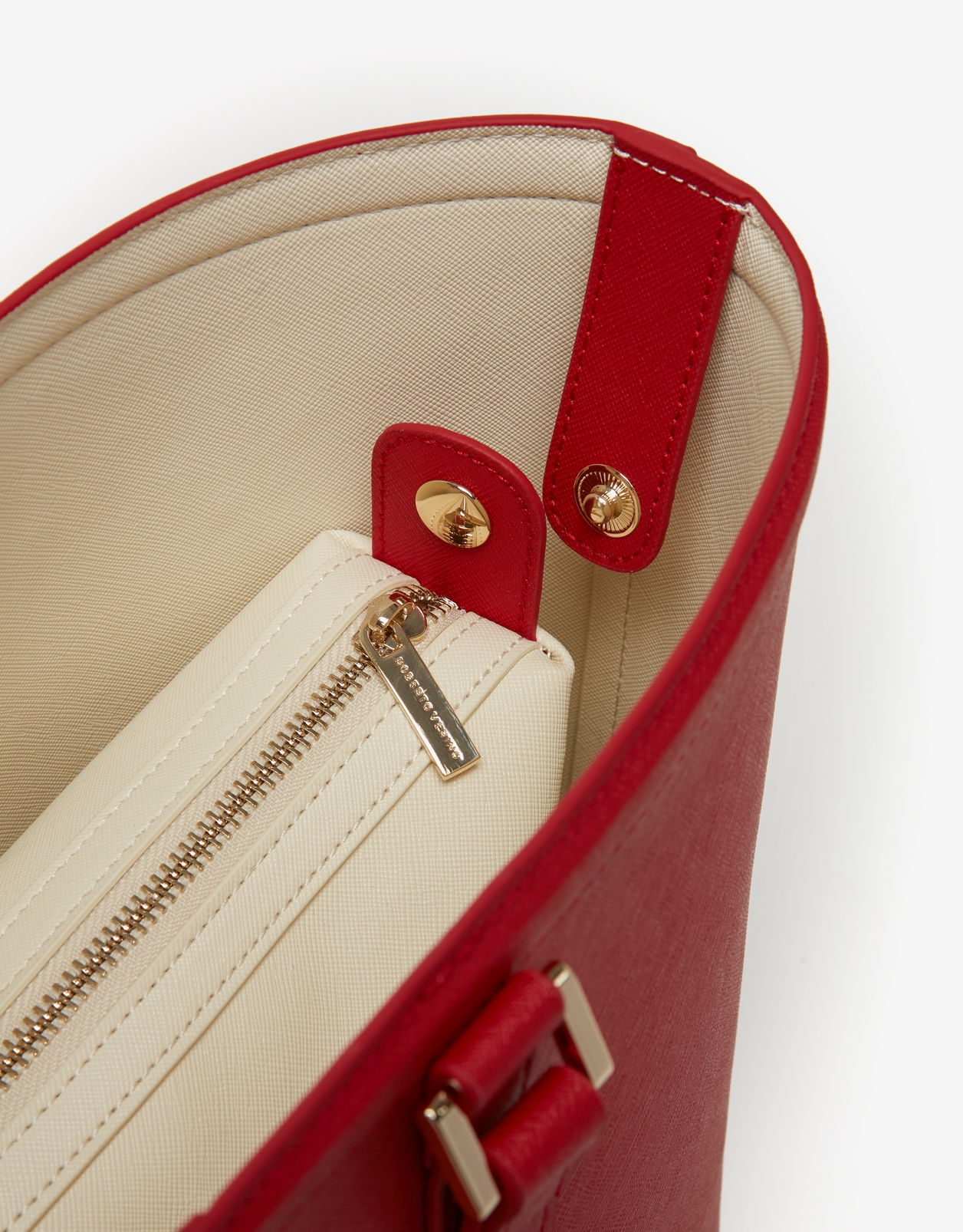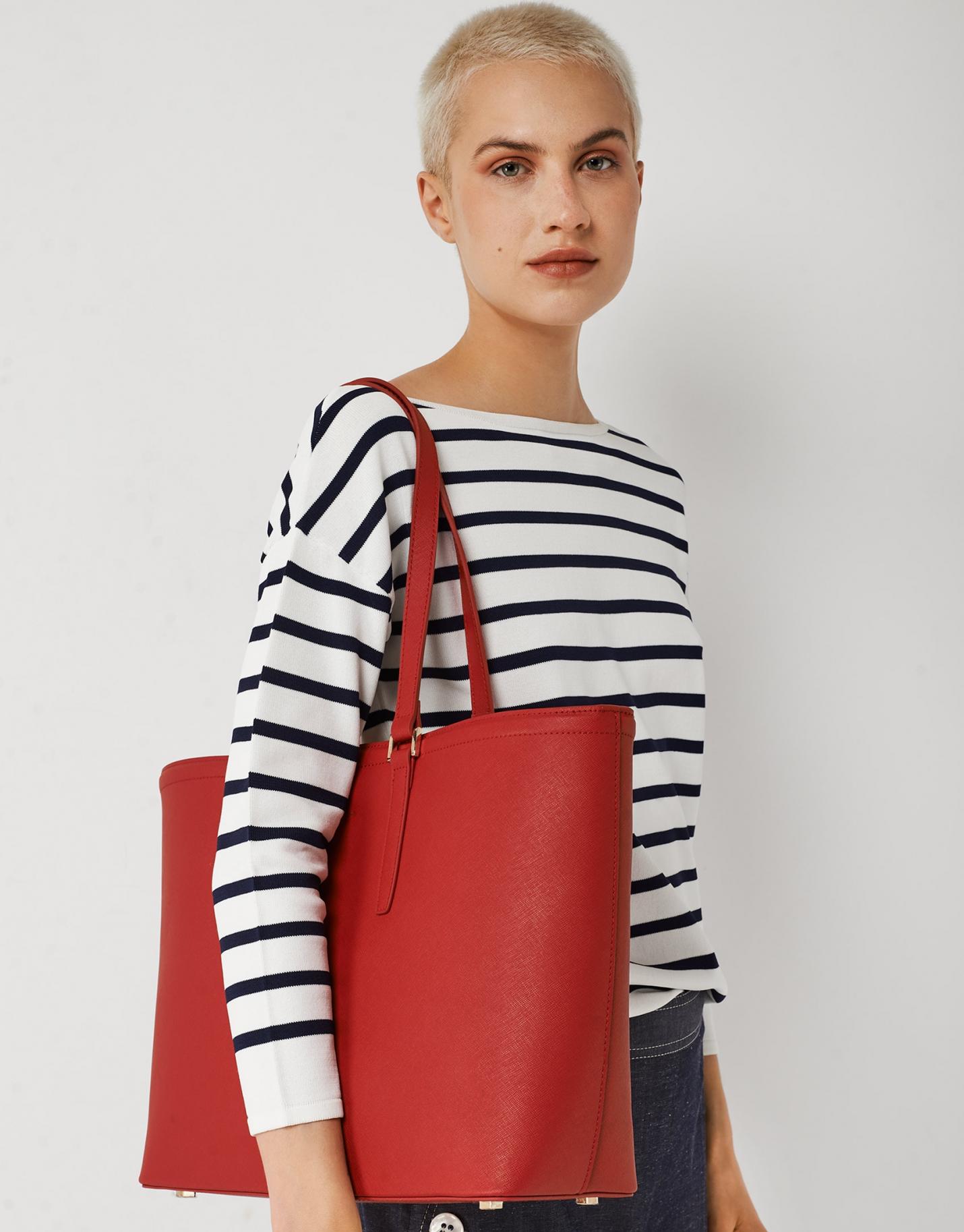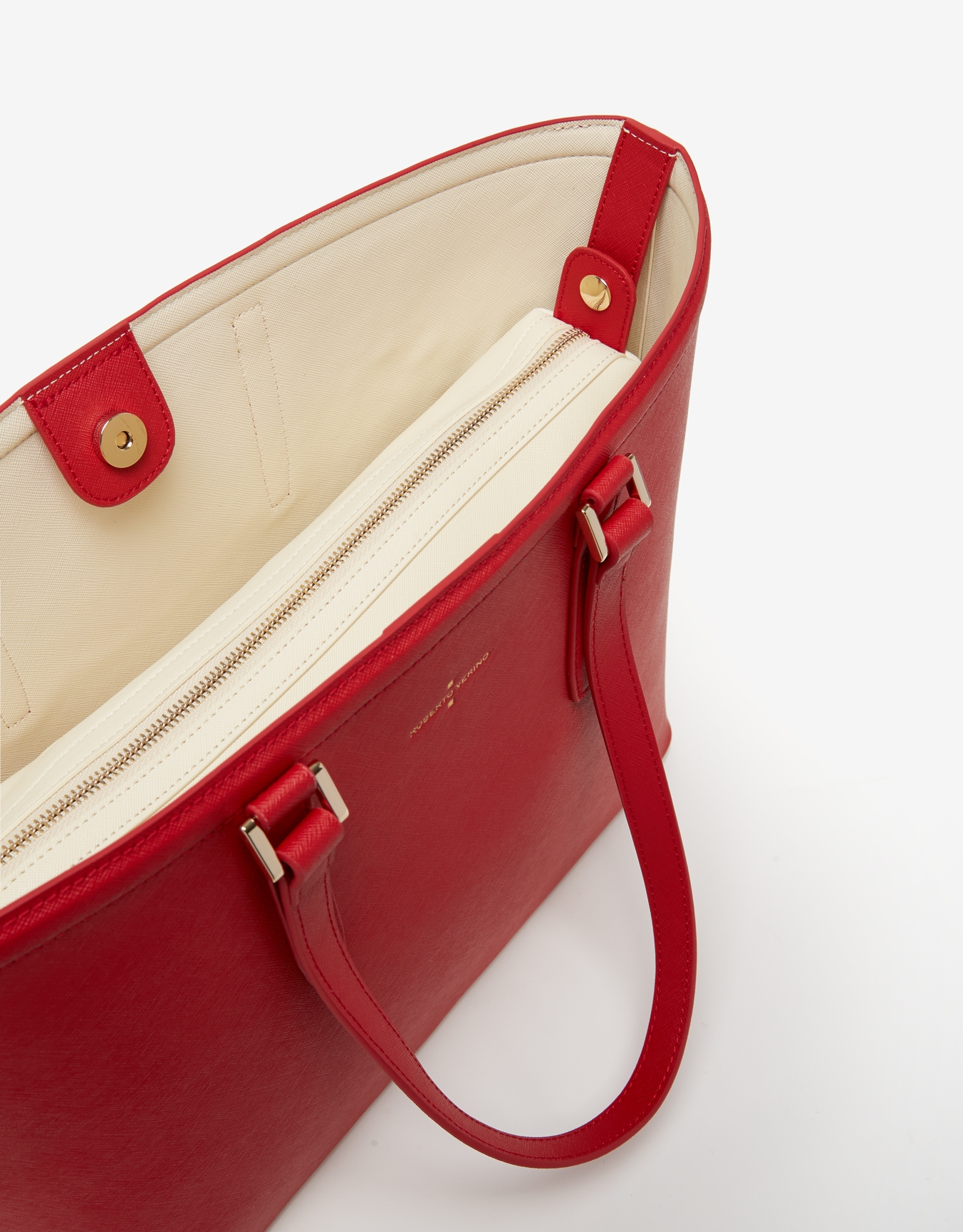 Bolso shopper fabricado en piel tipo saffiano color rojo con interior a contraste en crudo. Construcción semirrígida con cierre de imán y con bolsa interior extraíble, compartimentada y cerrada con cremallera. Acabados metálicos en oro claro y logo grabado en frontal. Medidas: 37 x 30 x 13 cm. Altura asa: 26 cm