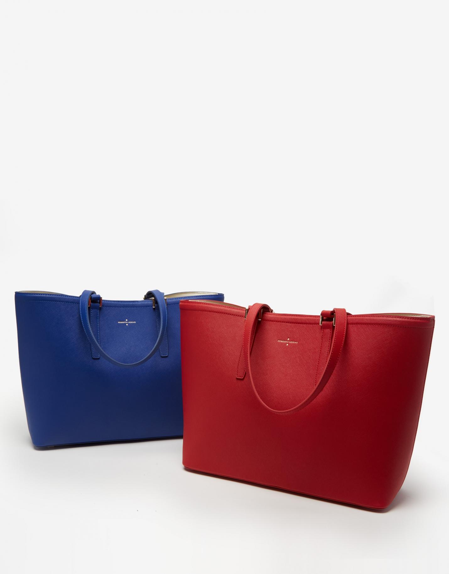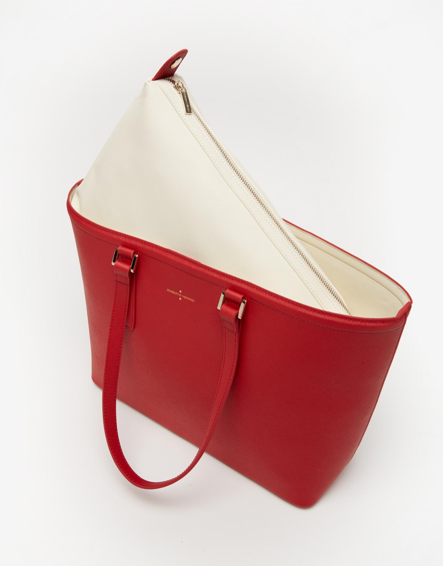 Bolso shopper fabricado en piel tipo saffiano color rojo con interior a contraste en crudo. Construcción semirrígida con cierre de imán y con bolsa interior extraíble, compartimentada y cerrada con cremallera. Acabados metálicos en oro claro y logo gr…