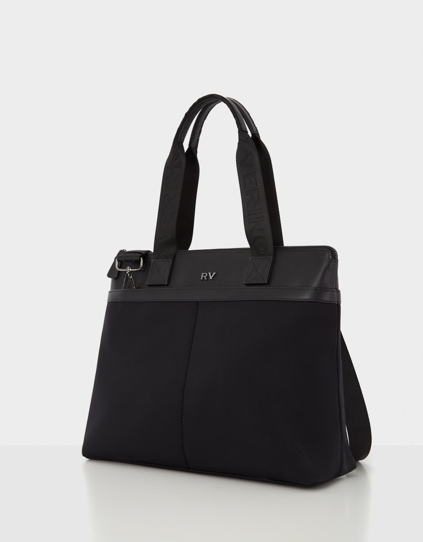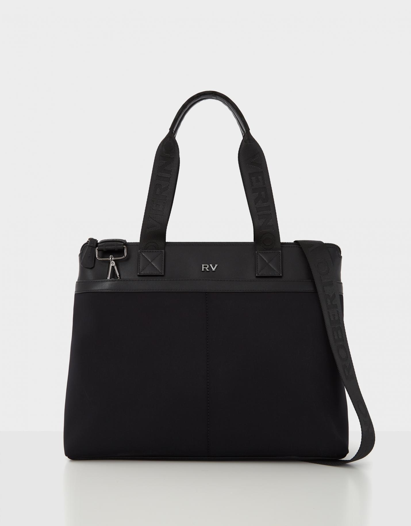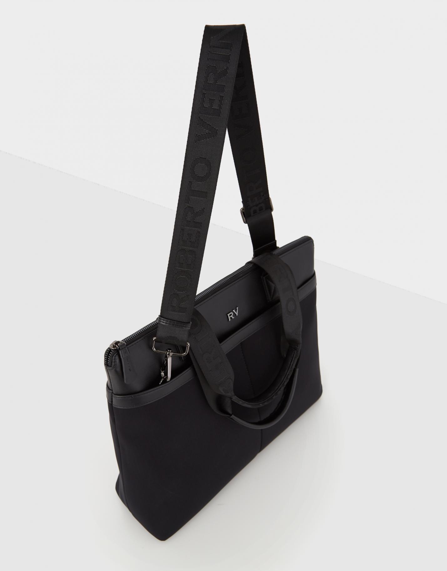 Bolso shopper masculino fabricado en neopreno y piel color negro con cierre superior de cremallera y logo RV en delantero. Dos bolsillos de neopreno con bies de piel en el delantero y en la parte de atrás un bolsillo cerrado con botón magnético. Asas de piel y nastro personalizado y asa bandolera extraíble de nastro personalizado y ajustable, que se engancha mediante mosquetones. Medidas aproximadas: 41 x 30 x 13 cm. Altura asas: 24 cm.