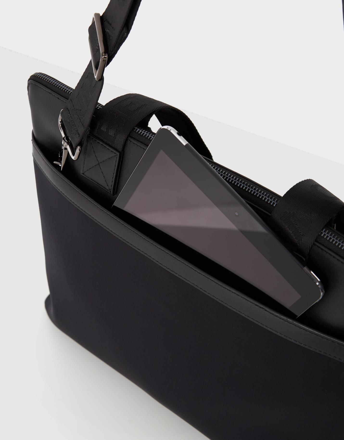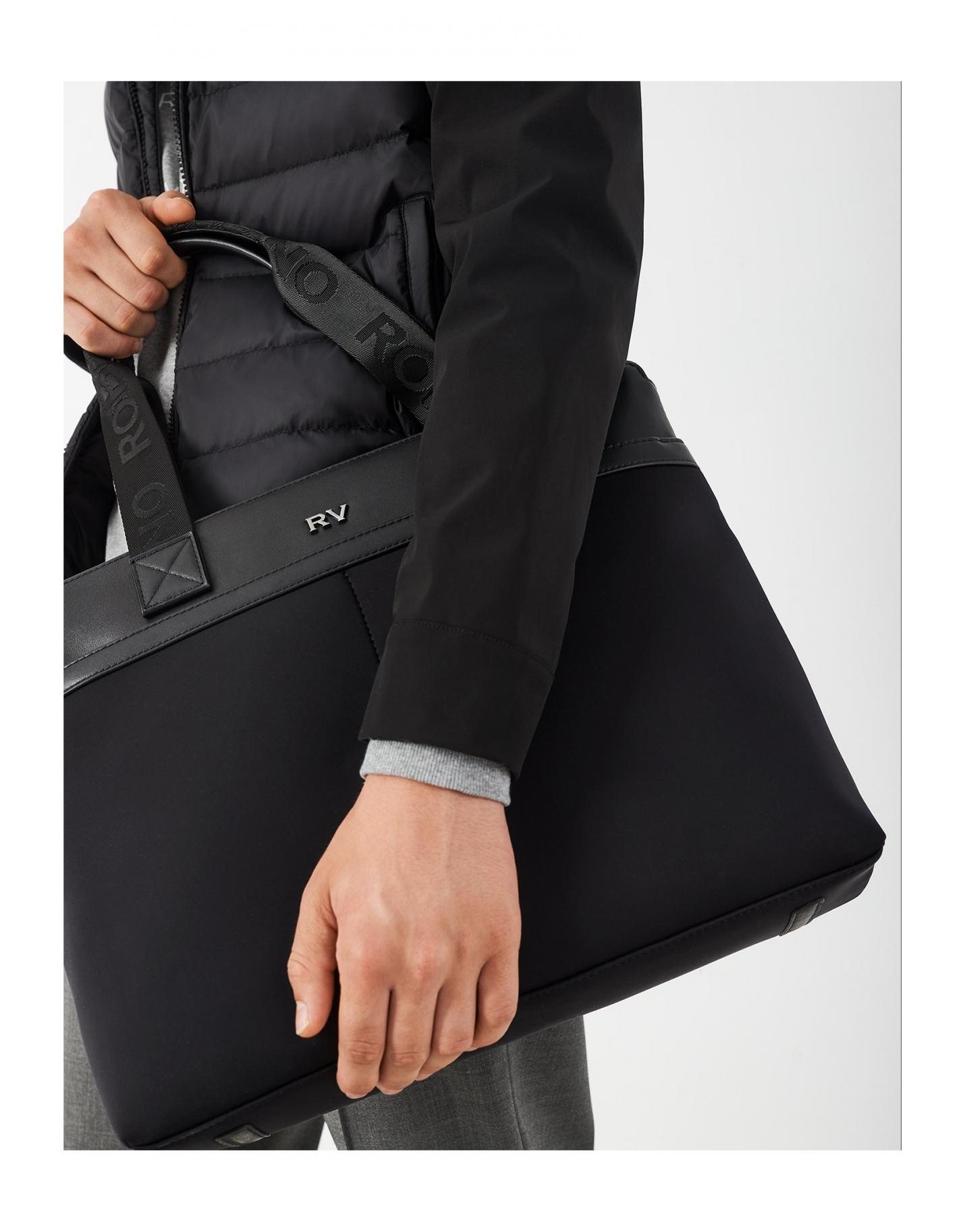 Bolso shopper masculino fabricado en neopreno y piel color negro con cierre superior de cremallera y logo RV en delantero. Dos bolsillos de neopreno con bies de piel en el delantero y en la parte de atrás un bolsillo cerrado con bot…