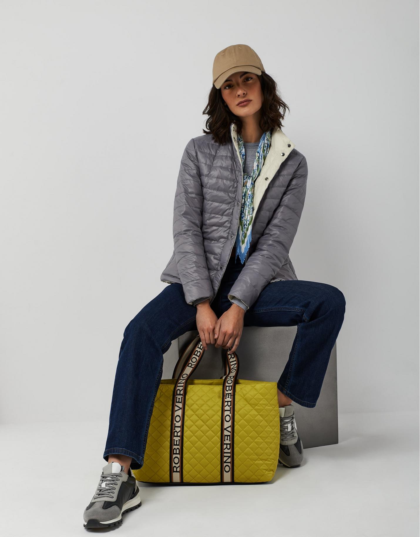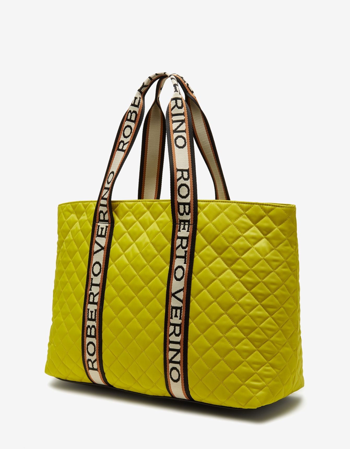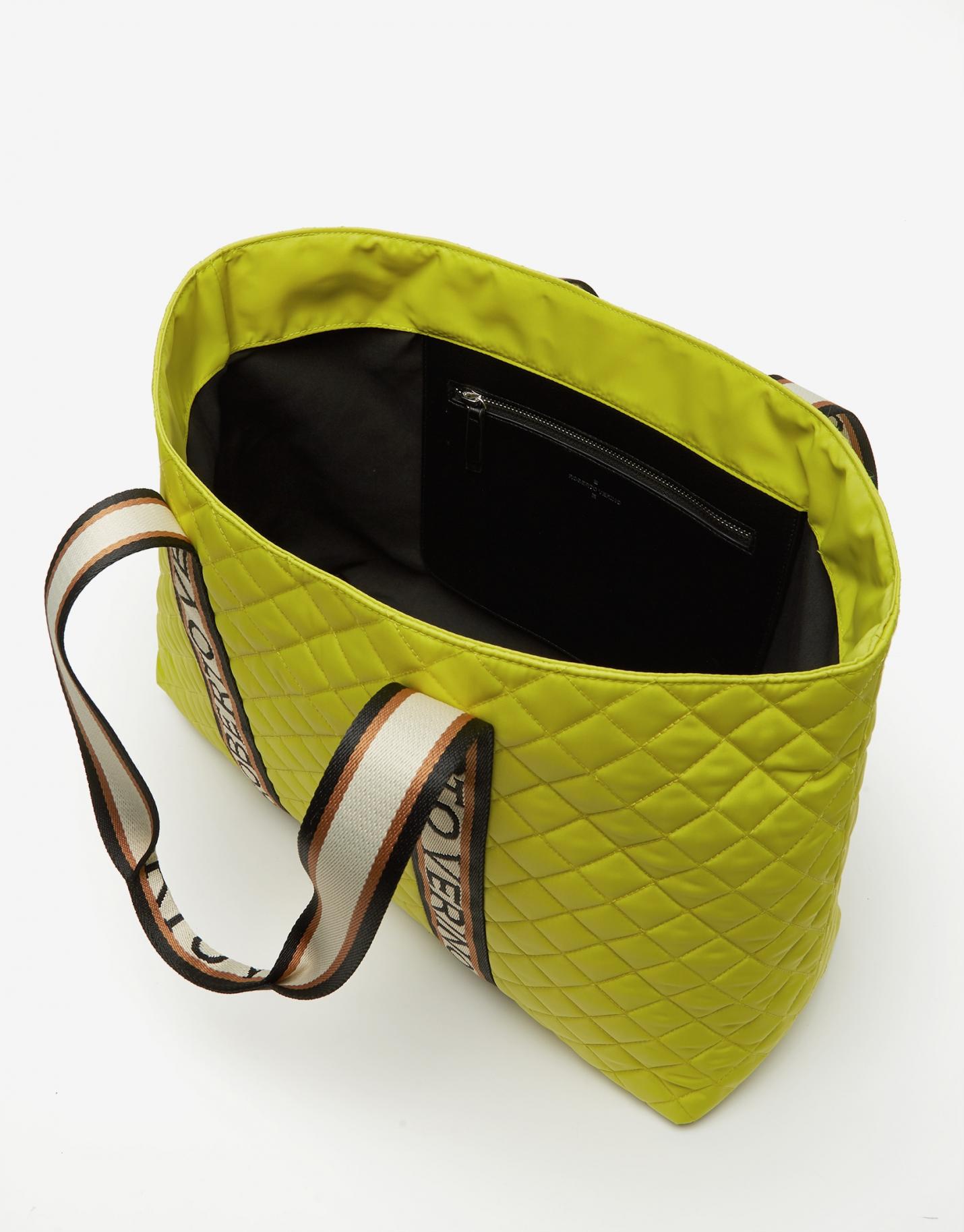 Bolso shopper de construcción soft fabricado en nailon acolchado color lima. Asa de mano con cinta personalizada que continúa en el cuerpo del bolso. Interior forrado y compartimentado. Acabados metálicos plateados. Medidas aproximadas: 42 x 32 x 12 cm. Luz asa: 20 cm